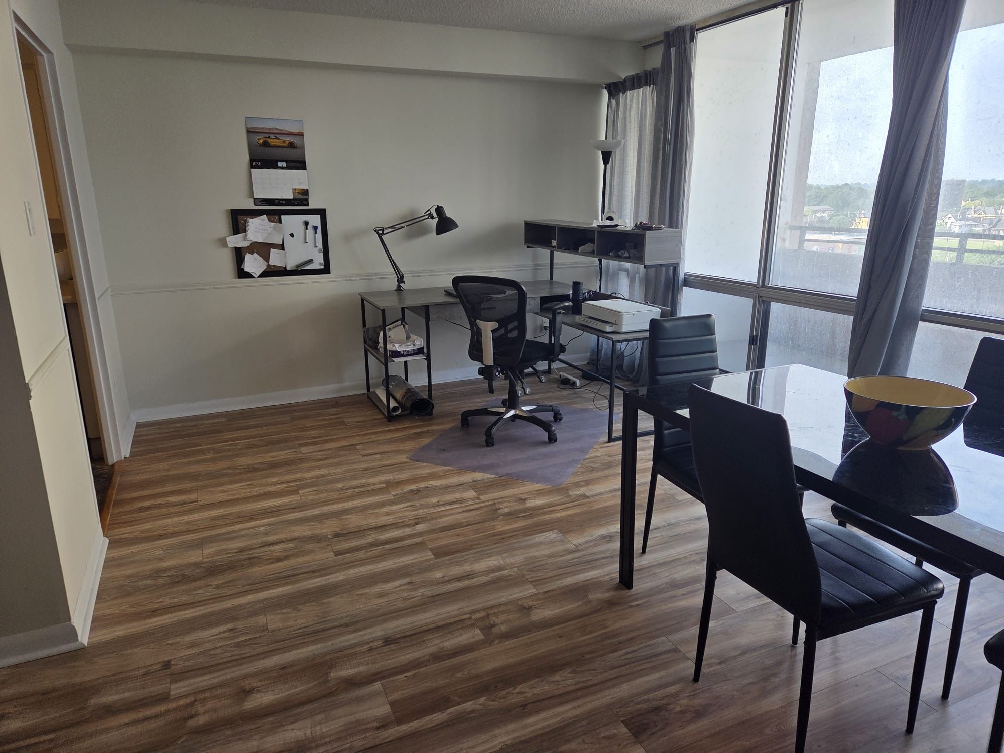 A welcoming, spacious one-bedroom apartment in downtown london, plus a small den/nursery room. New laminate flooring, freshly painted walls, and new kitchen appliances. Renovated bathtub/shower in the bathroom. Led lighting fixtures, multiple storage areas for all your needs. Rent includes most utilities, such as hydro, heat, water, and high-speed internet vip cable. Convenient access to building facilities, including the newly renovated pool, sauna, gym, and library. One underground parking space is included. The apartment is partially furnished with a dining table and chairs, a study desk, a double-size bed with a mattress, and portable light fixtures.