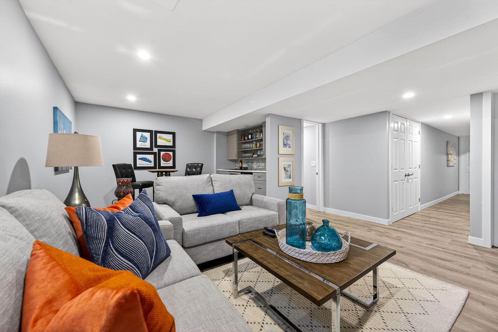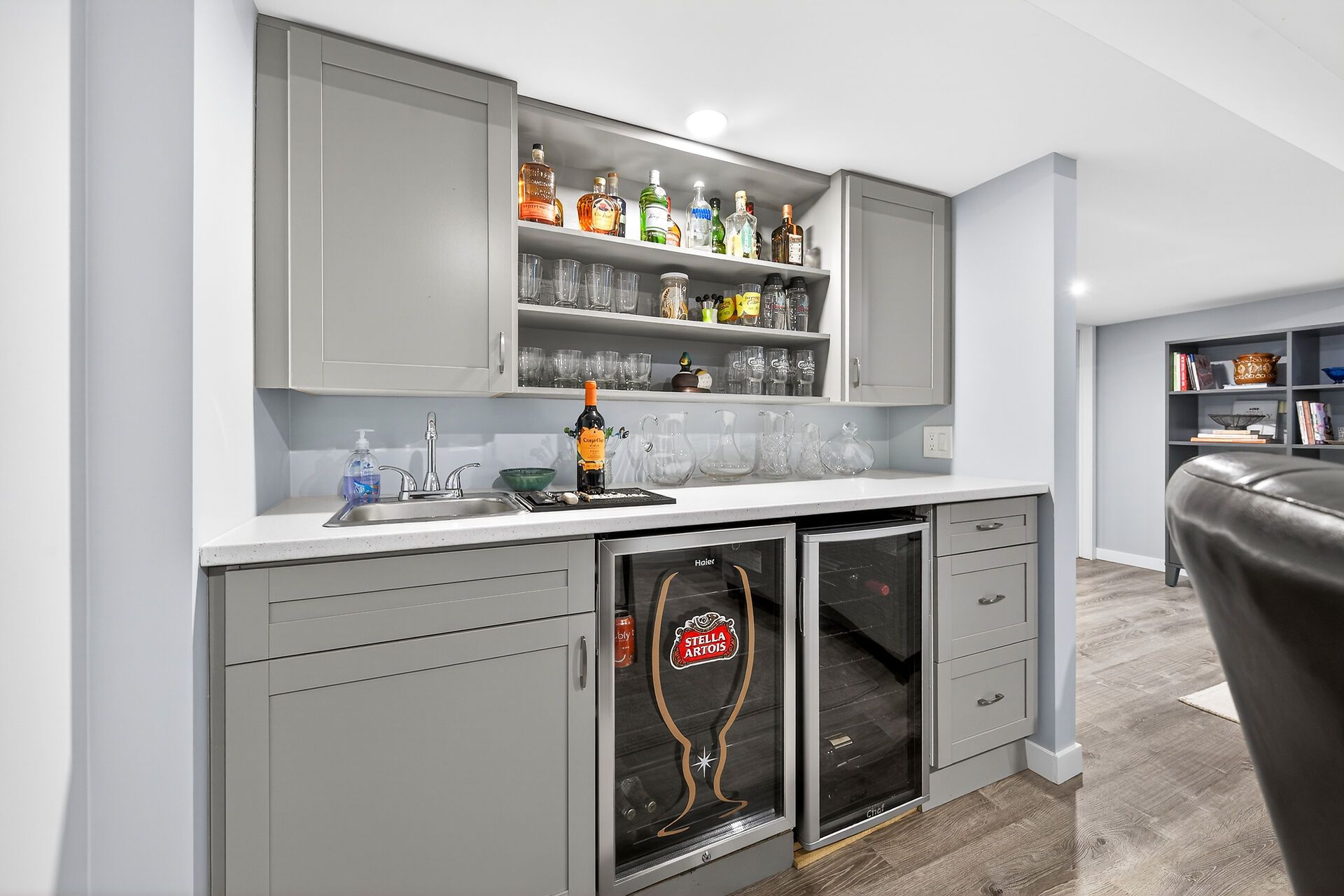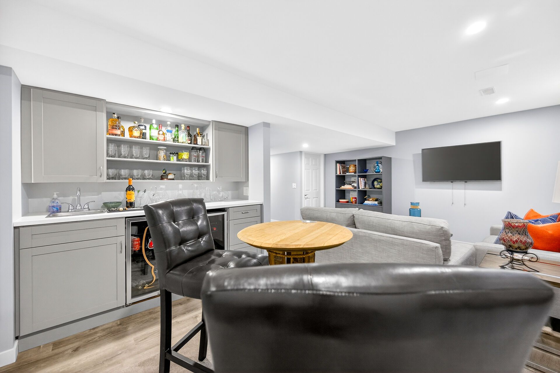 • Lower-level retreat with wet bar and built-in cabinets for entertainment.