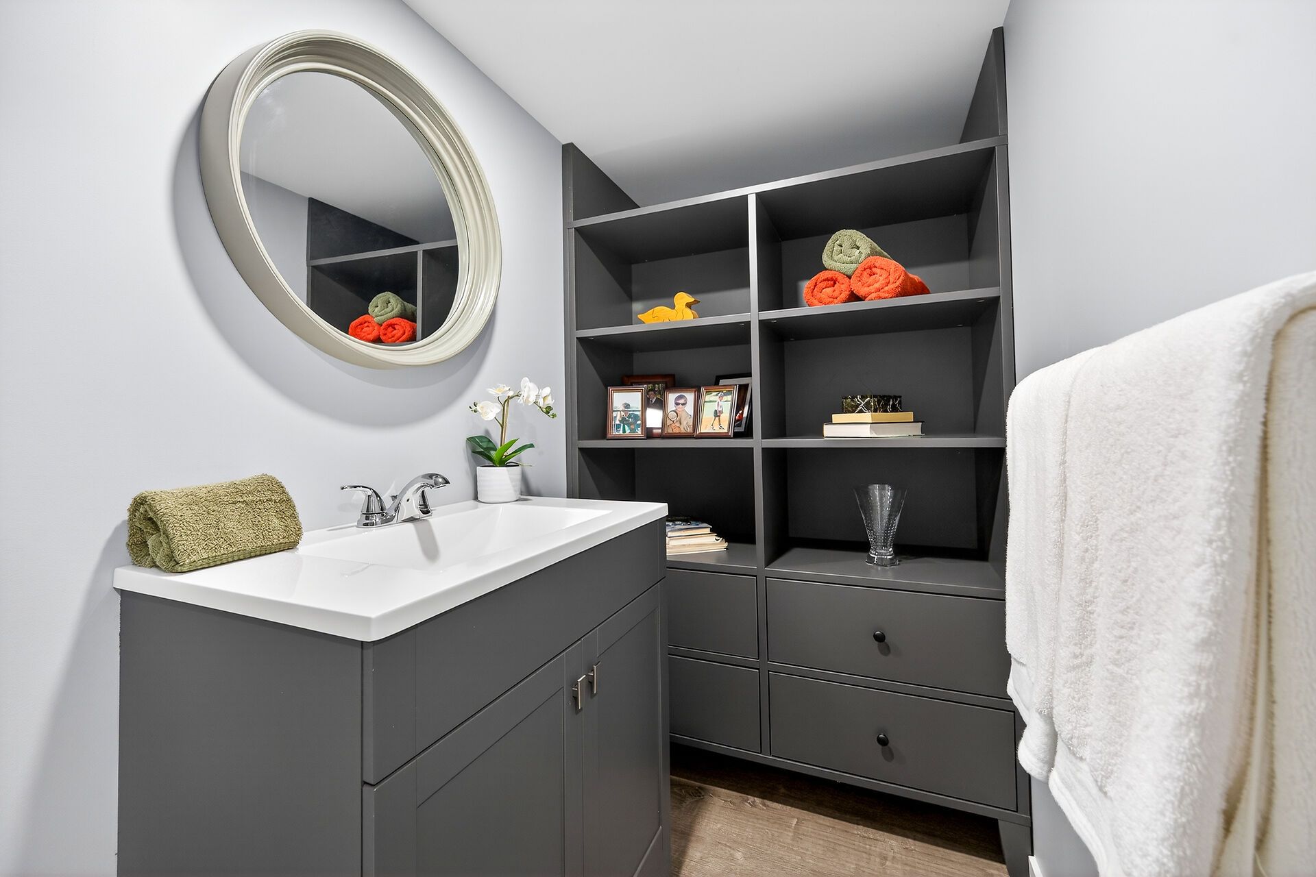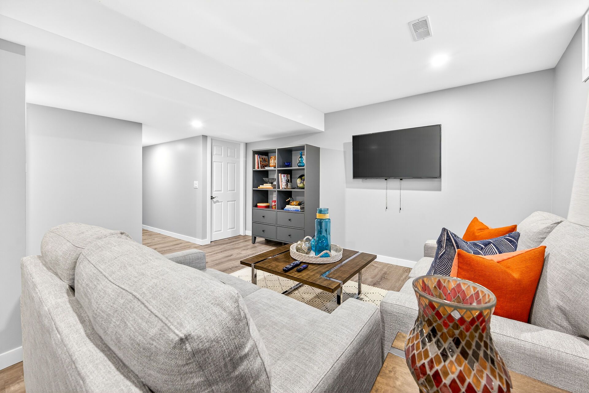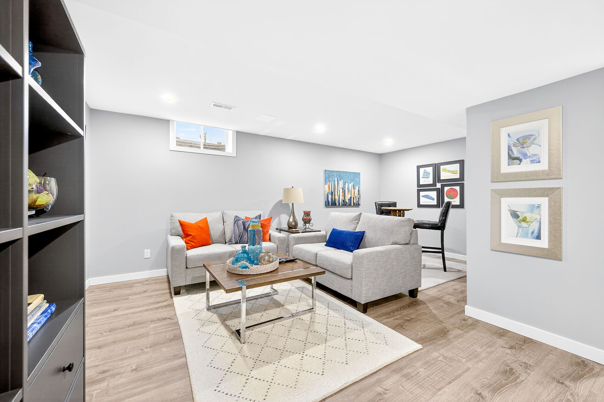 • Lower-level retreat with wet bar and built-in cabinets for entertainment.