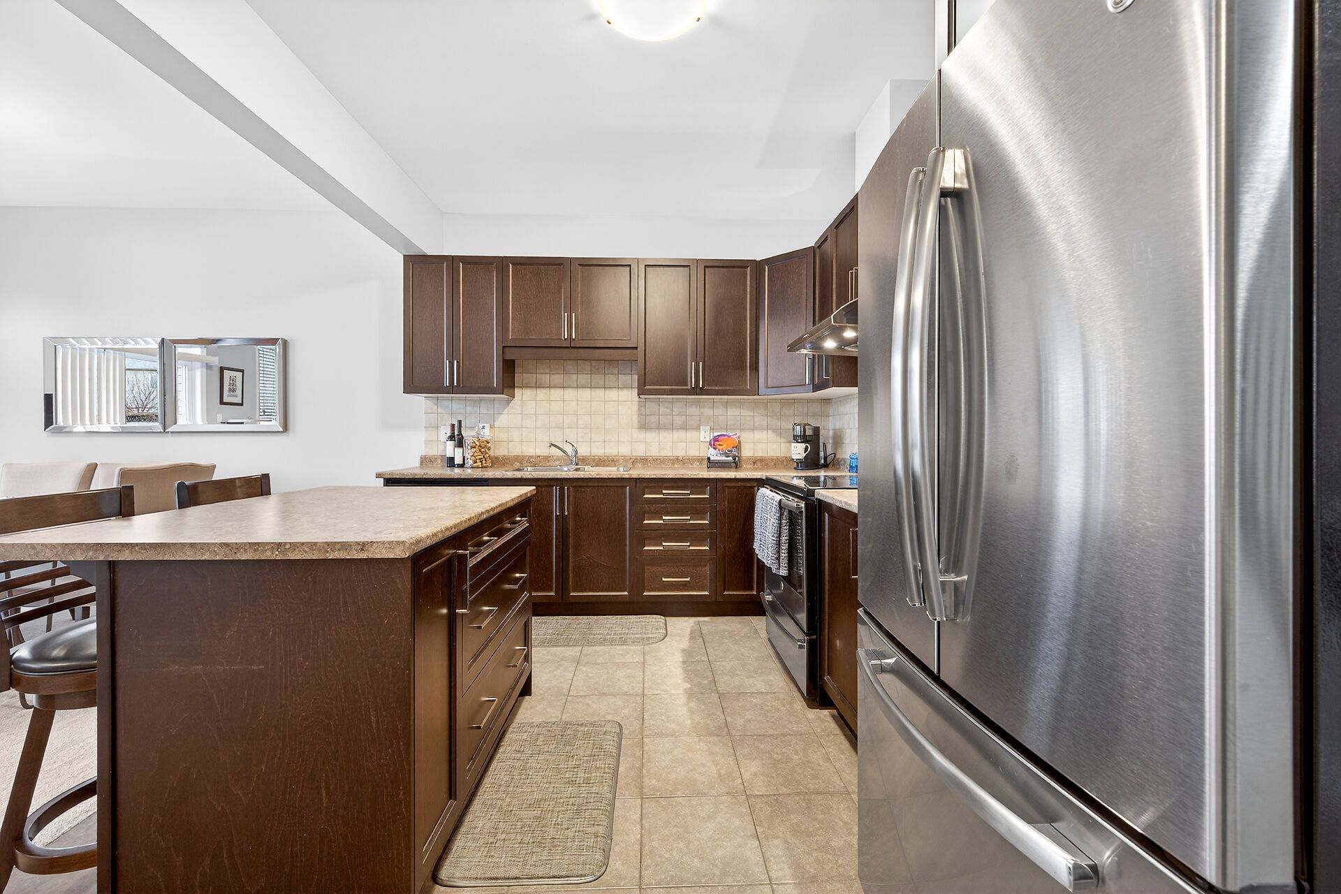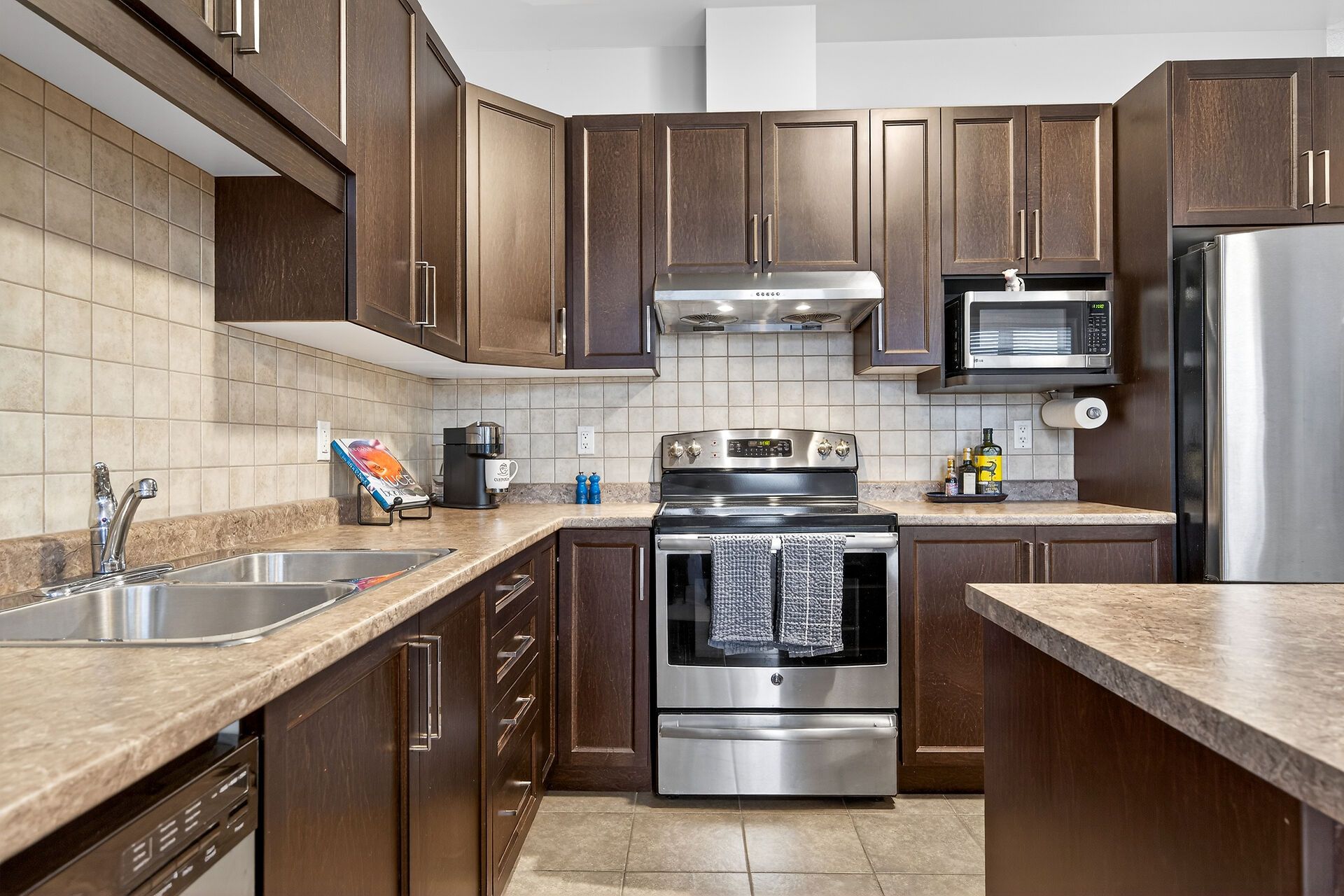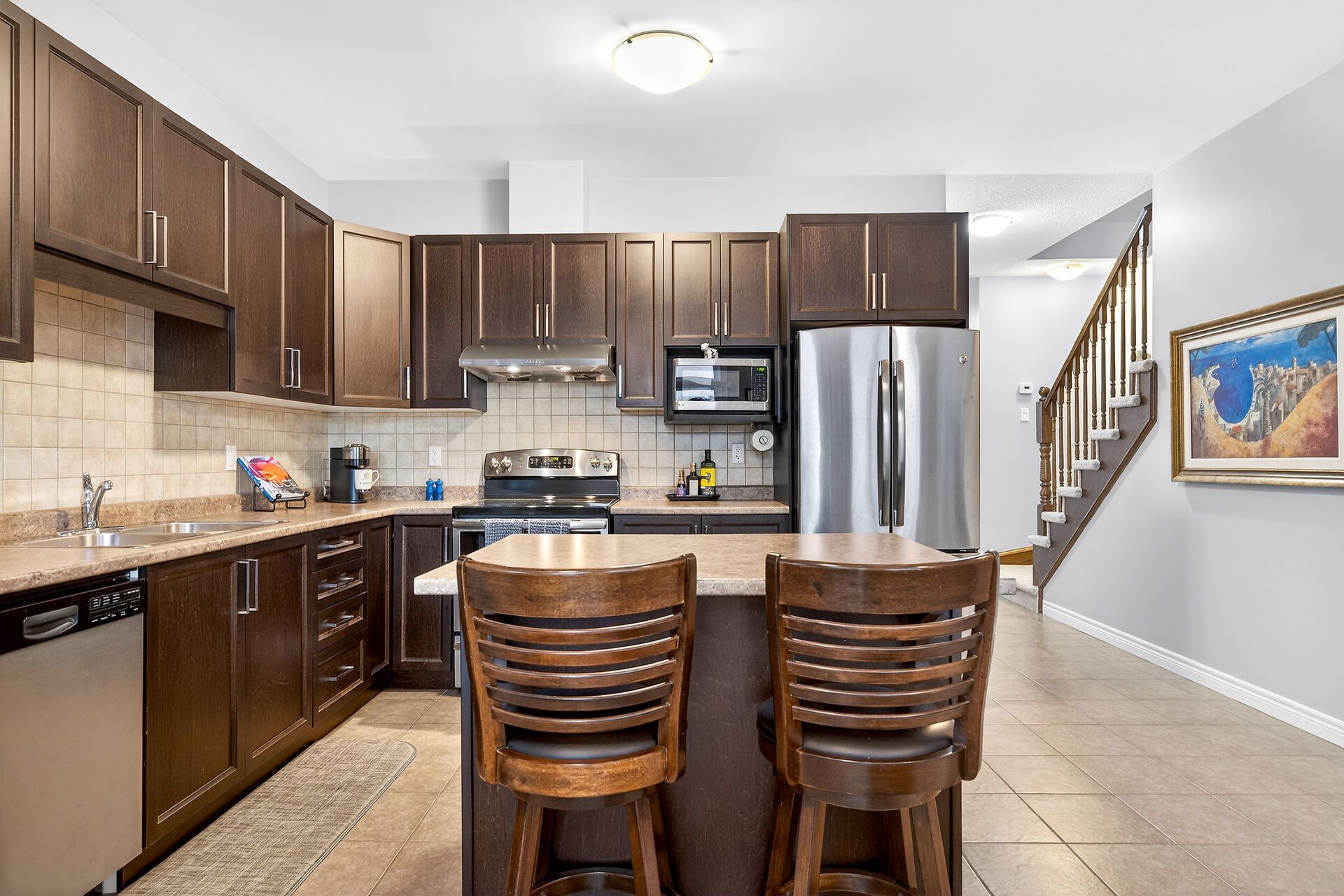 • Beautiful kitchen with appliances and an island for cooking.