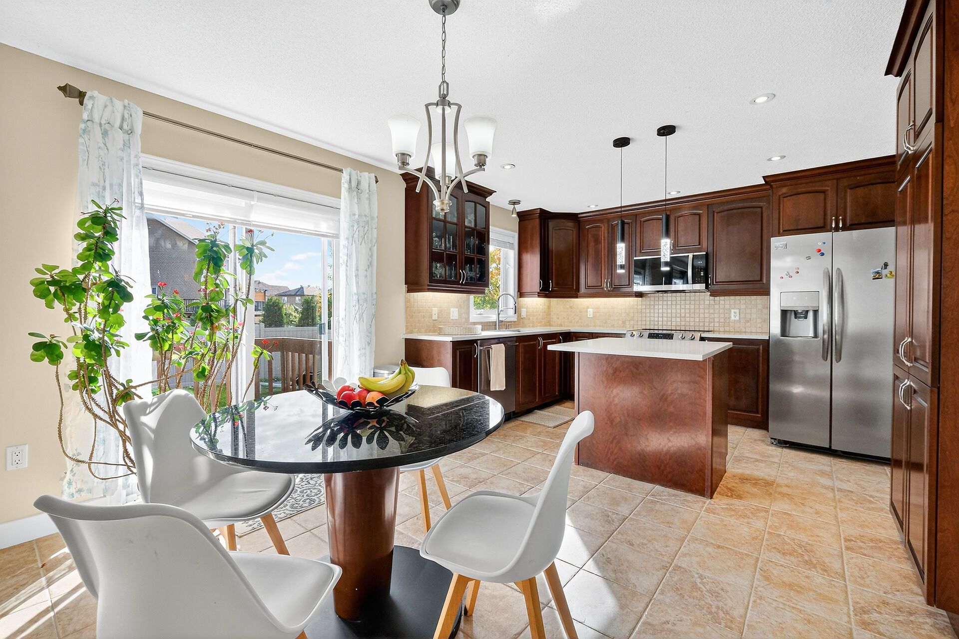 • Modern kitchen leads to a bright family room with a cozy fireplace.
