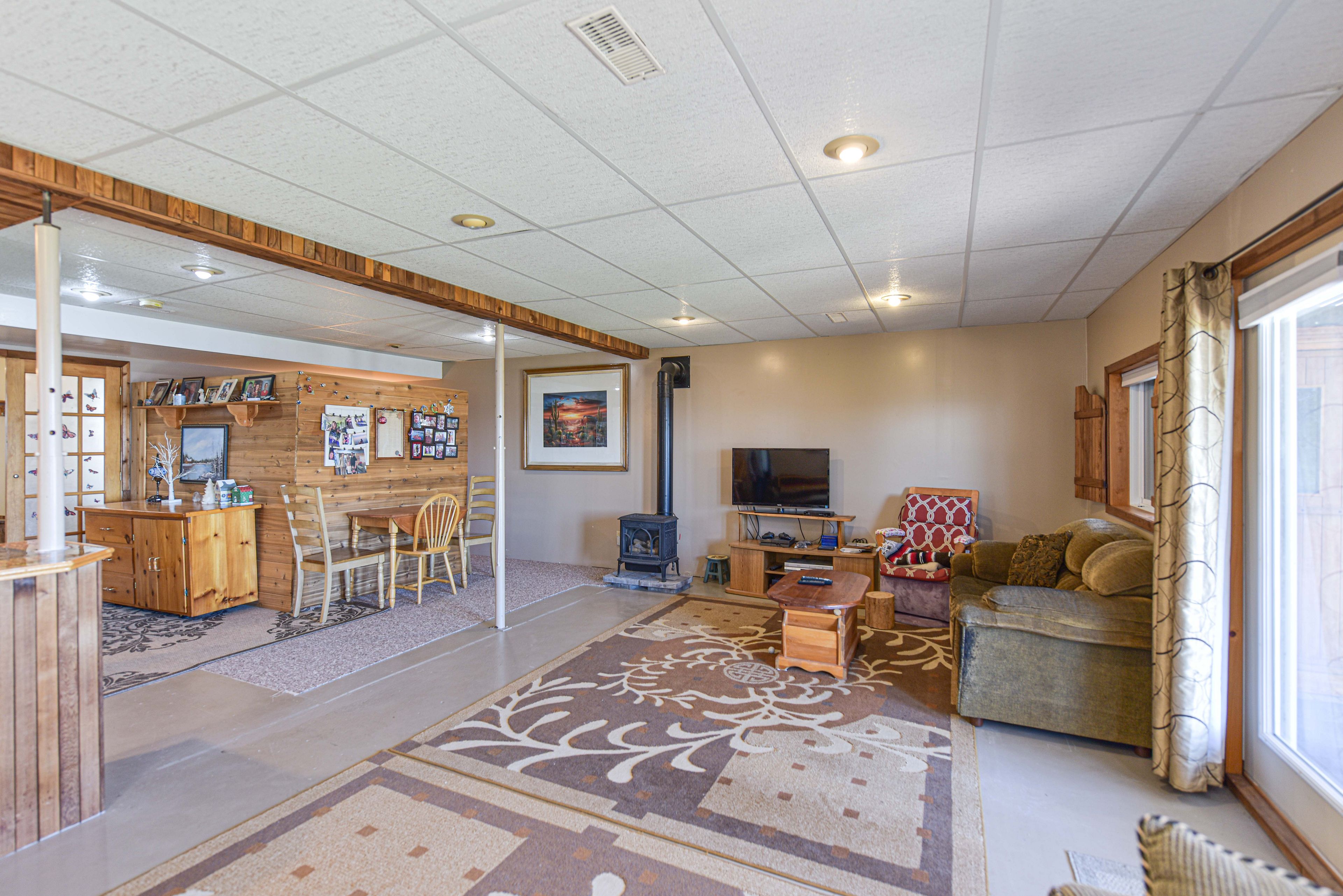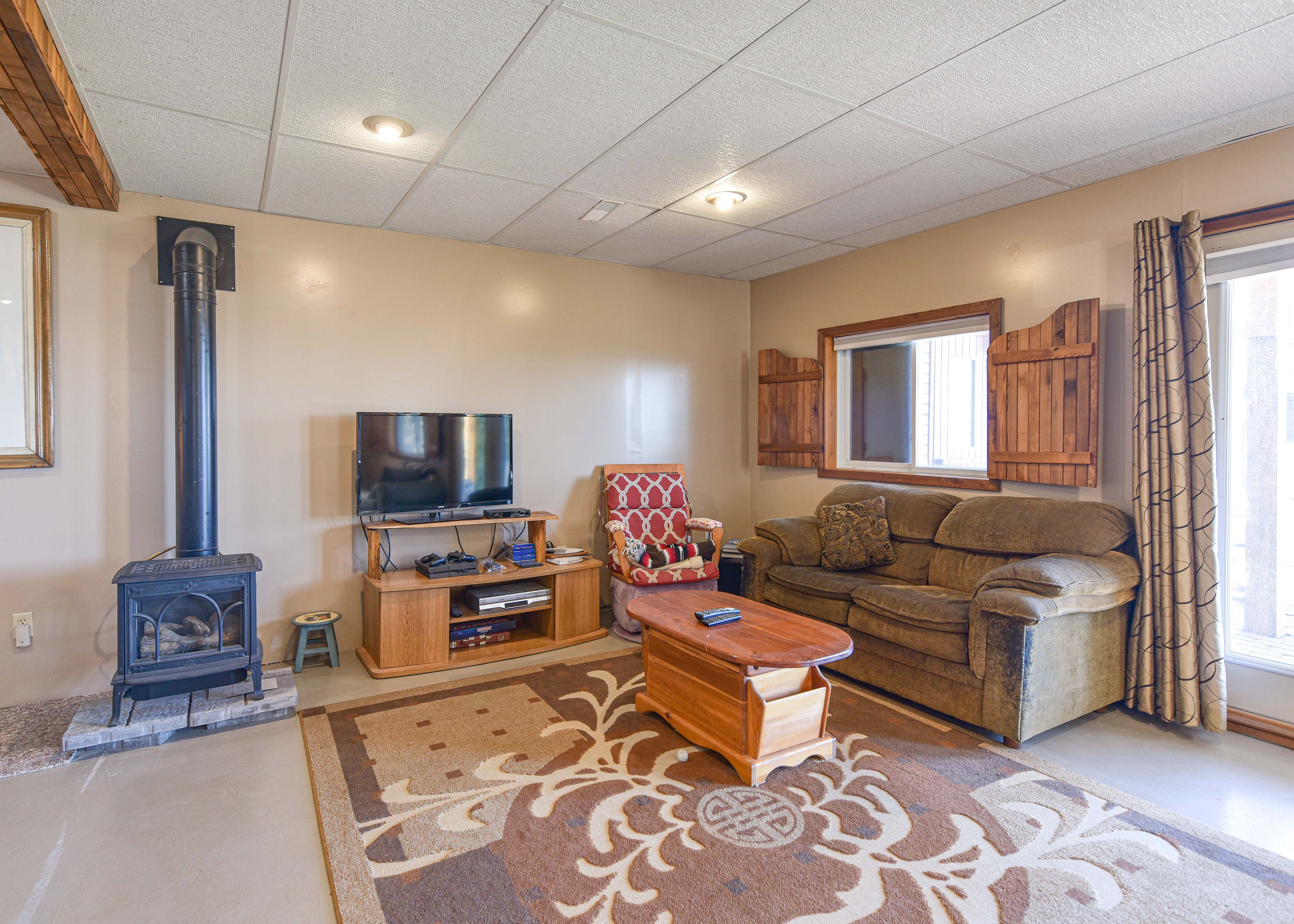• Spacious living room features a cozy fireplace and large windows for lake views.