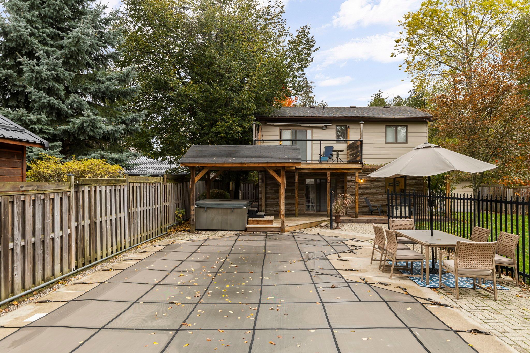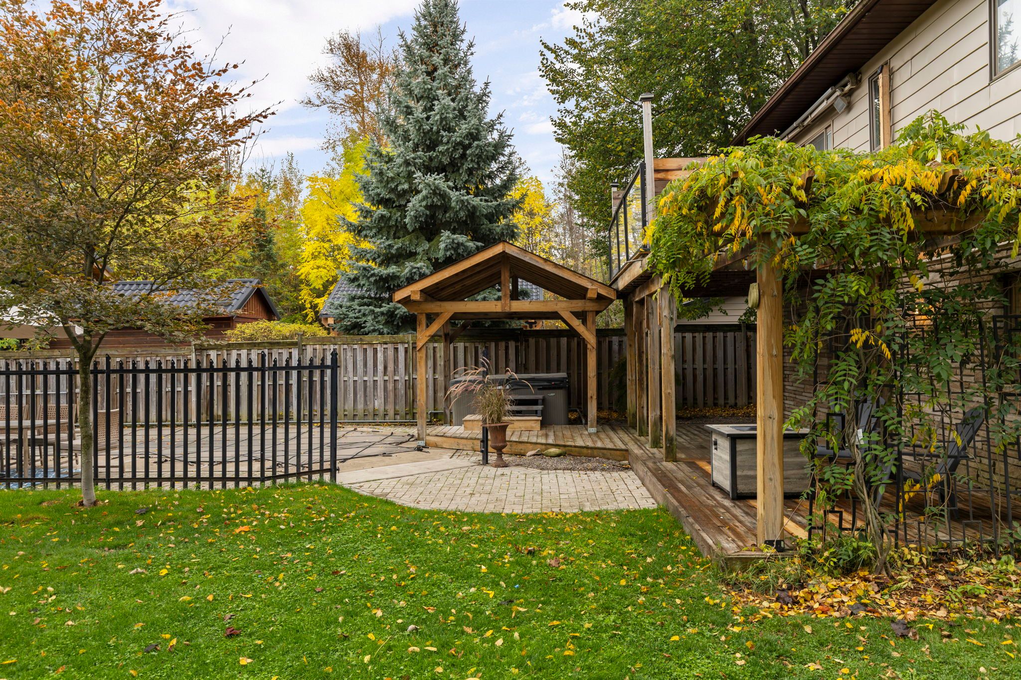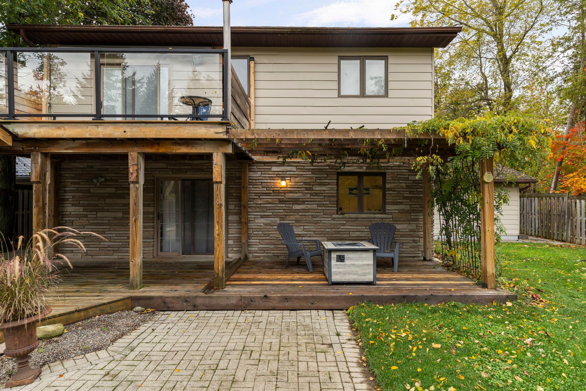 Tucked into a quiet, family-friendly neighbourhood that feels more country than city, this well-cared-for home offers a rare blend of privacy, space, and proximity to the water. Set on a beautifully landscaped lot with mature trees and extensive perennial gardens, the backyard is a true urban oasis, complete with an in-ground pool, natural gas heater, hot tub with enclosure, pergola-covered deck, and plenty of room to entertain or relax in total privacy. Inside, the home is thoughtfully laid out with generous spacing across every level, creating a comfortable flow for everyday living. The living room serves as the heart of the home, highlighted by a soaring ceiling, abundant natural light, and an electric fireplace that adds warmth and character. The kitchen has been refreshed with updated cabinetry, backsplash, lighting, and newer appliances, while cornice moulding and updated flooring add subtle elegance throughout. The primary bedroom offers a peaceful retreat, featuring a charming private deck overlooking the backyard, ideal for morning coffee or quiet evenings. Additional updates include a professionally painted interior in 2025, modernized lighting with added pot lights, a barn door accent to the primary ensuite, and updated deck railings. Major mechanical and structural improvements provide peace of mind, including a furnace (2015), air conditioner (2015), hrv system (2015), 200-amp electrical service, and a roof replaced in 2018. A large driveway with parking for up to 10 vehicles adds everyday convenience. Located within walking distance to tollendale park, the gables trail, schools, and the waterfront, and just minutes to beaches, the marina, downtown, shopping, and highway access, this is a home that supports both lifestyle and location. A welcoming space filled with family memories, summer entertaining, and natural beauty, ready for its next chapter.