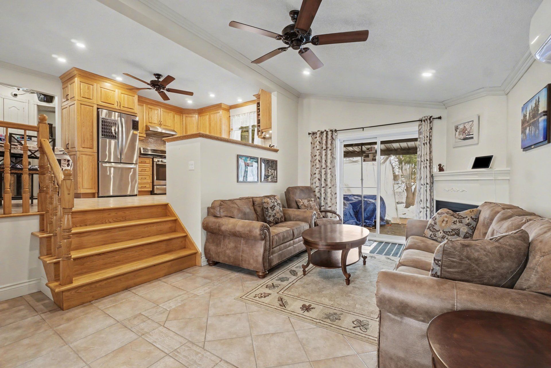 • Cozy living area with a gas fireplace and direct patio access.