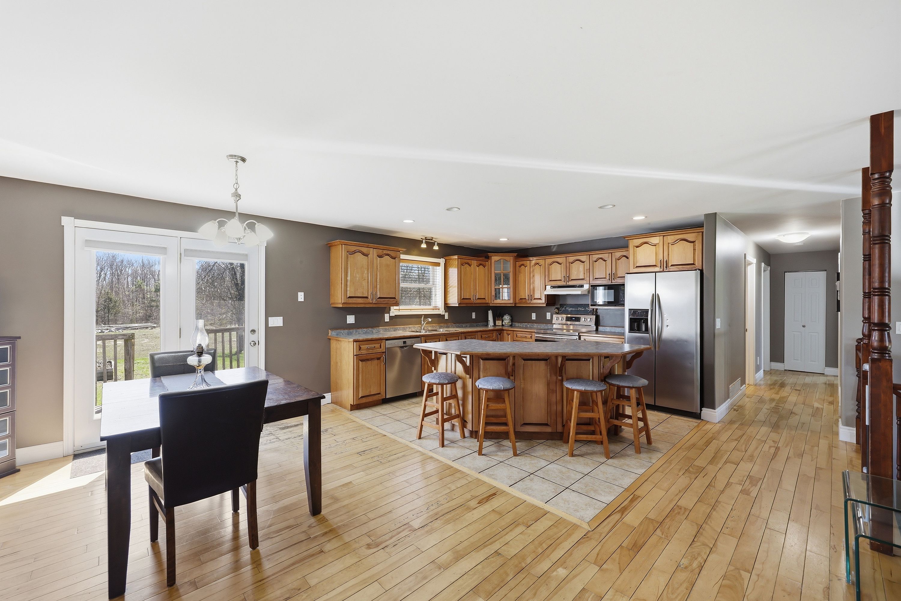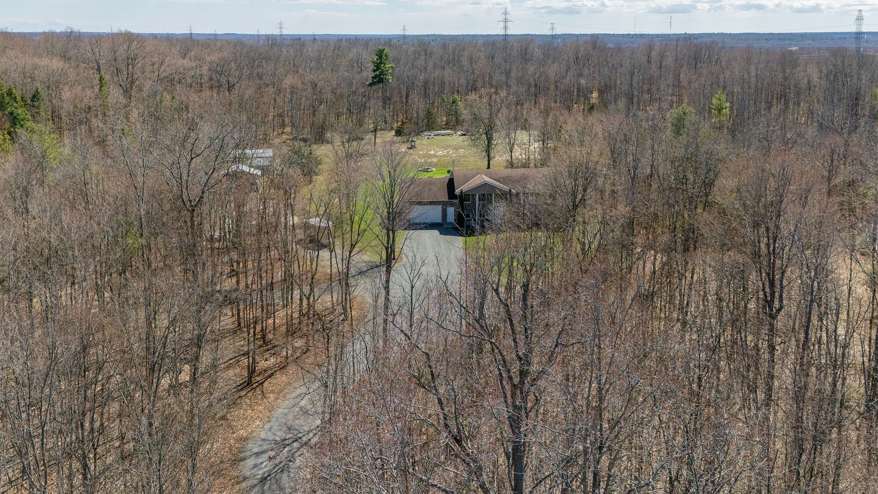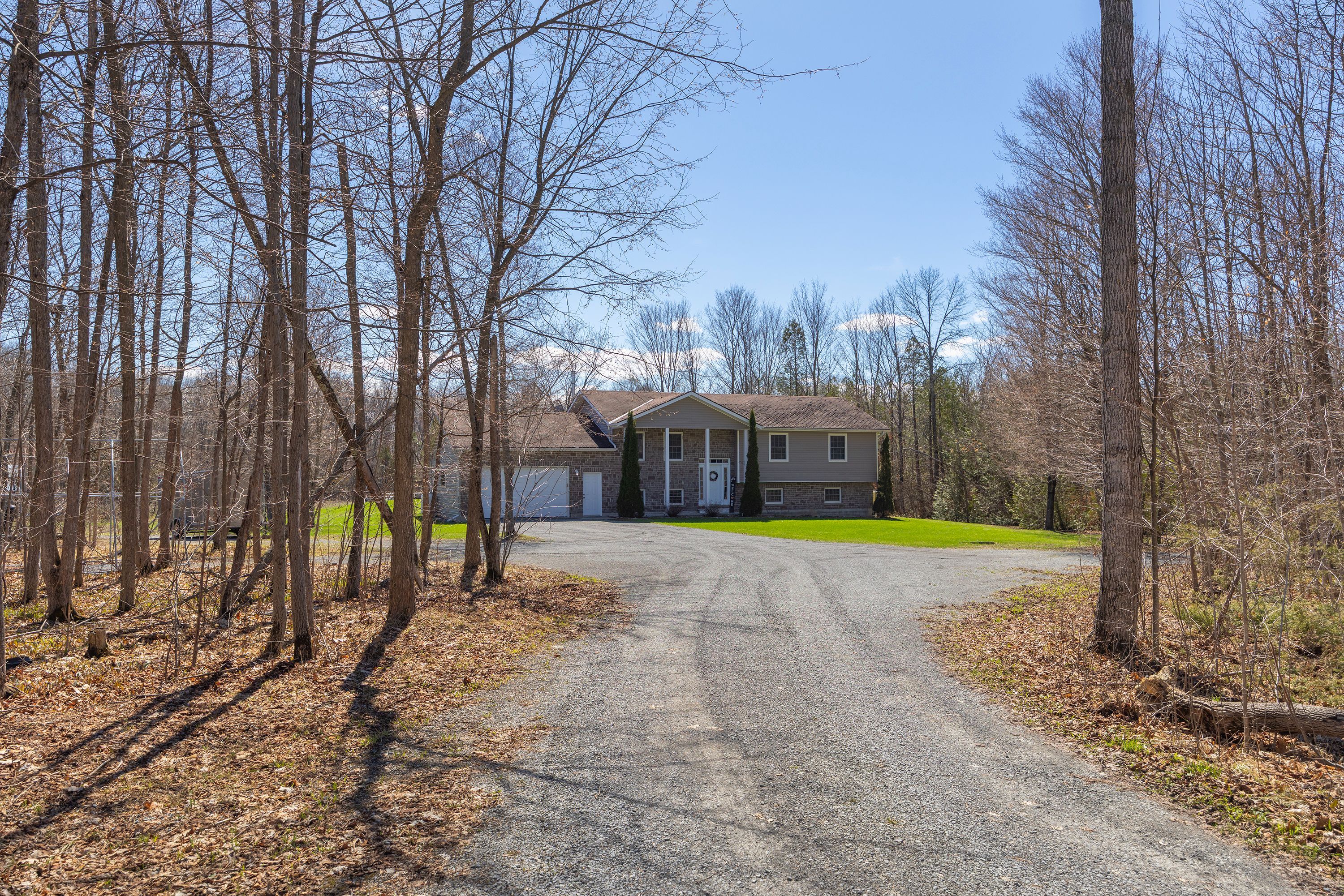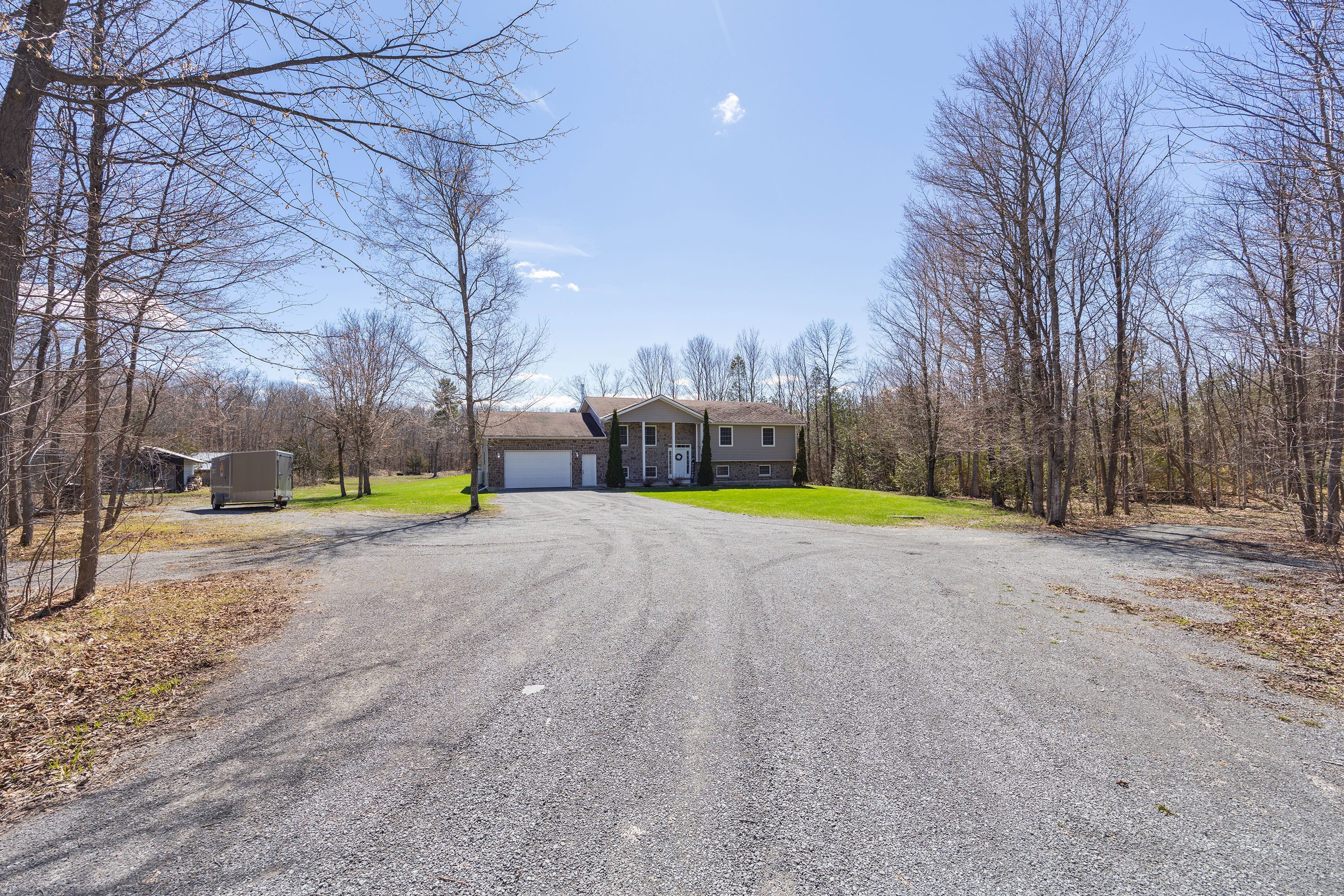 What a beautiful setting to call home! Set amongst the trees and peaceful surroundings, this home offers 3 good sized bedrooms, 2 bathrooms, open concept kitchen with so many cupboards! 9ft ceilings, large bright windows for lots of natural light, hardwood floors, ceramic tile, pot lights and a 2-car attached garage with inside entry. The primary bedroom has 'his' & 'her' closets and an ensuite that is sure to please! The two additional bedrooms are the perfect size and offer great space! In the lower level you will find a spacious rec room that has high ceilings, a convenient laundry room and walk-out to the beautiful yard all on almost 4 acres! This is your chance to find your rural dream!