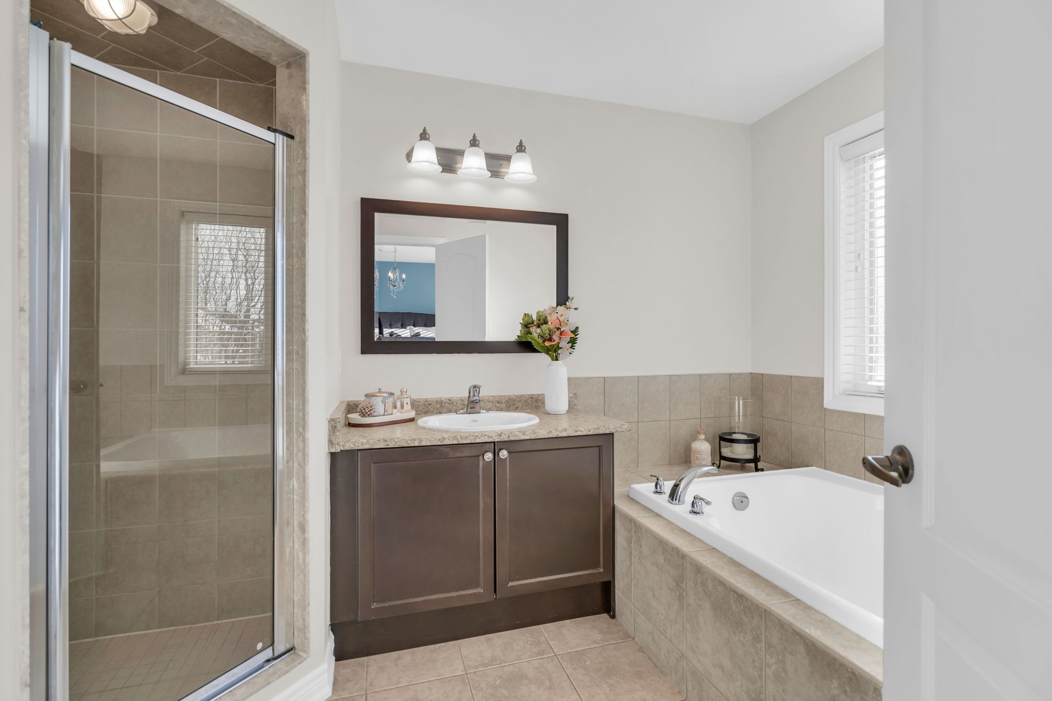 • Primary bedroom features walk-in closet and ensuite with glass shower.