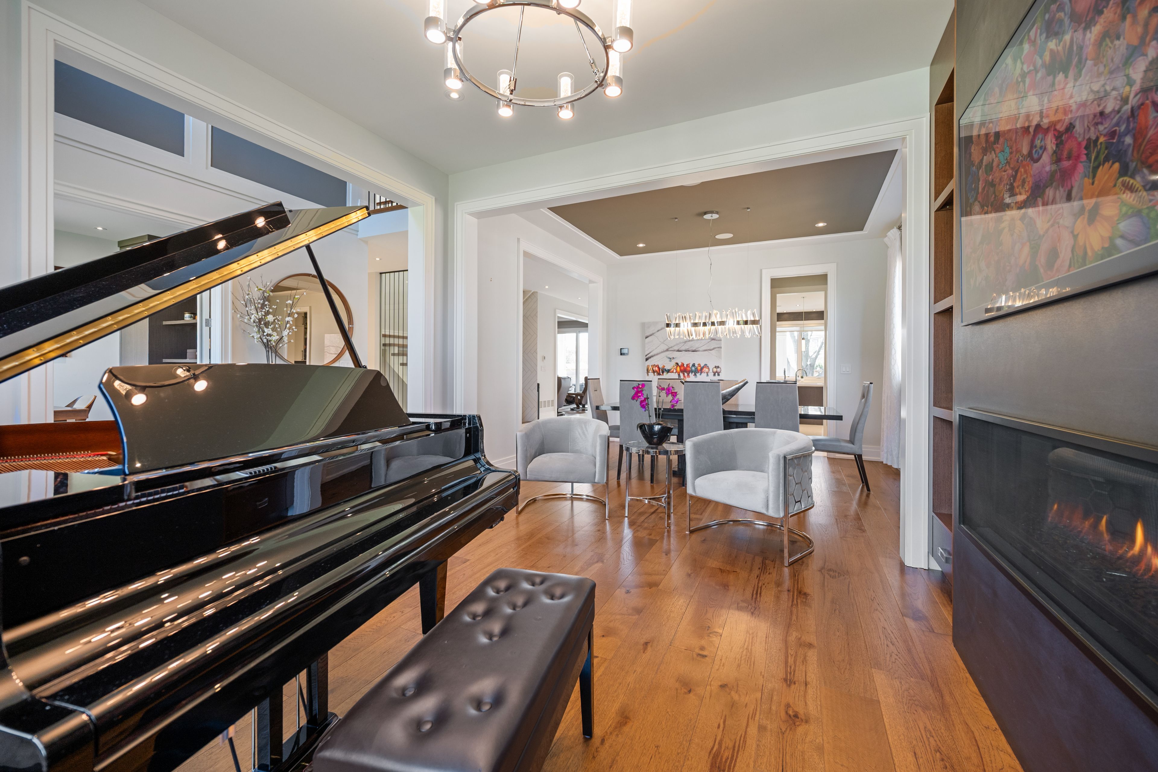 • Stately living room with gas fireplace and elegant dining space.