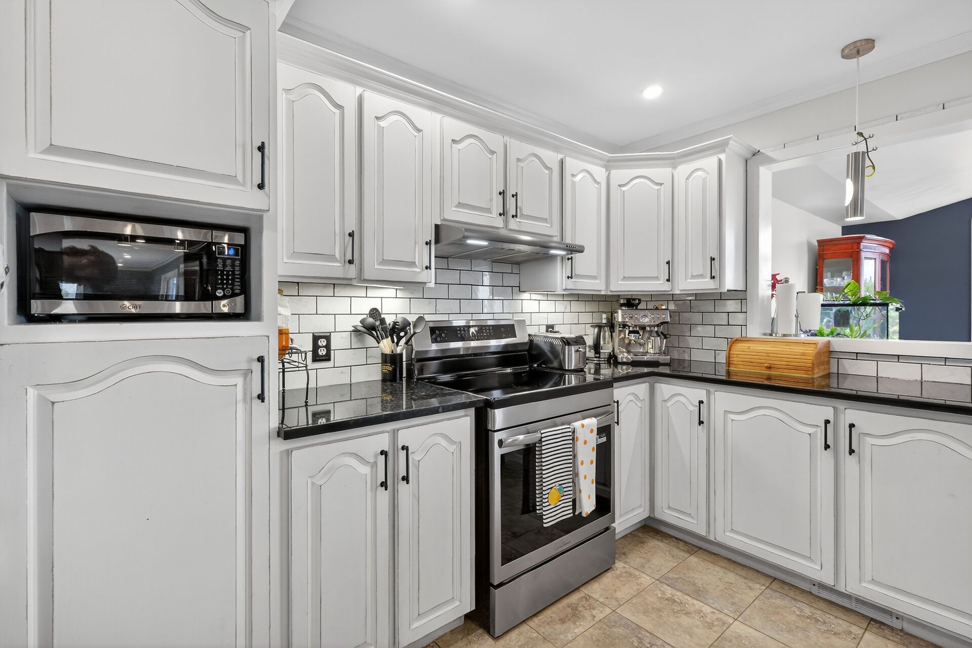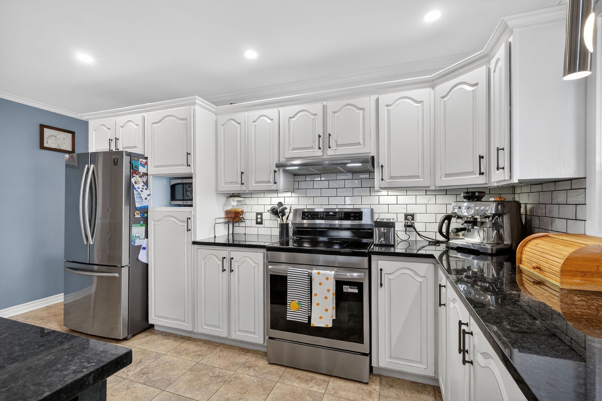 • Modern kitchen with stainless steel appliances and ample workspace for cooking.