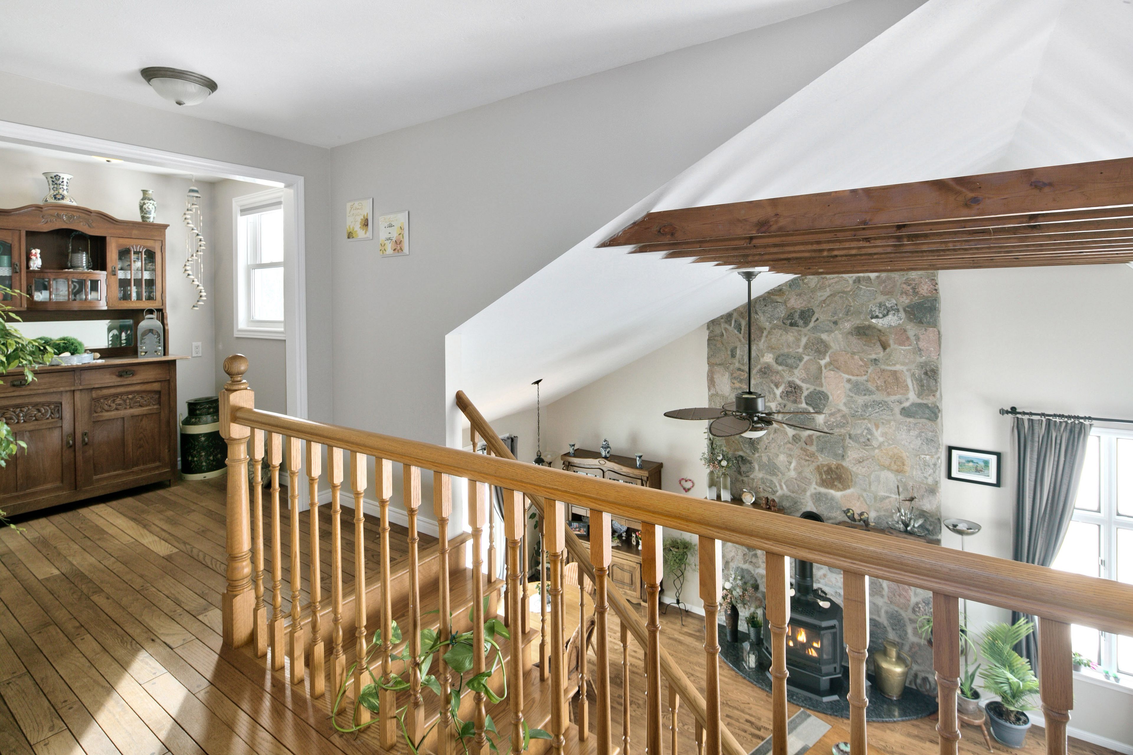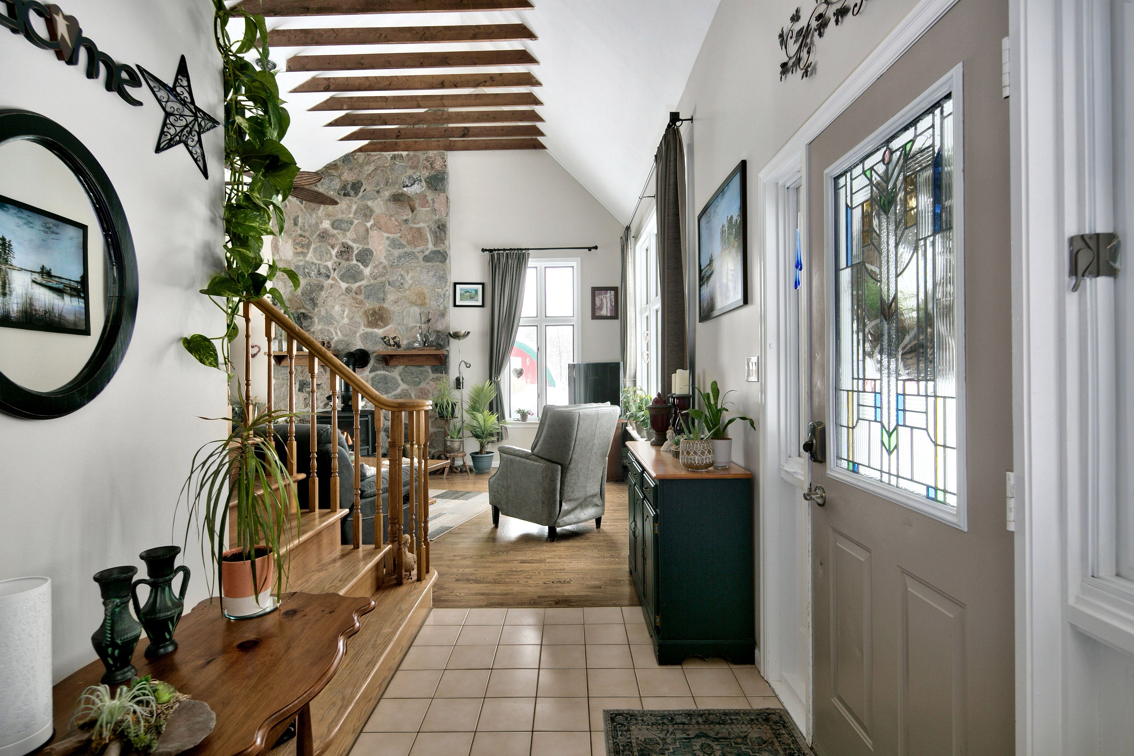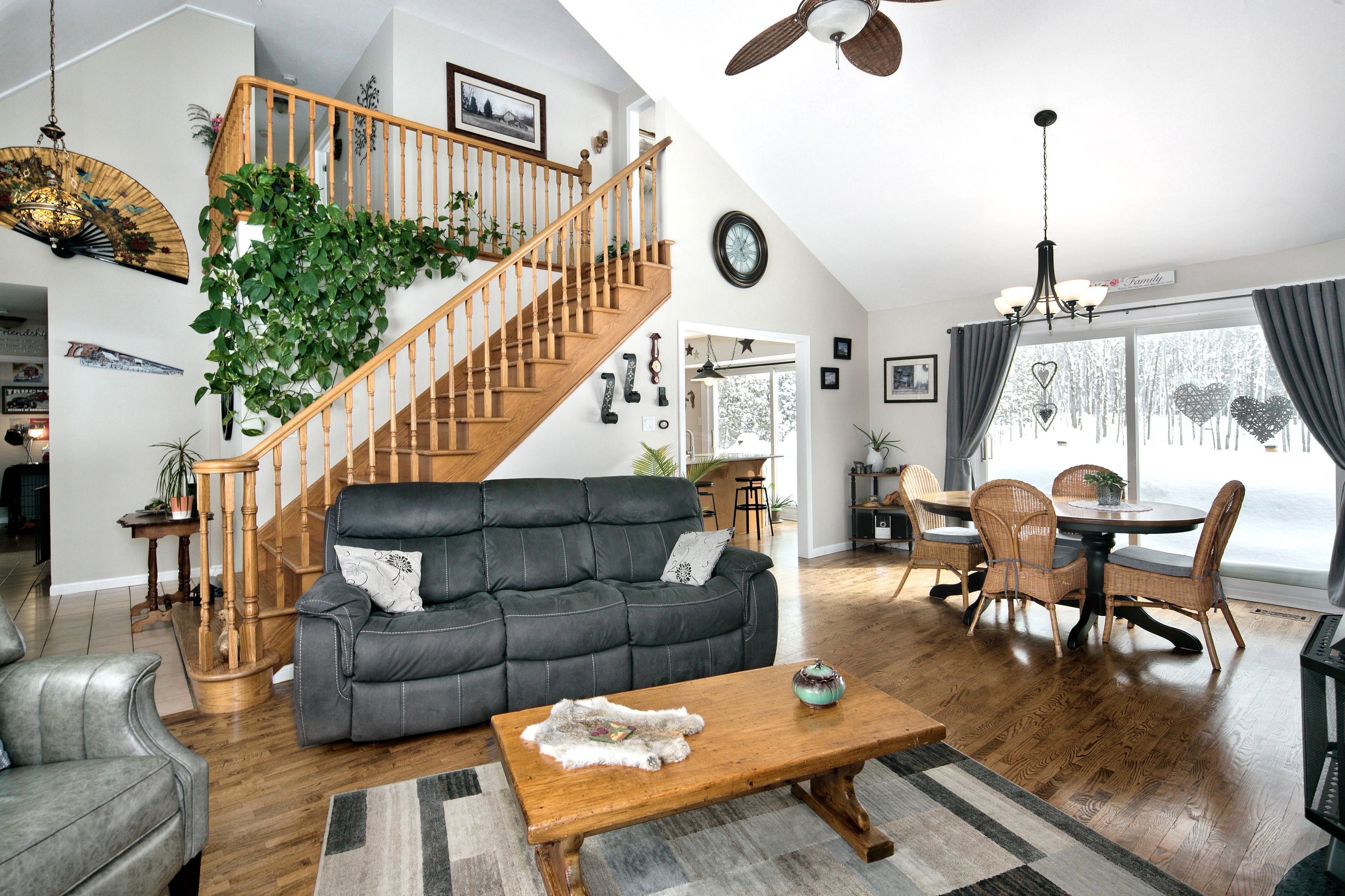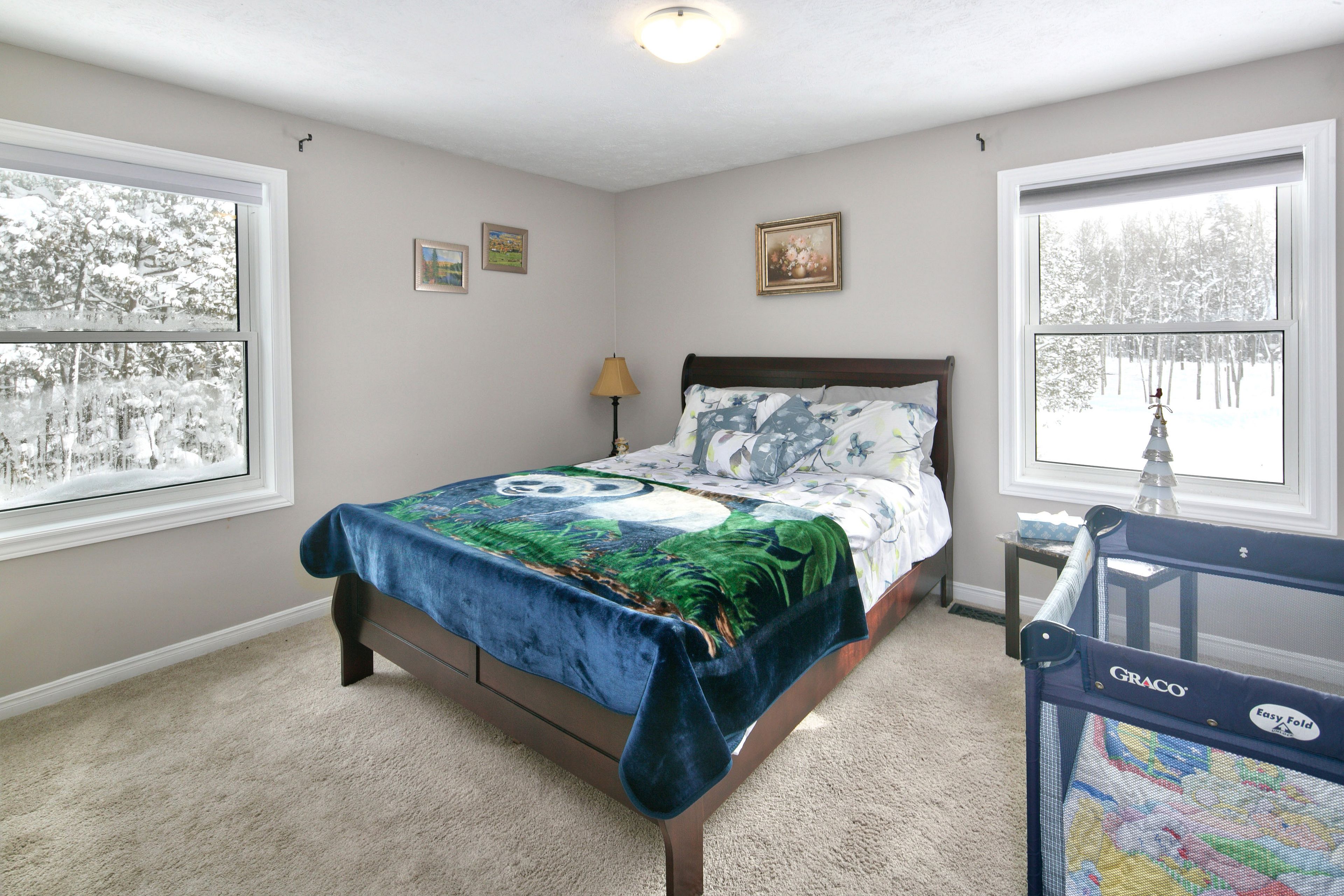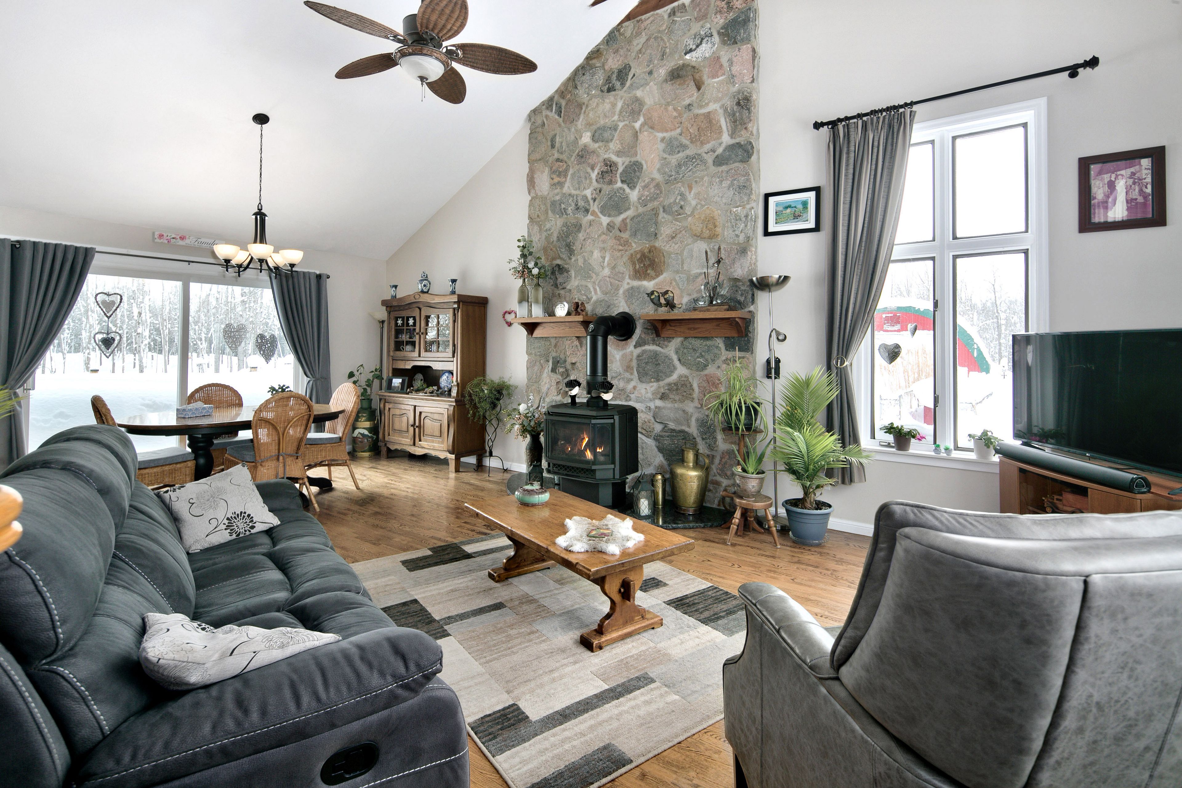 Tucked away in total privacy, this exceptional 49. 5-acre property is a rare retreat for nature lovers seeking peace, space, and connection to the outdoors. Surrounded by wildlife and mature landscape, the land offers a beautiful mix of forested land with mulched trails throughout and a natural spring fed pond that enhances the serene setting. The updated 1. 5-storey home with loft is warm, welcoming, and thoughtfully improved. The main floor features a spacious living room with cathedral ceilings, a propane fireplace, hardwood floors throughout and new windows on main and upper level. The large main floor primary bedroom offers two closets and a completely redone 3-piece ensuite. The kitchen was completely renovated (2020) with quartz counter tops and island and new appliances, with a new patio door providing access to a large composite deck (2022), perfect for entertaining or simply enjoying the peaceful surroundings. Upstairs, you'll find two additional bedrooms, a 4-piece bath, and ample storage. The semi-finished basement offers a rec room and additional space to grow, along with updated mechanicals including water softener (2022), uv light, 200-amp breaker panel, furnace (2017), central air, and central vacuum. For hobbyists or those needing extra space, the property includes an attached insulated & heated 24'x24' 2-car garage plus a separate detached 24' x 23' detached 2-car garage. Also included with property is a dog kennel with doghouse. Modern conveniences and updates such as fibre internet and a security system (2022) septic bed (2022) ensure comfort, connectivity and peace of mind. A great opportunity offering quiet, privacy, and endless space-an ideal escape where nature, comfort, and functionality come together.