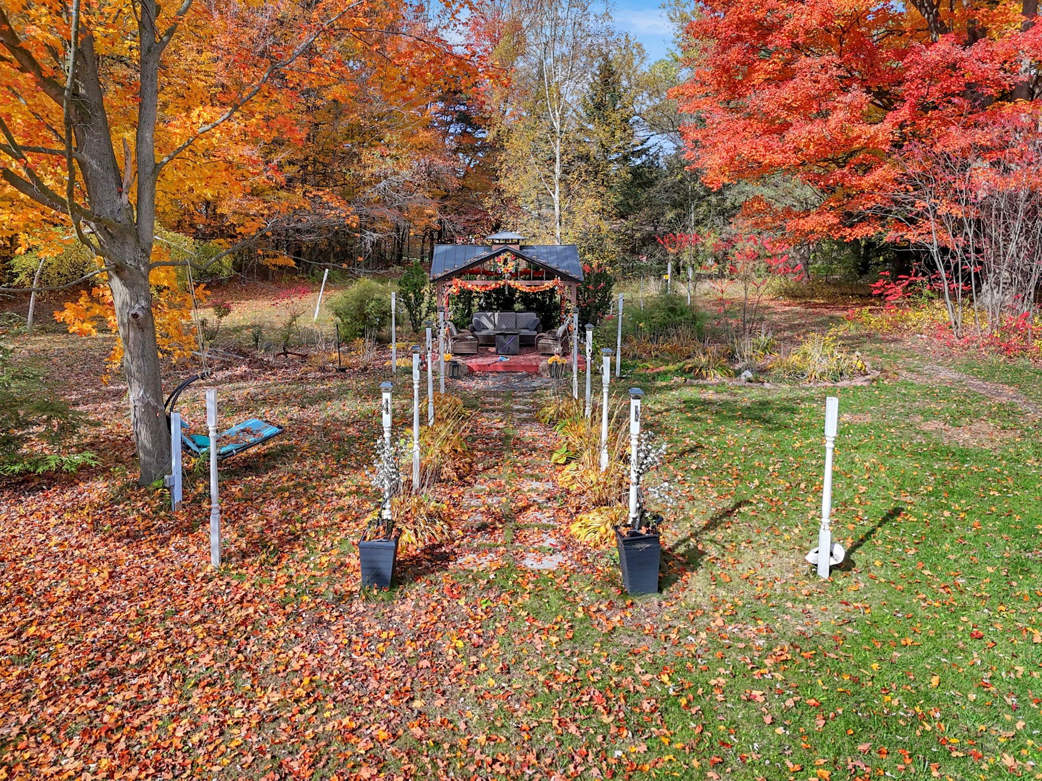 • Outdoor space features a garage, garden beds, and fruit trees.