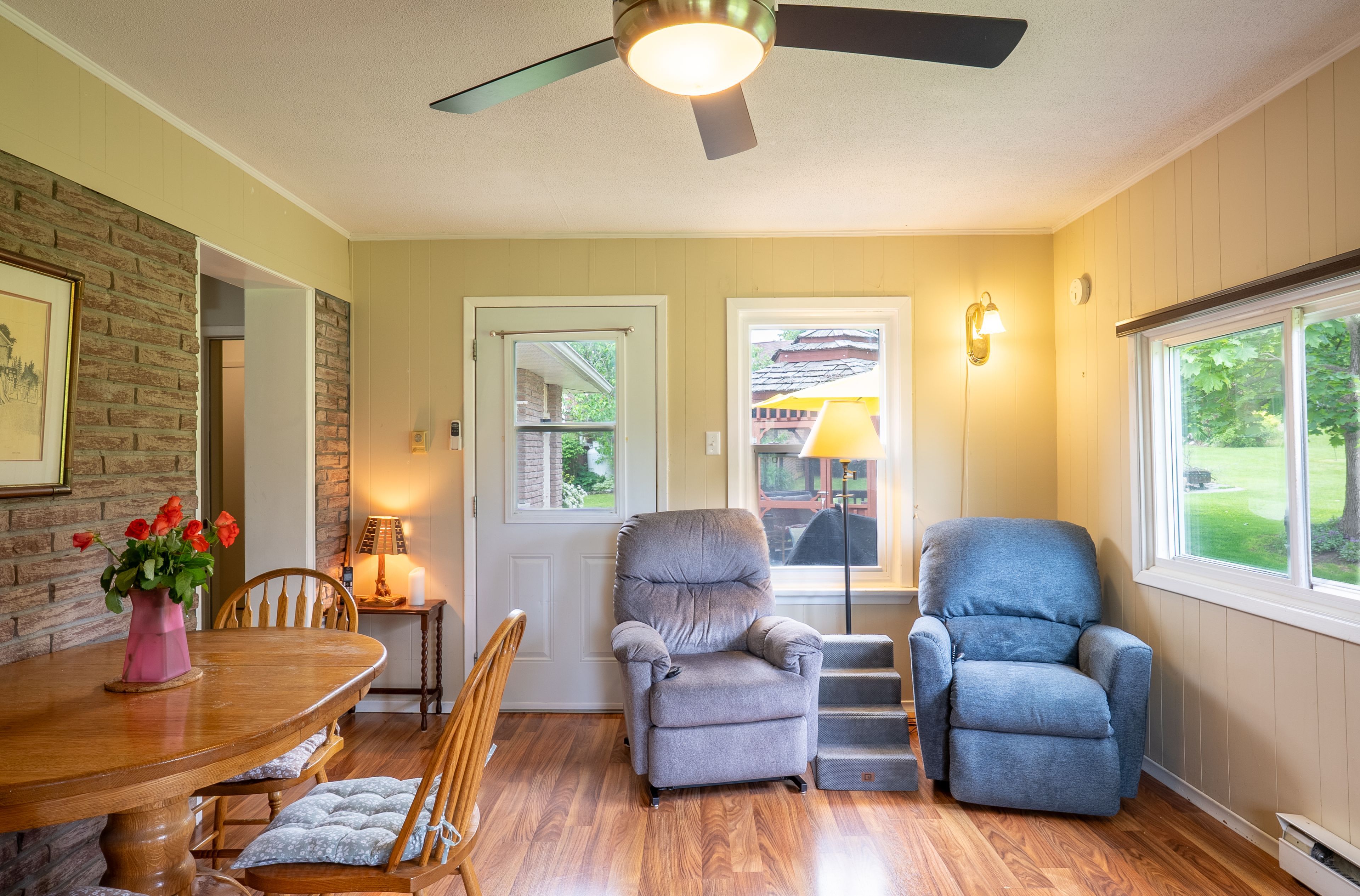 • Bright main floor with living room, dining area, and four-season sunroom.