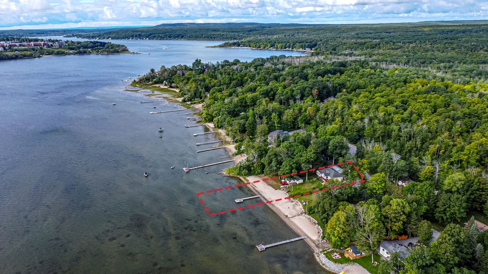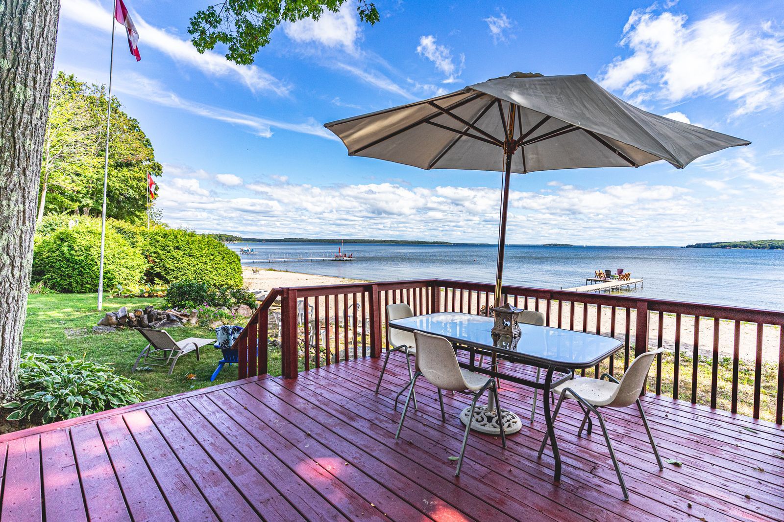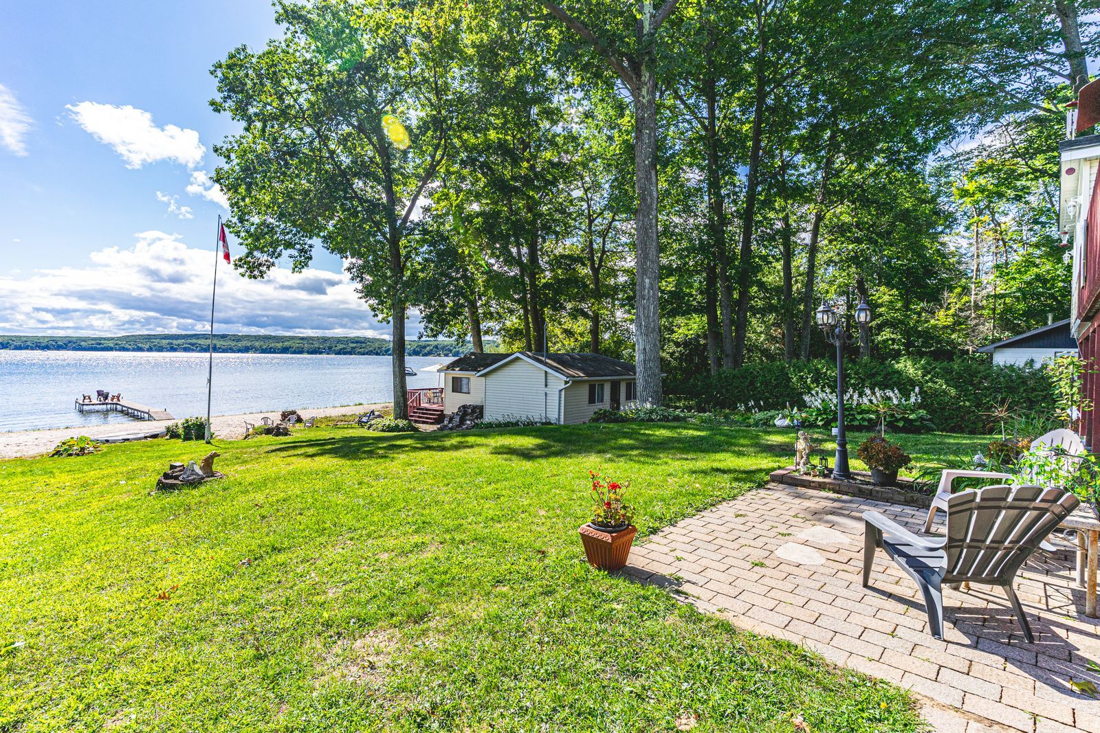 Luxurious georgian bay estate with 83 ft of sandy shoreline, second cottage, detached garage & almost half an acre! 83 feet of georgian bay frontage with eastern exposure presents a private sandy beach with gradual entry, clear waters, and sunrise views that define the waterfront lifestyle. Set on nearly half an acre with a large back deck, the property is further enhanced by an expansive l-shaped dock with a bump-out that extends into the bay, offering an impressive setting for entertaining, lounging, and docking motorcraft. Located on a coveted cul-de-sac along sought-after peek-a-boo trail and just steps from tee pee point park, the property delivers exclusivity and tranquillity while remaining approximately 10 minutes to local essentials and a short drive to penetanguishene and midland for expanded amenities. The primary residence introduces itself with a stately front entry, covered porch, manicured landscaping, and a detached two-car garage with six-car driveway parking. The kitchen is appointed with rich wood cabinetry topped with crown, granite counters, stainless steel appliances, and a built-in desk area. The living room features a bay window, crown moulding, fireplace, and french doors, while the spectacular sunroom boasts soaring ceilings, shiplap accents, pot lights, a dramatic fireplace, and a walkout. The primary bedroom highlights its own walkout to the sunroom, a walk-in closet, and a spa-like 6-piece ensuite. Extending the living space, the finished walkout basement showcases a massive rec room with a third fireplace, and room for a pool table, along with a fourth bedroom and full bath, with the entire level opening directly to the yard and waterfront. A versatile second cottage with two bedrooms, a bathroom, a kitchen and a living area, and a private deck enhances the property's functionality for family and guests, while main floor laundry, in-floor radiant heating, central vac, and erv/hrv systems add to the overall comfort.
