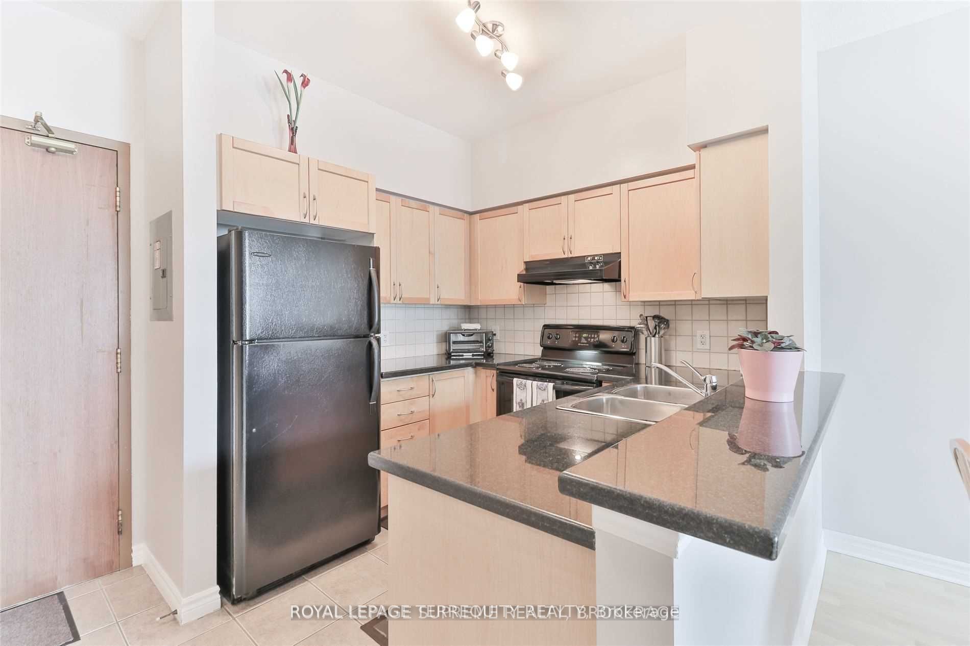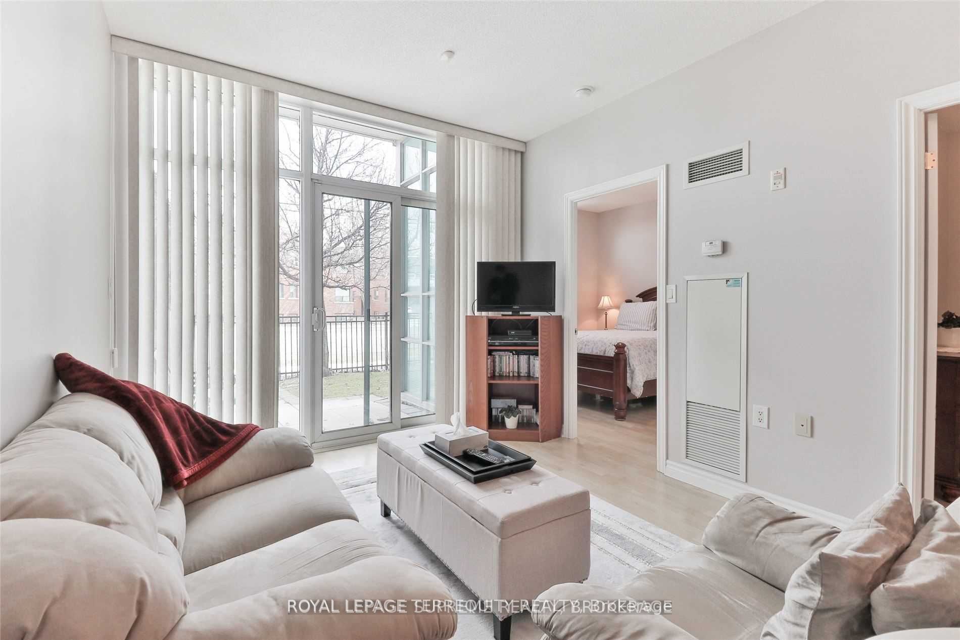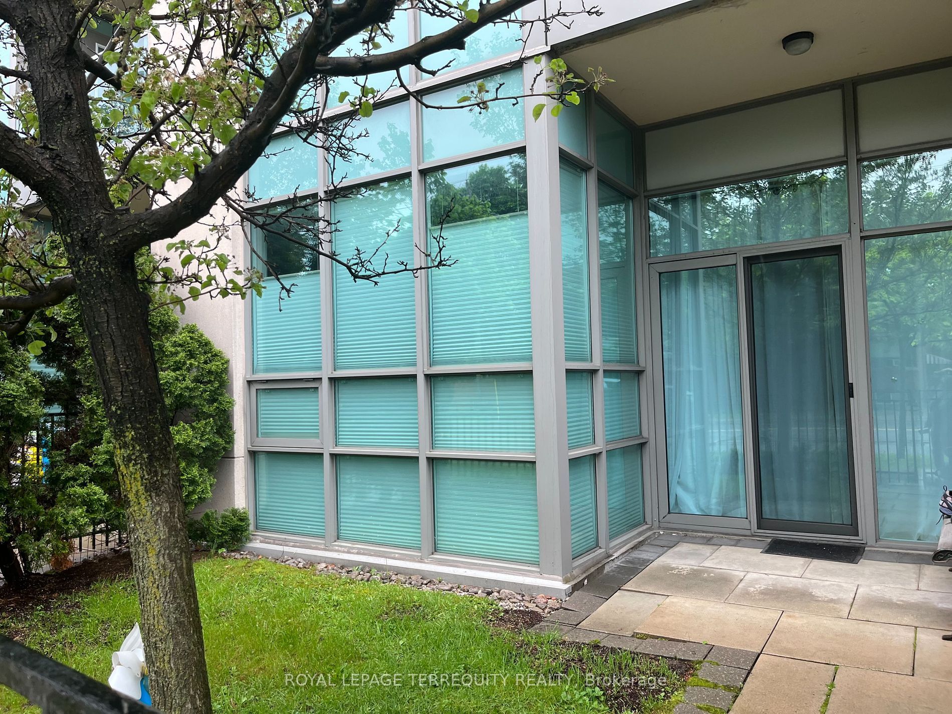 Beautiful, bright 1 bedroom + large den in an unbeatable location. This rare ground floor unit offers 9 ft ceilings, a private gated patio, and underground parking. Thoughtfully designed open-concept layout with a versatile den (with french doors) perfect for a home office or second bedroom. Stylish kitchen with granite counters, ceramic backsplash, breakfast bar, and built-in appliances. Ensuite laundry included. Enjoy the ease of condo living with ttc, shopping, and dining at your doorstep and quick highway access. Exceptional ameninties including 24 hour concierge, renovated gym, sauna, steam room, media lounge, and party room.
