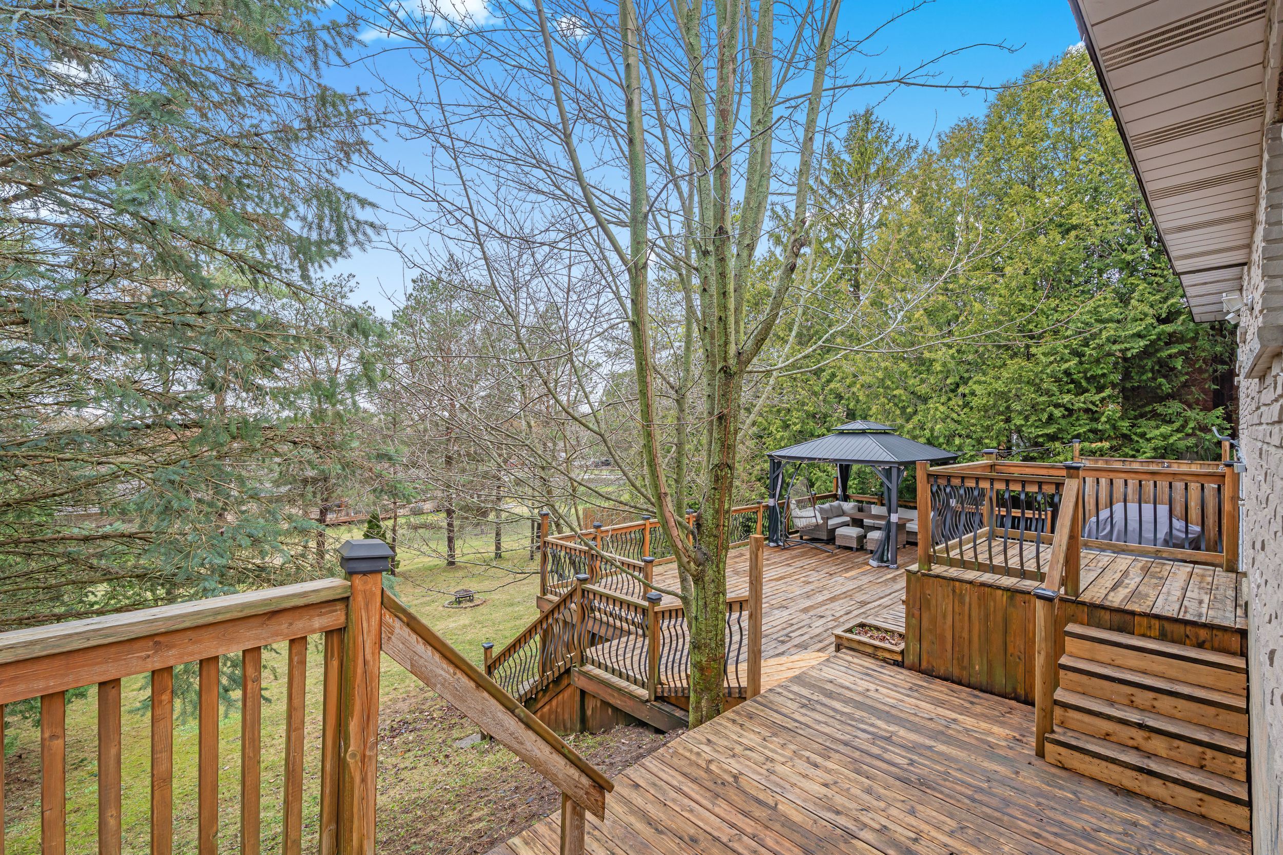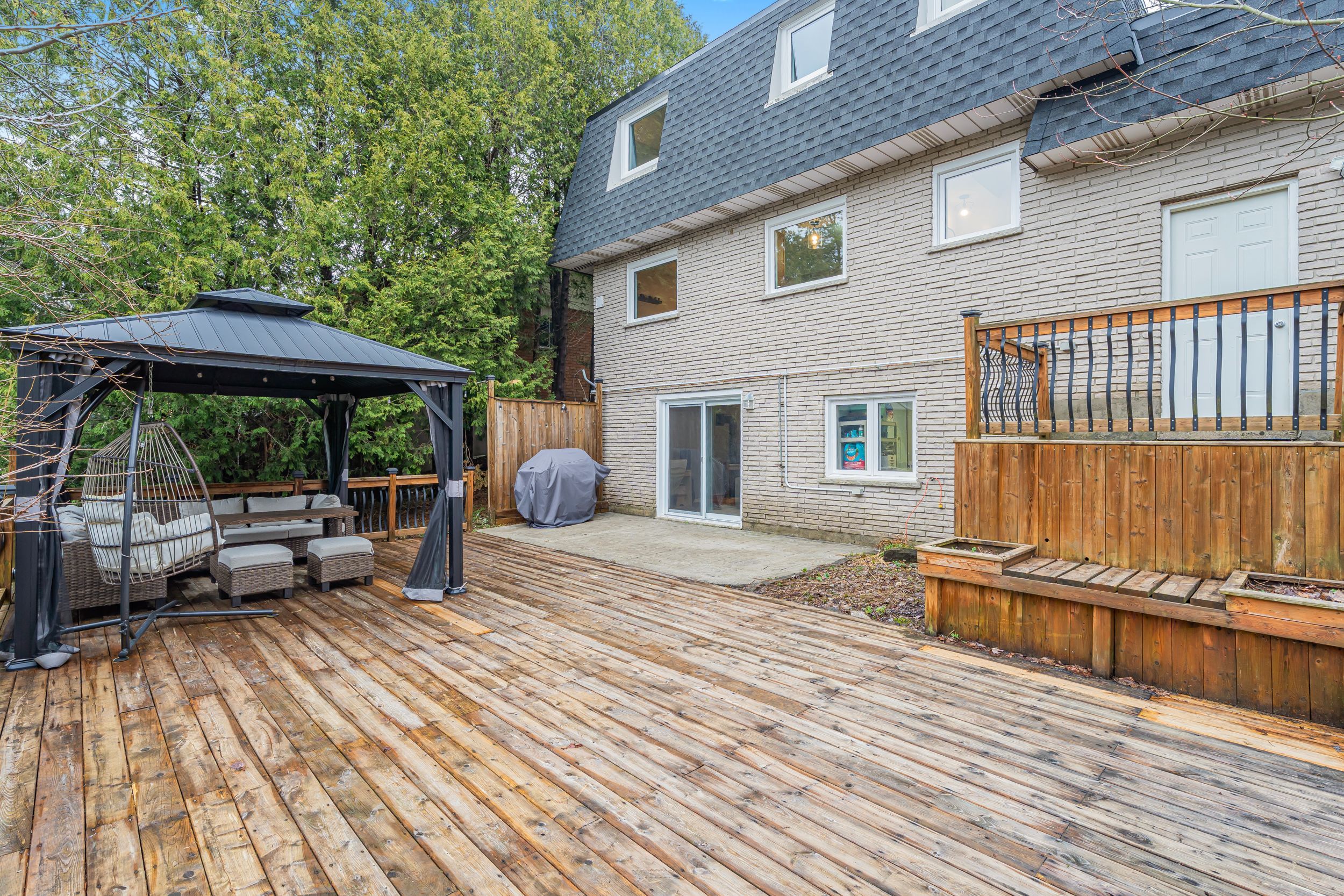 • Two-tier deck overlooks a peaceful, tree-lined yard for relaxation and entertaining.