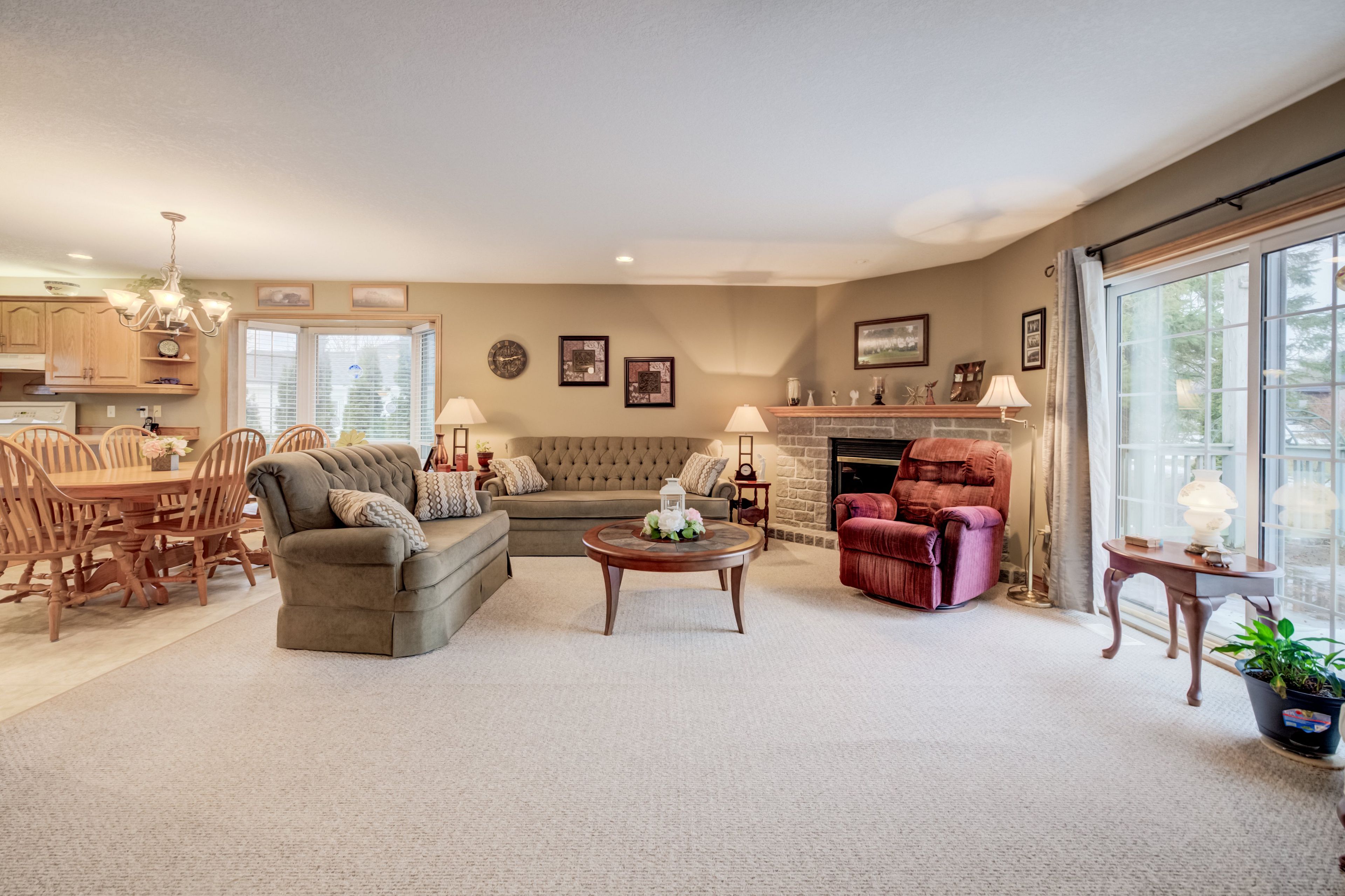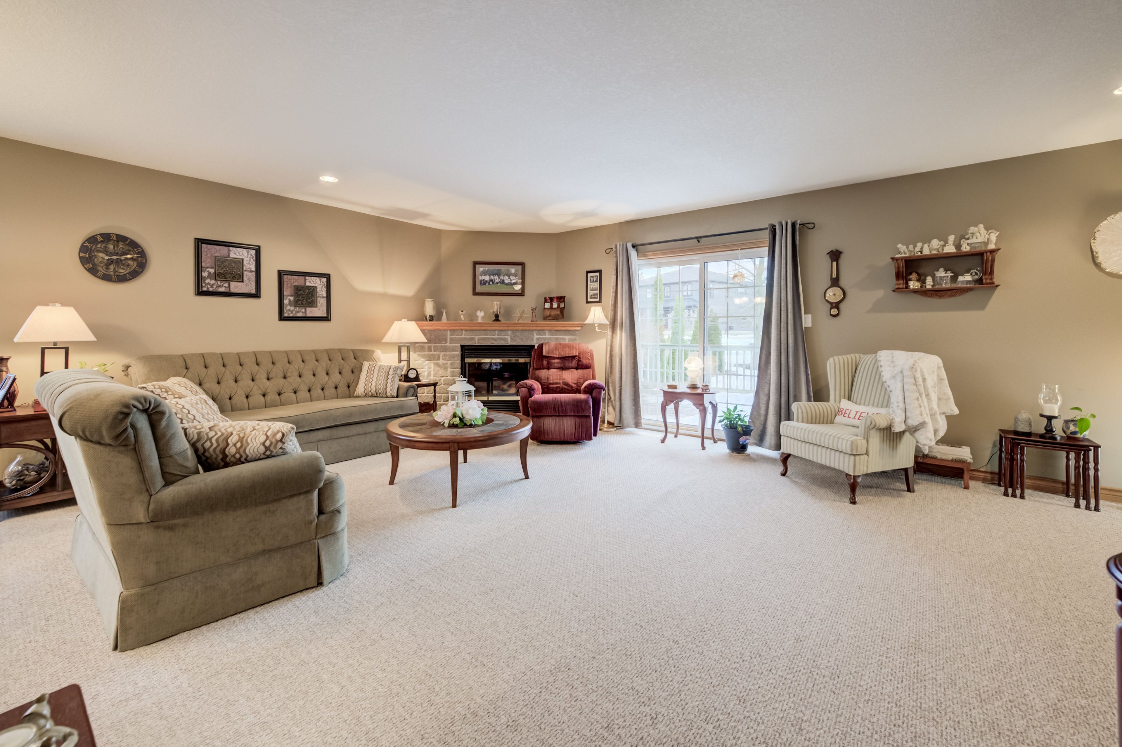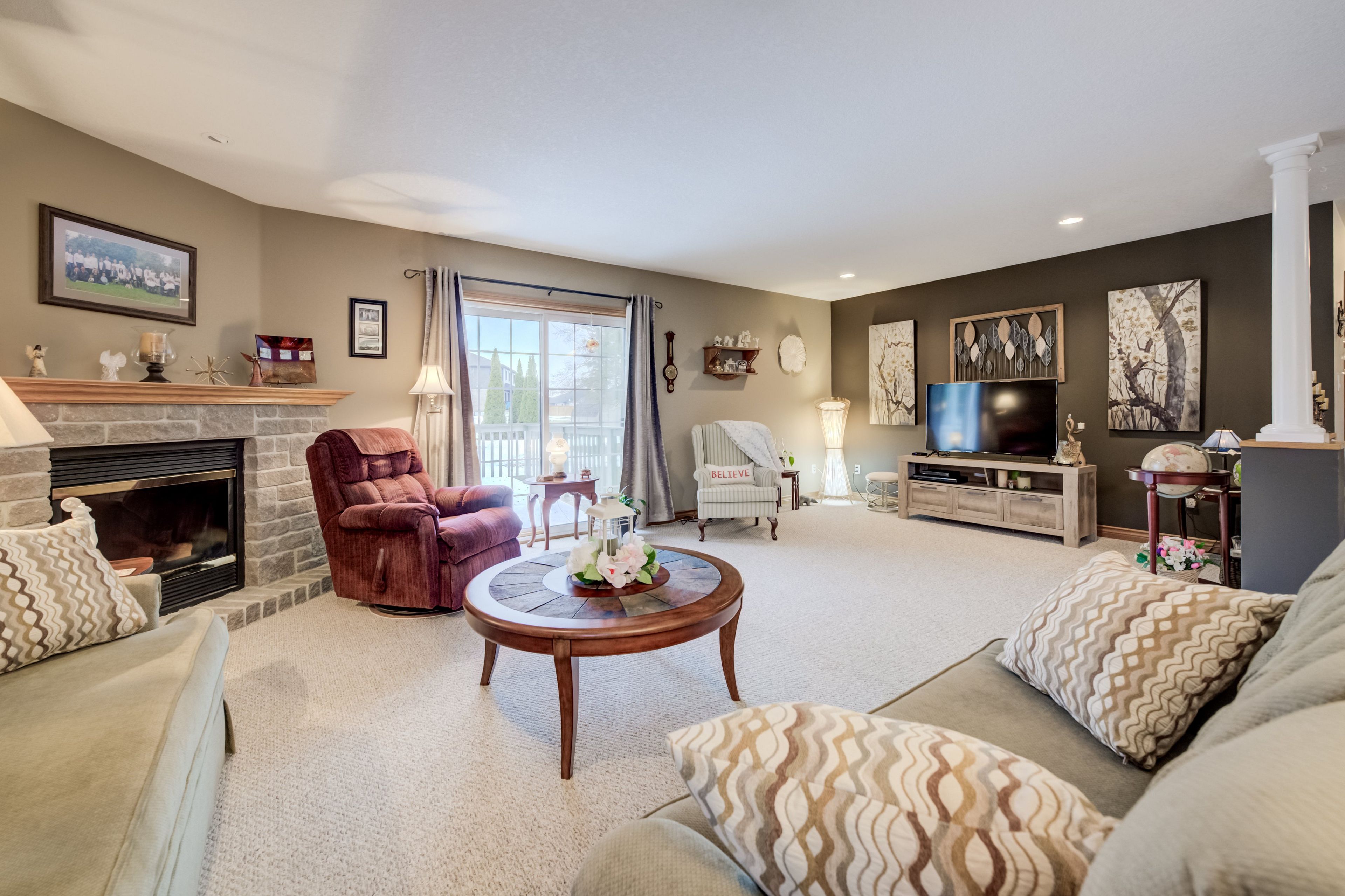 • Bright main floor with a spacious living room and stunning stone fireplace.