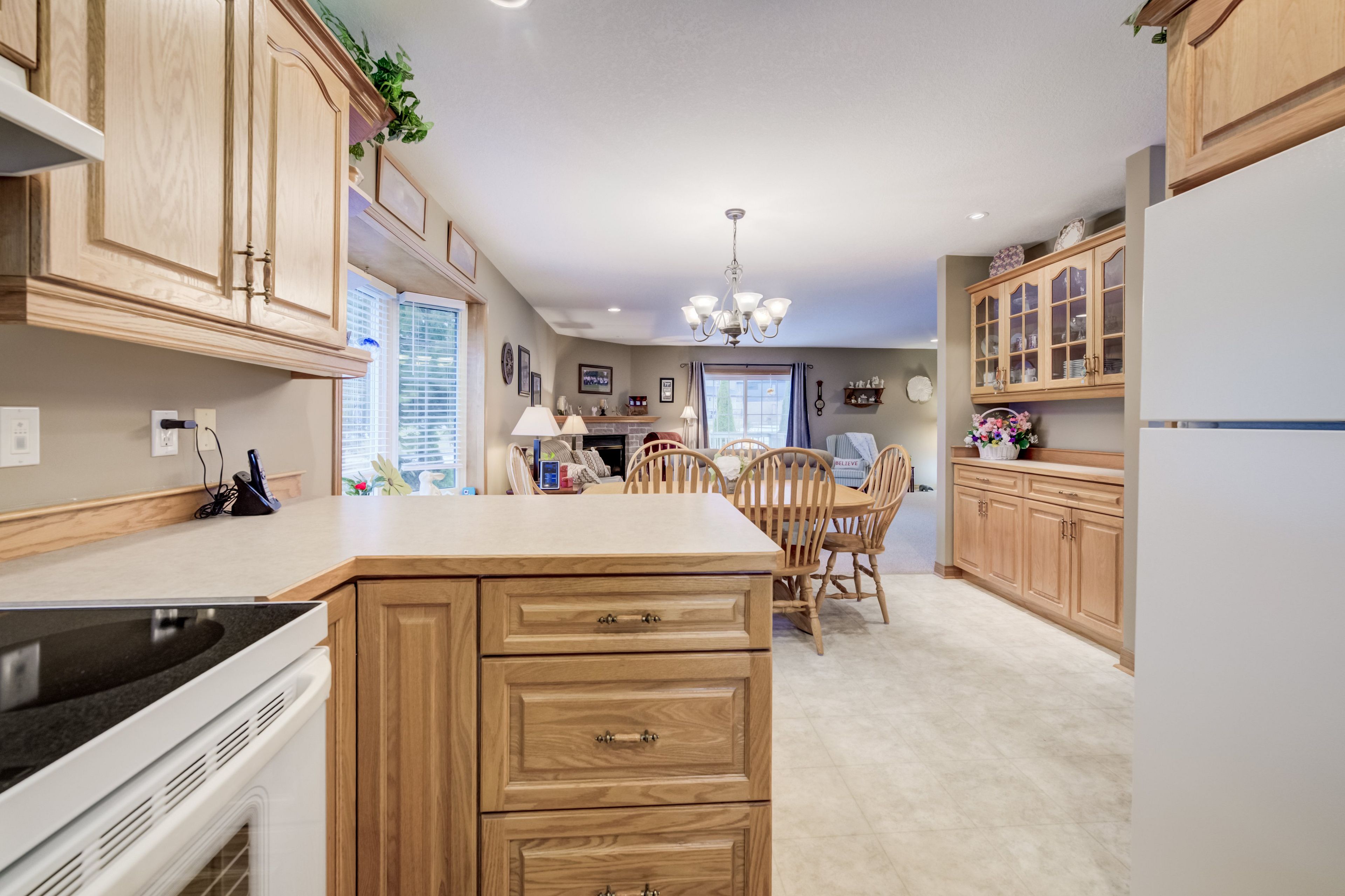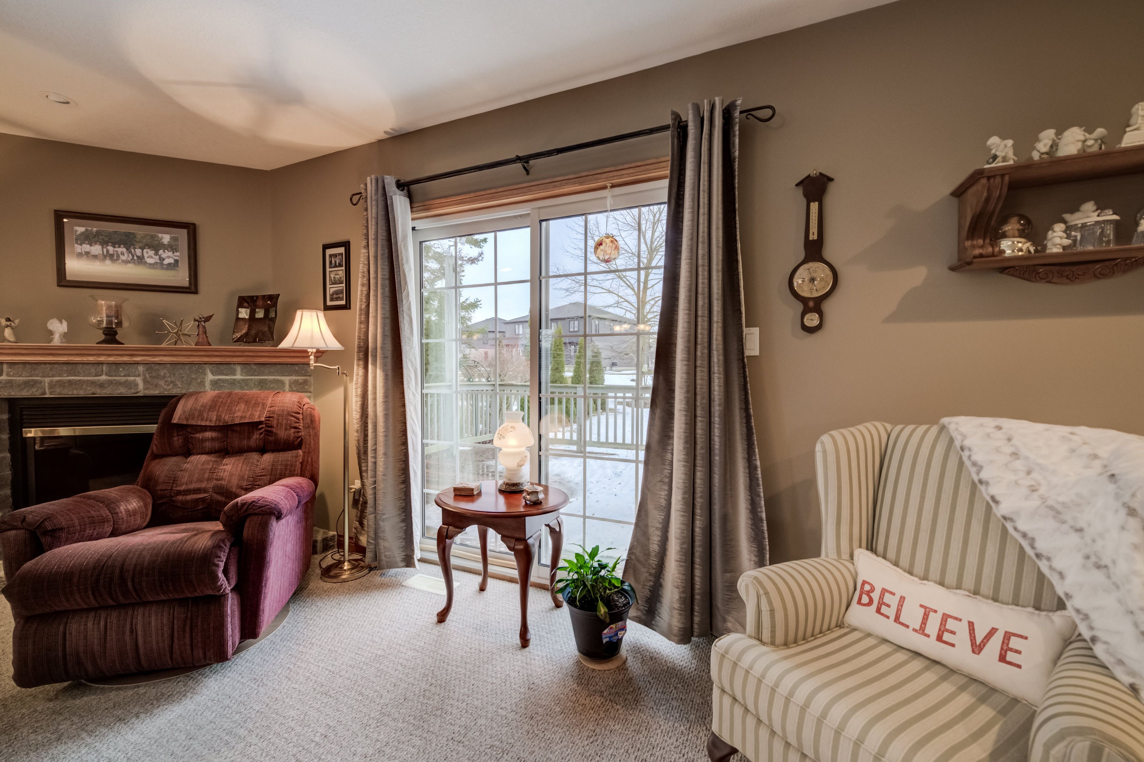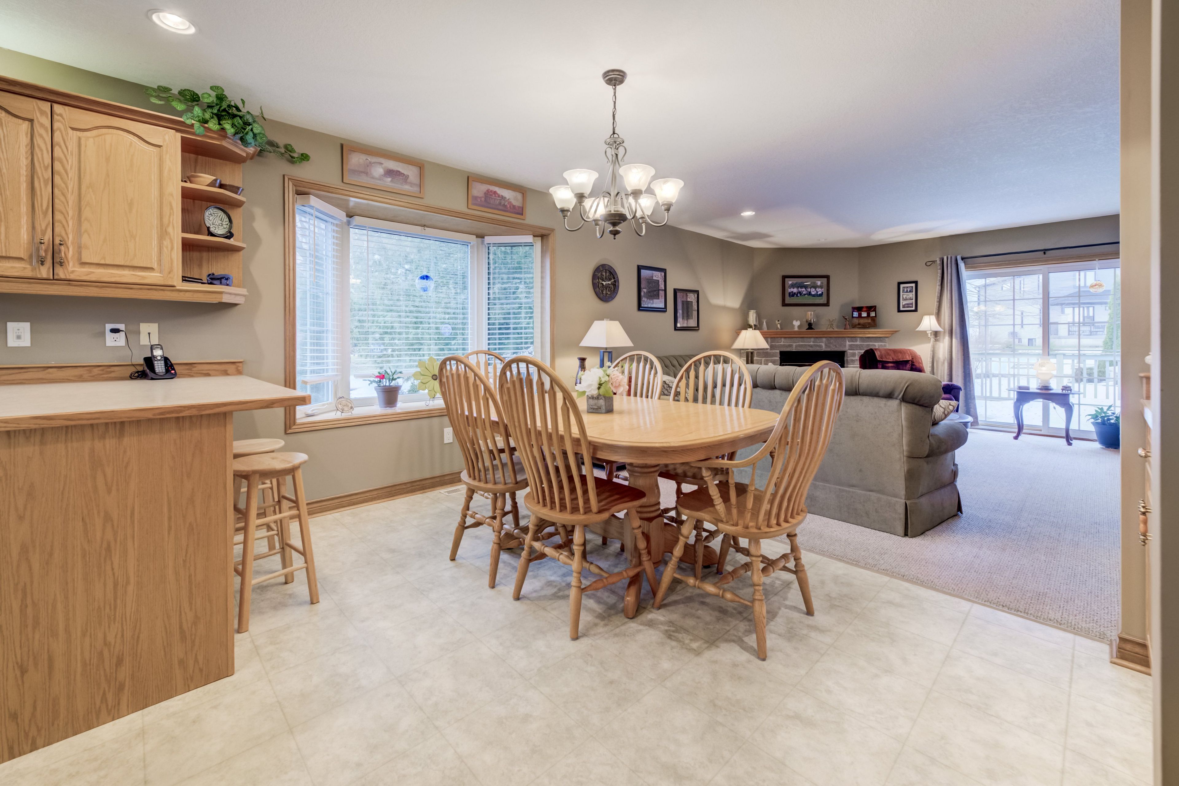 • Bright main floor with a spacious living room and stunning stone fireplace.