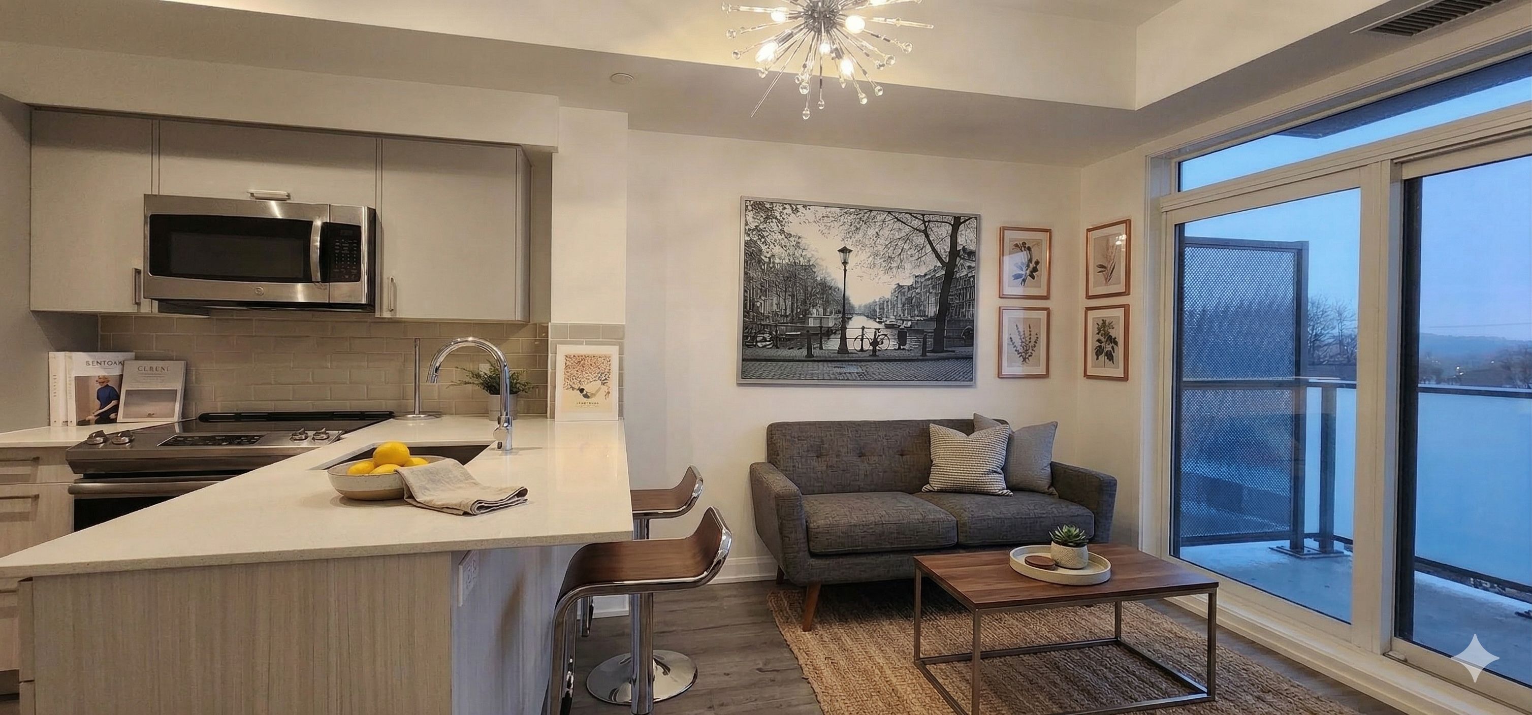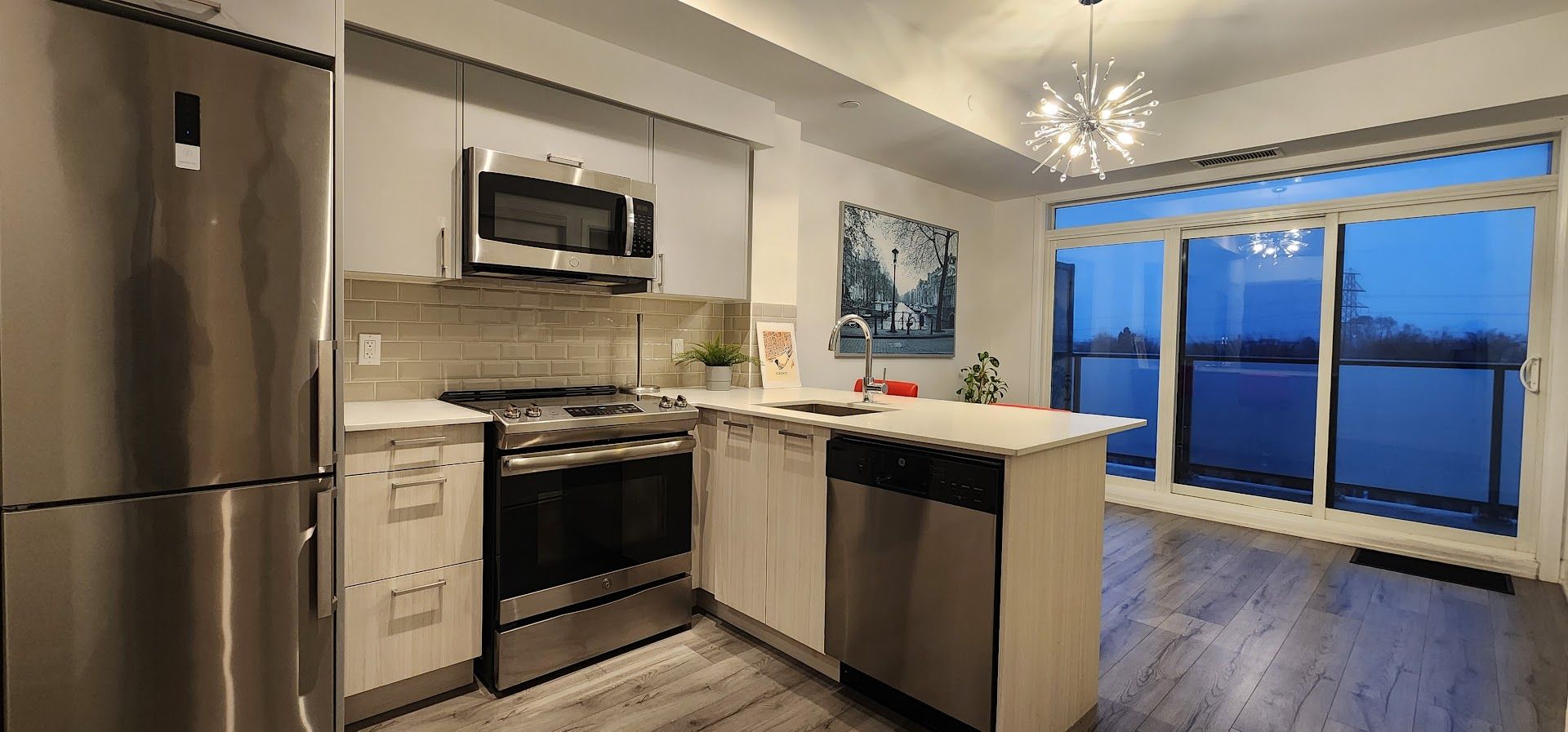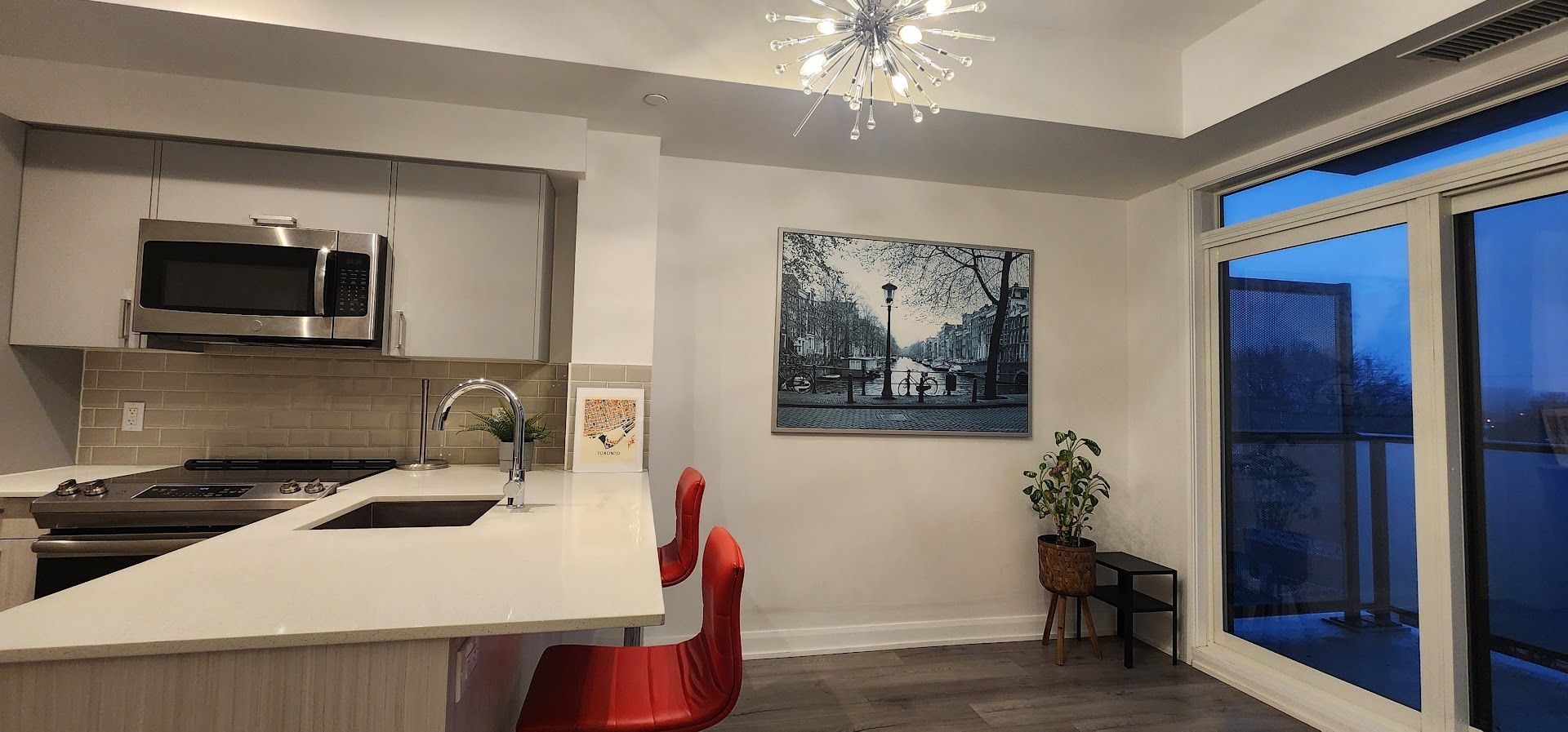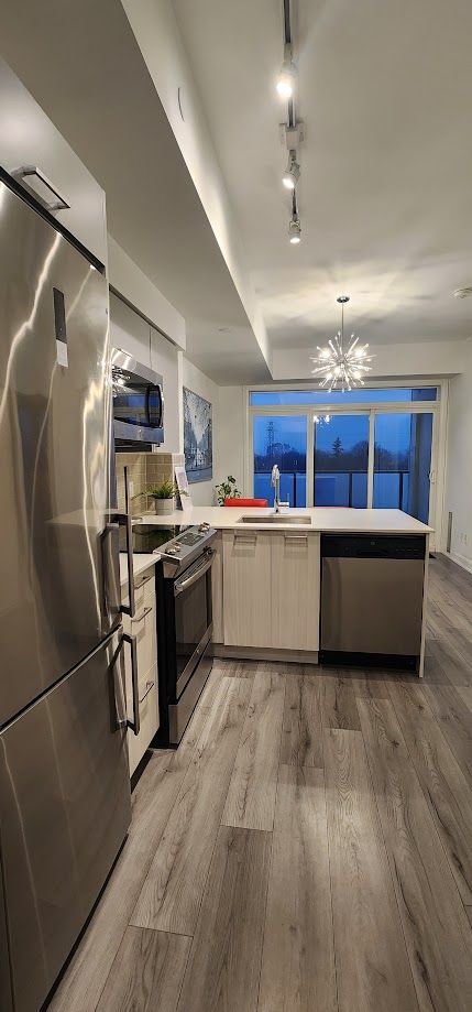 Welcome to your sleek new home at 385 osler street. This stunning, modern 1-bedroom suite is the perfect match for young professionals or couples looking for that perfect blend of style, convenience, and community. Open-concept living featuring gorgeous wide-plank flooring and soaring floor-to-ceiling windows that flood the space with natural light. Elevate your cooking game with high-end stainless steel appliances, crisp subway tile backsplash, and a functional breakfast bar perfect for morning coffee or evening cocktails. Step out onto your private balcony to enjoy sweeping, unobstructed views of the vibrant st. Clair west skyline-an ideal spot to unwind after a busy day. Designer finishes with the "sputnik" chandelier to the clean lines of the spa-like bathroom, every detail has been curated for a modern lifestyle. Stay active in the full-scale gym, host friends in the chic party room, or find some quiet time in the building's library. Unbeatable connectivity with the st. Clair streetcar just steps away, making your commute a breeze. Located in the sought-after st. Clair west district, you are walking distance to eclectic cafes, trendy restaurants, local shops, and lush parks. Don't miss out on this opportunity to live in one of the city's most dynamic neighborhood.
