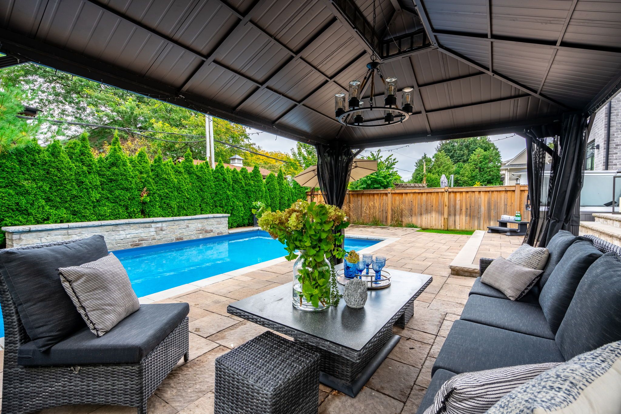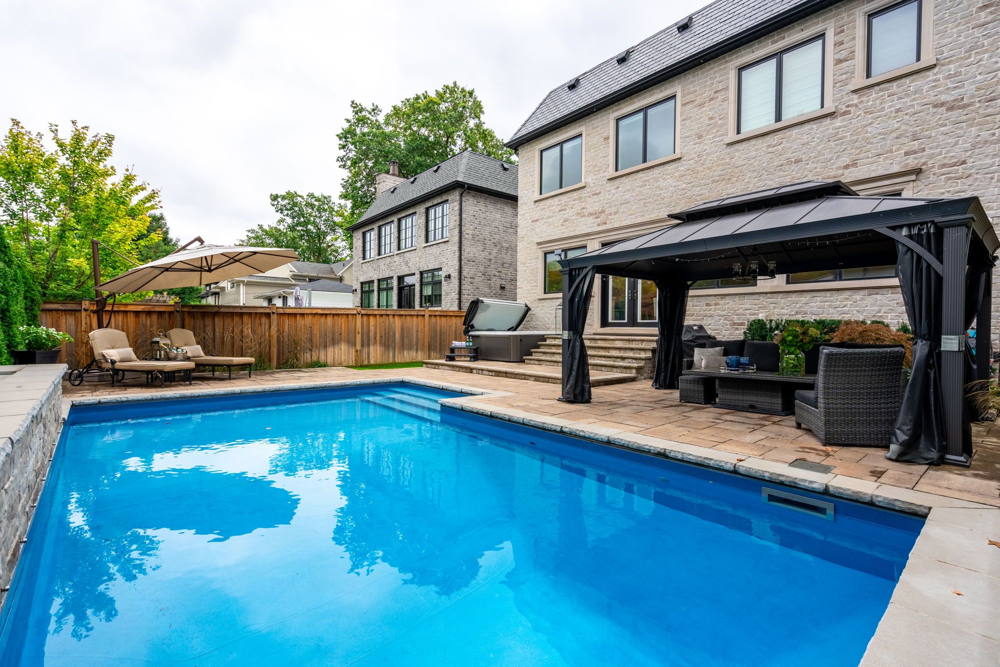 • Private backyard with an inground pool, hot tub, and patio.