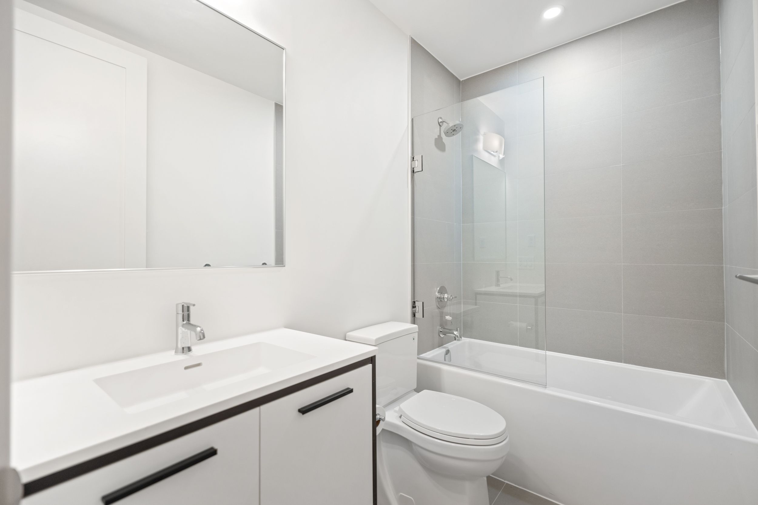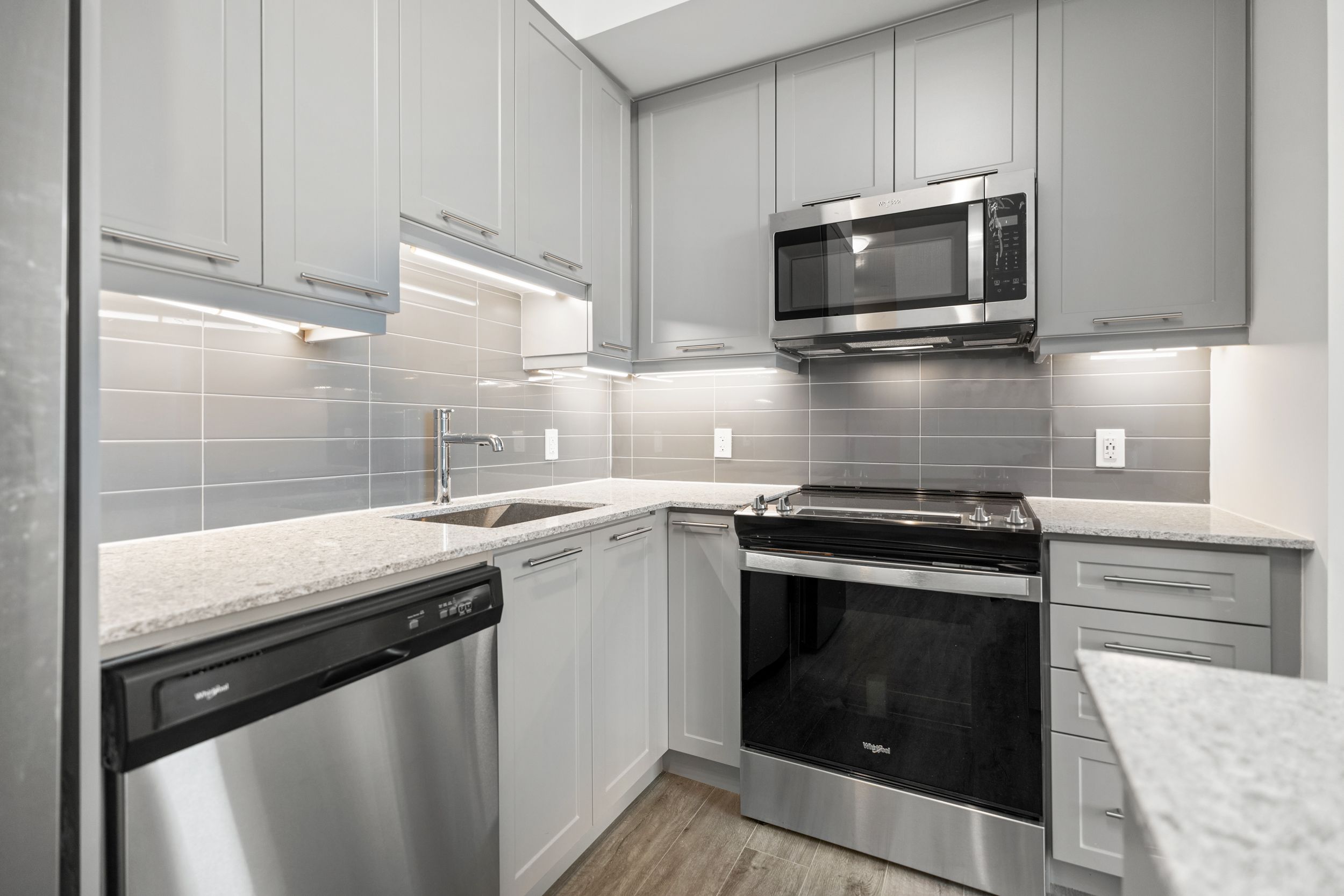 • Modern kitchen with stainless steel appliances and quartz countertops.