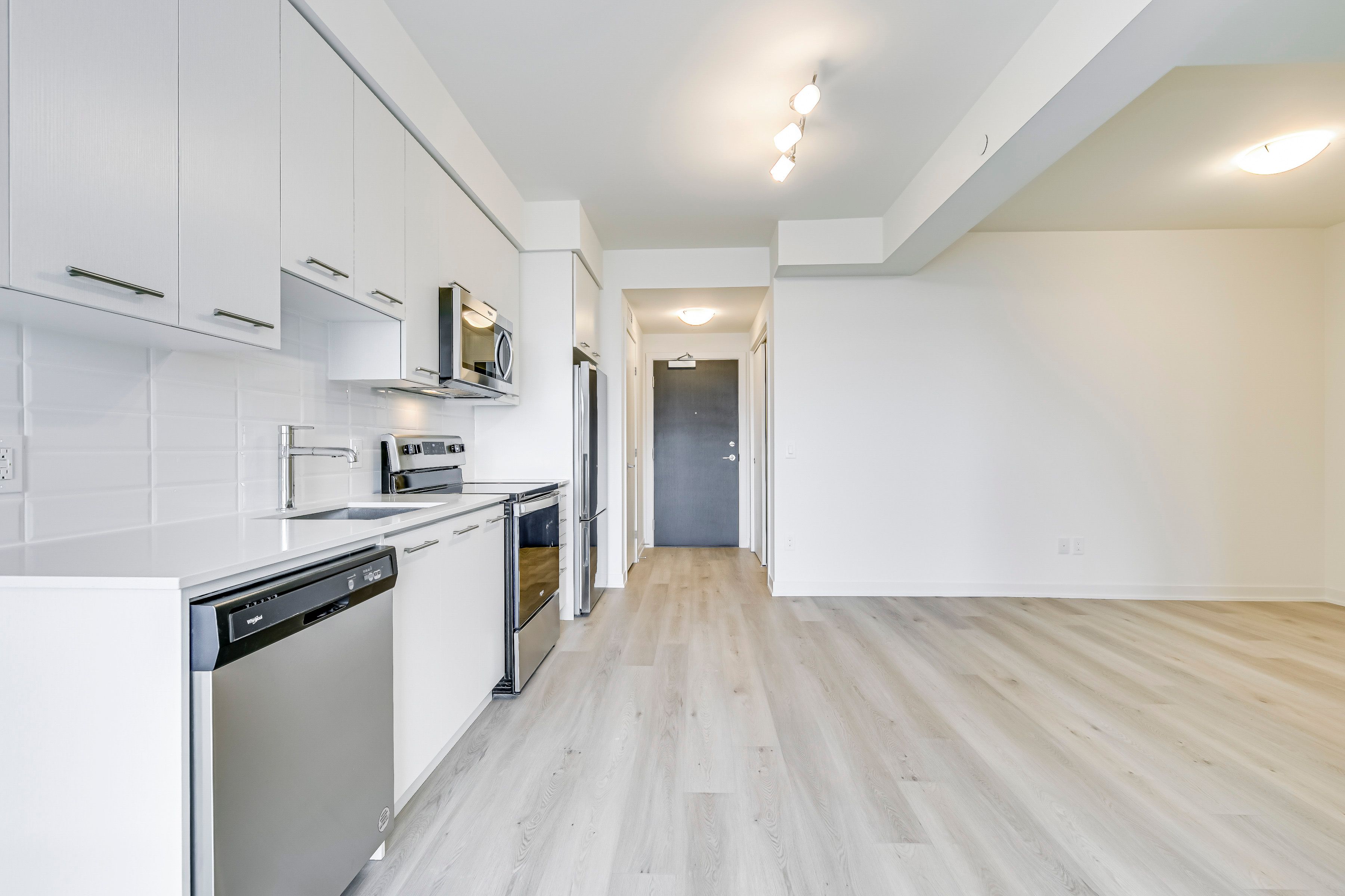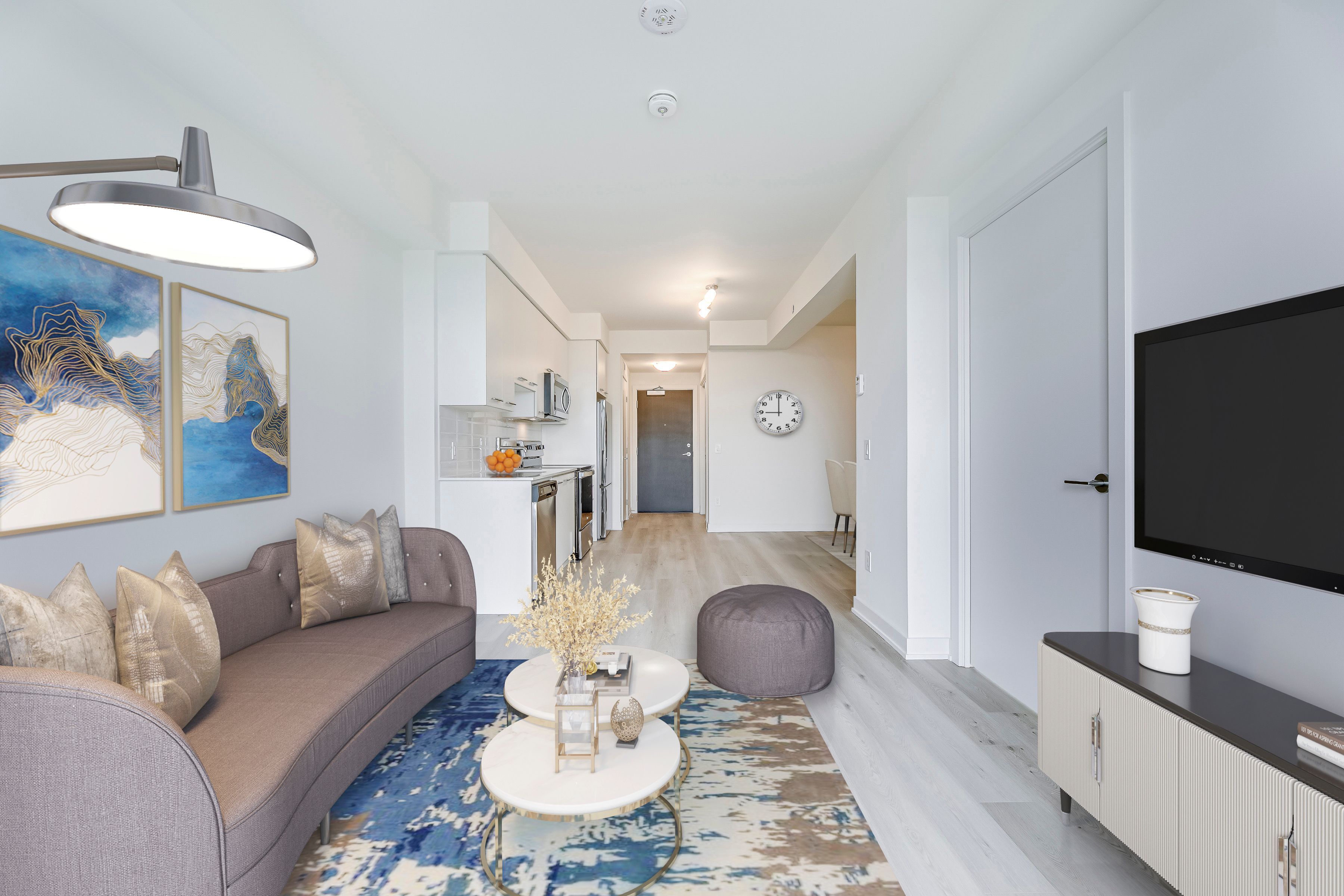 • Modern open-concept layout with high ceilings and sleek finishes.