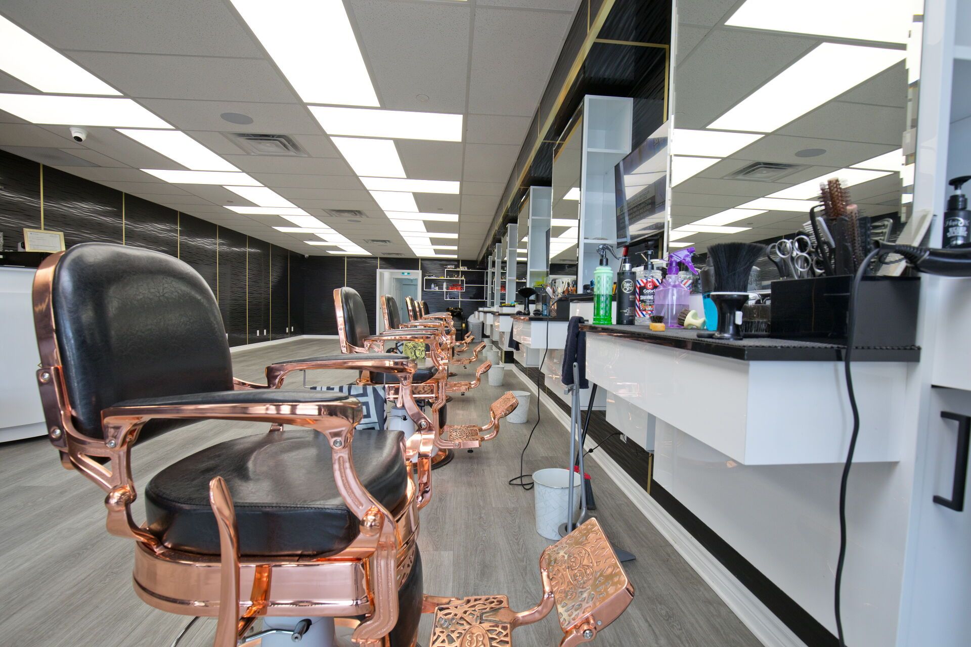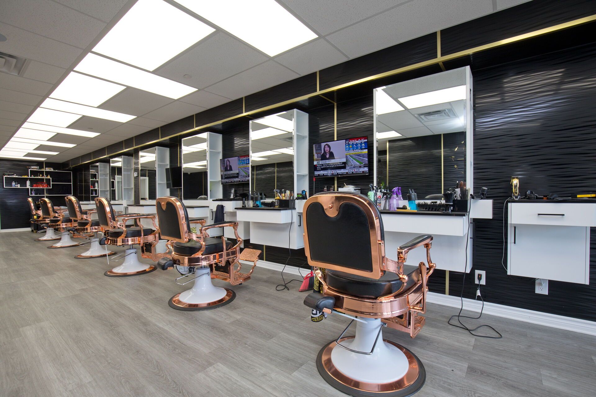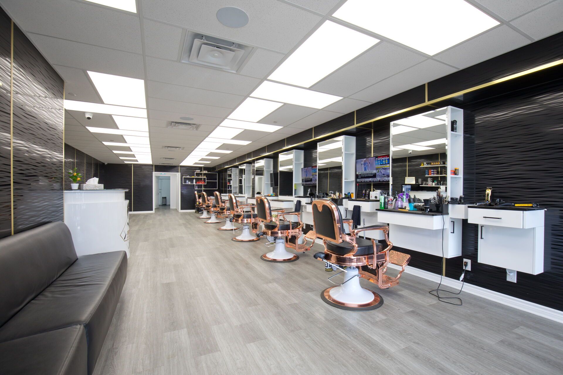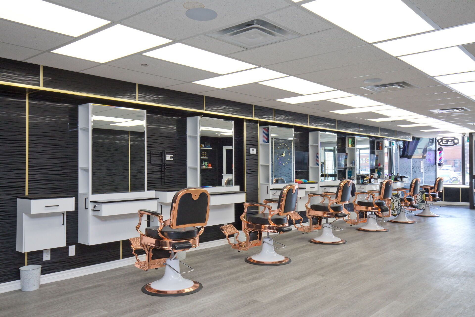 • Professionally designed interior with multiple barber chairs and modern equipment.