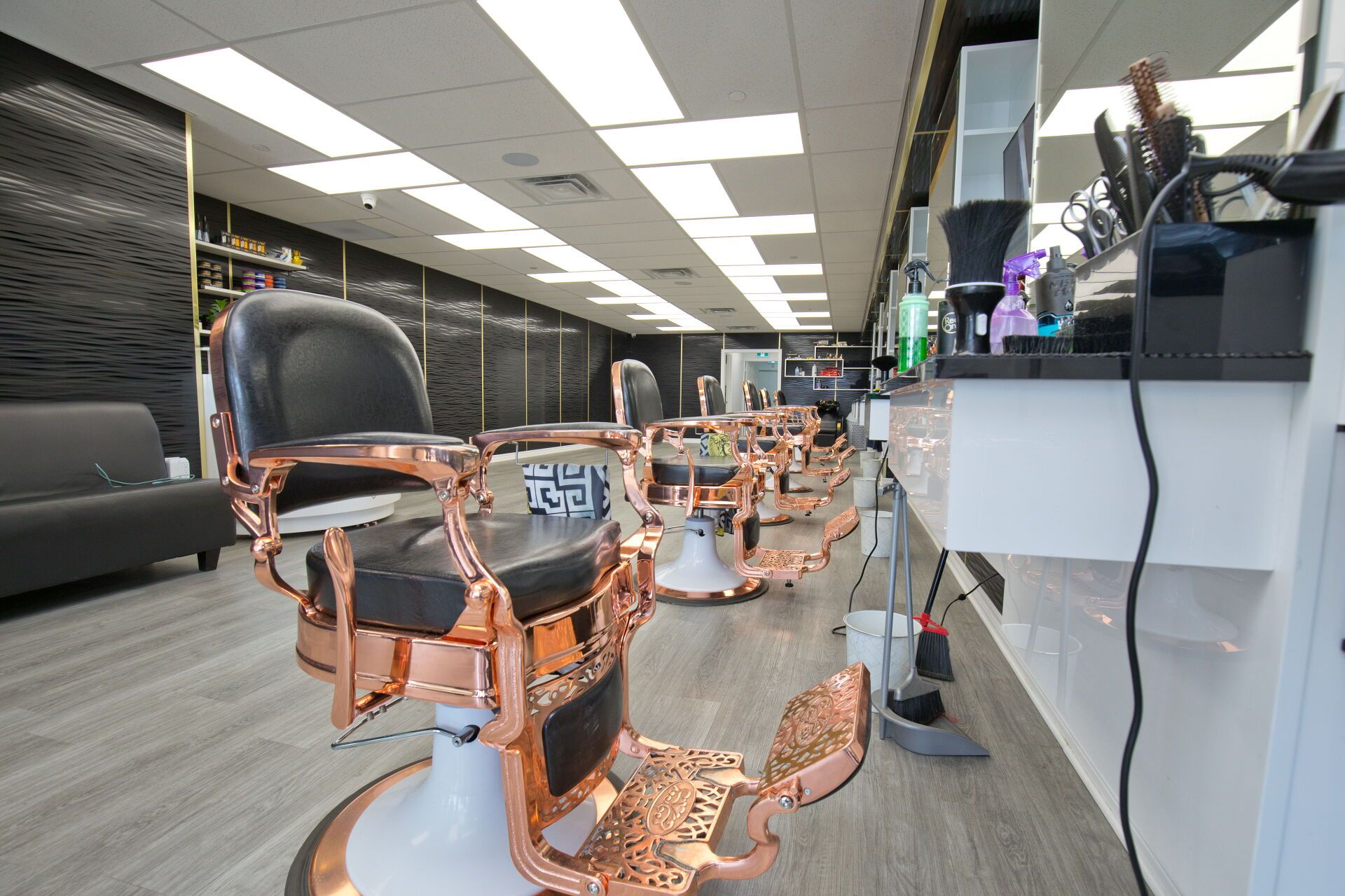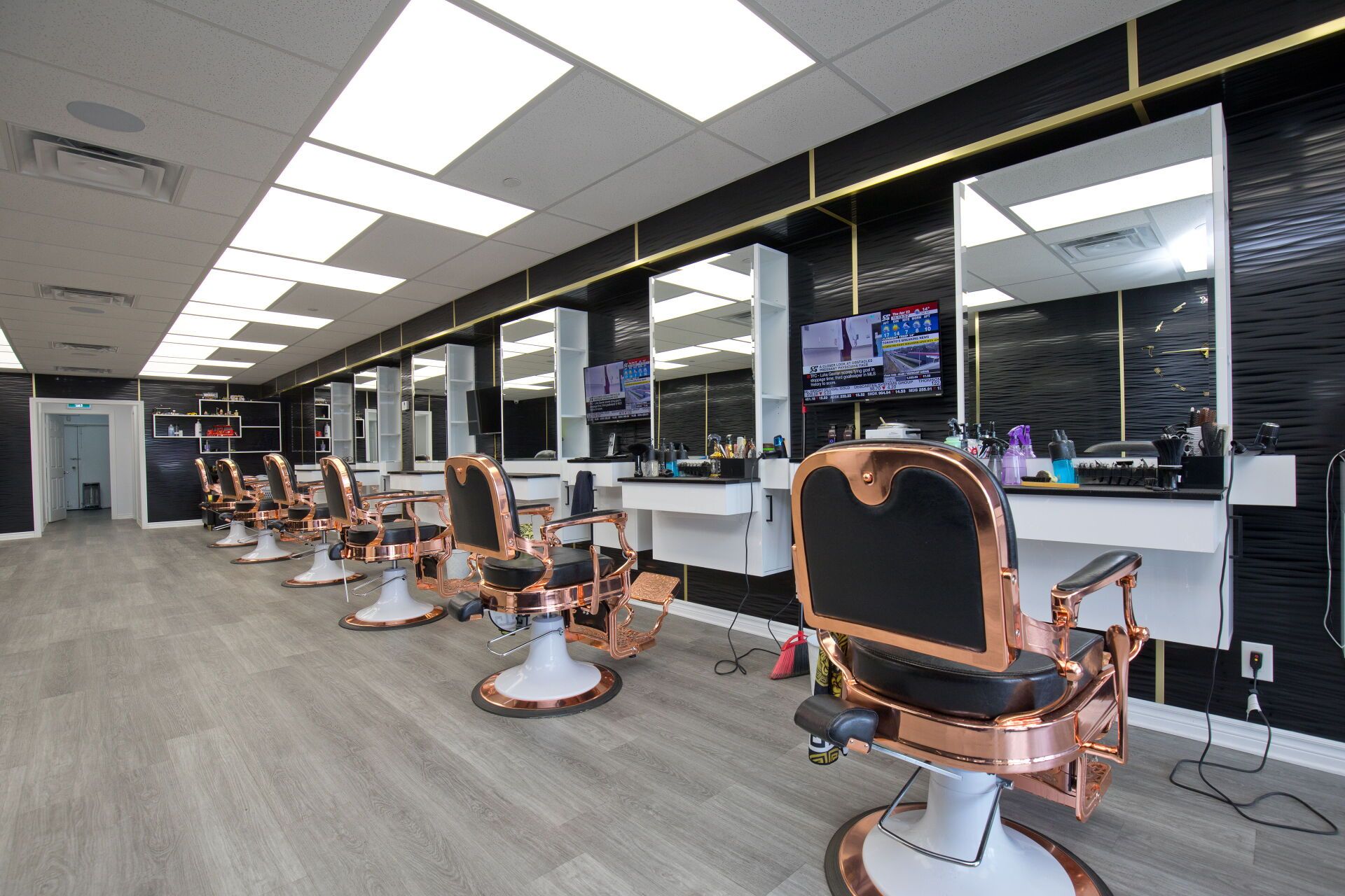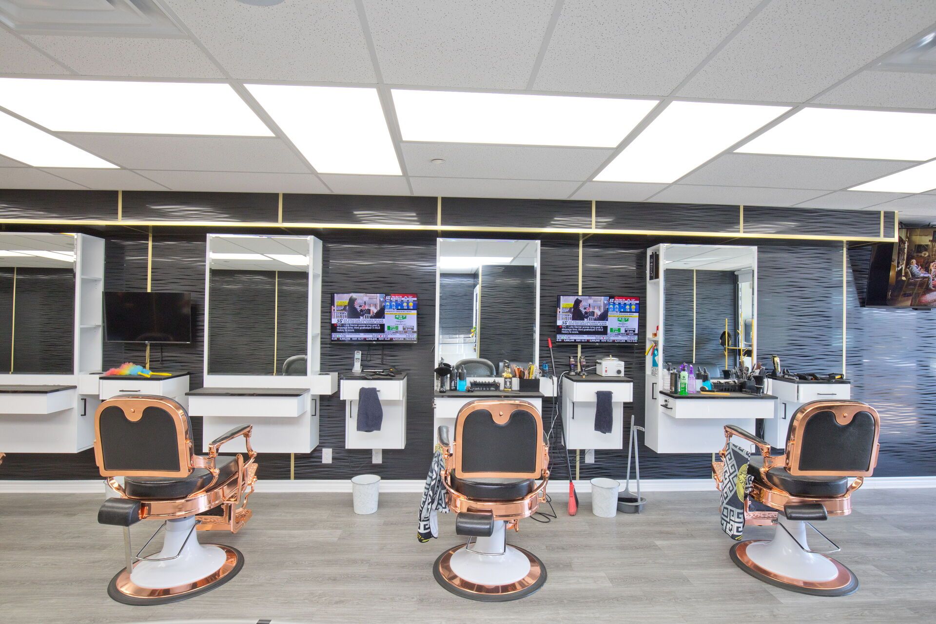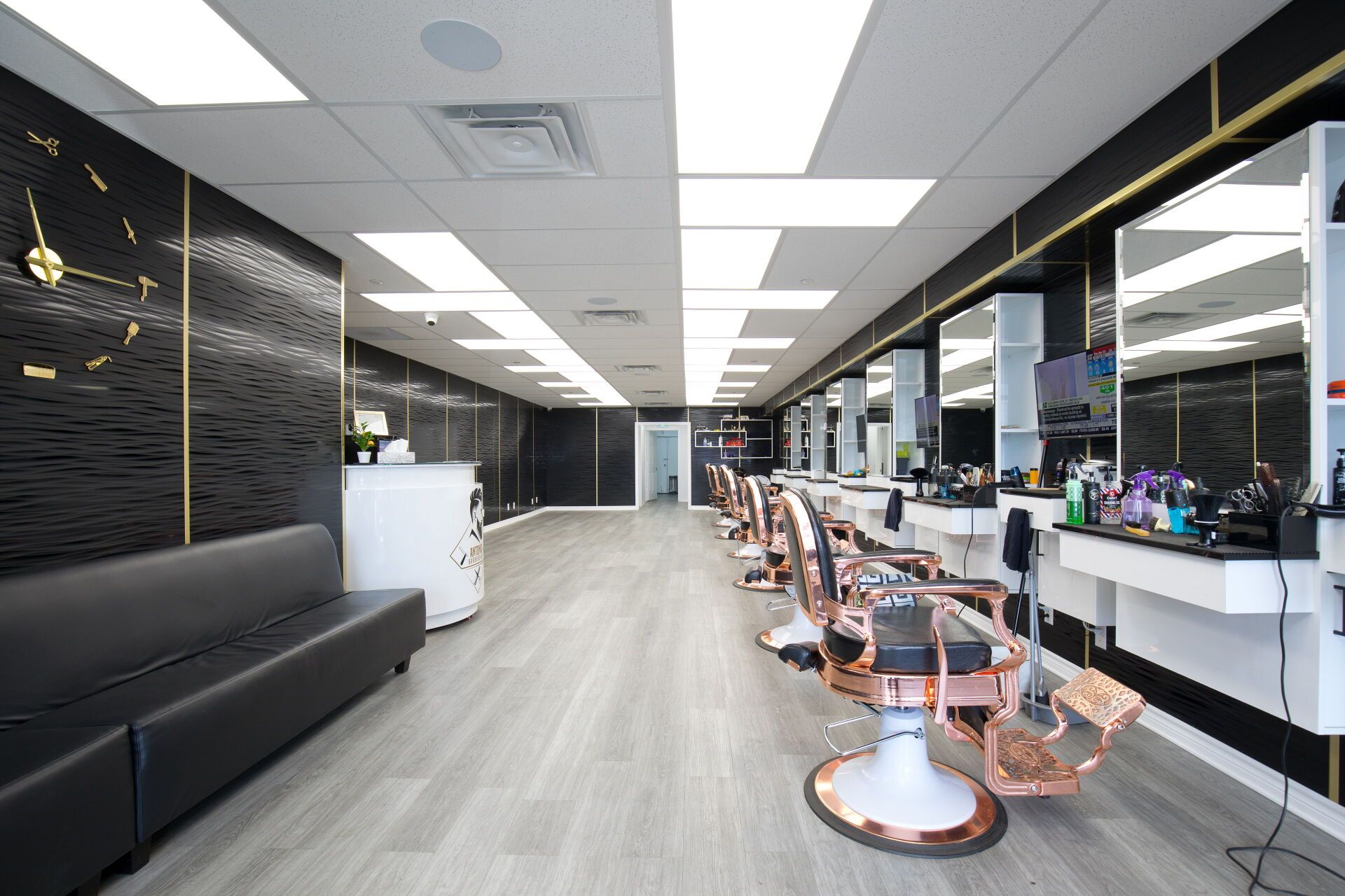 • Professionally designed interior with multiple barber chairs and modern equipment.