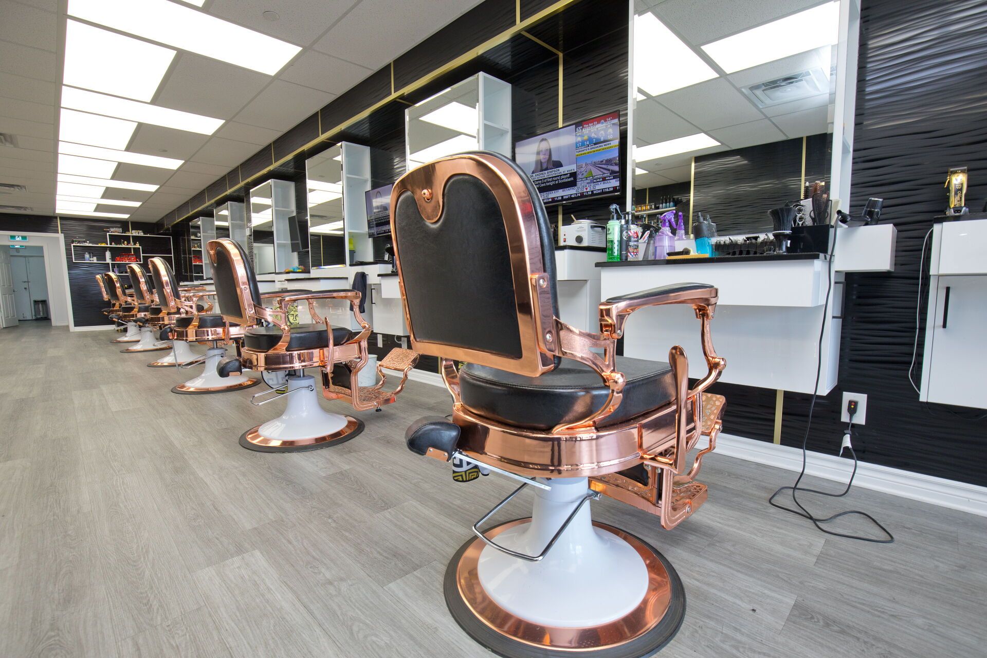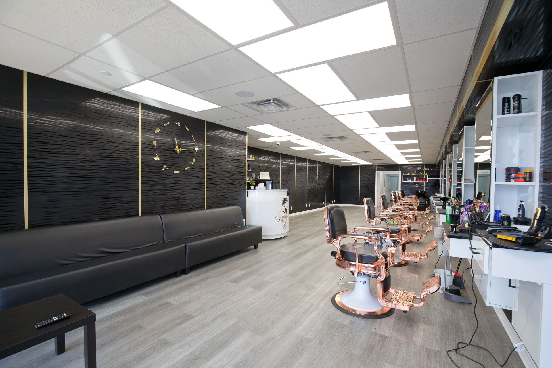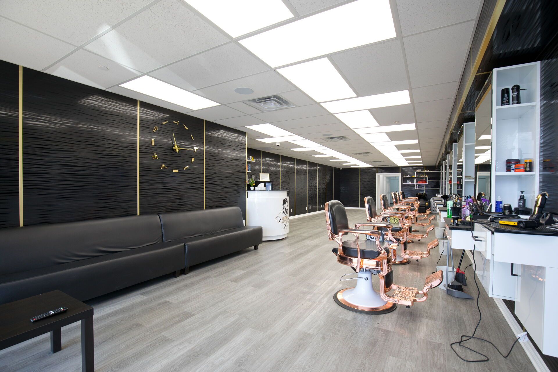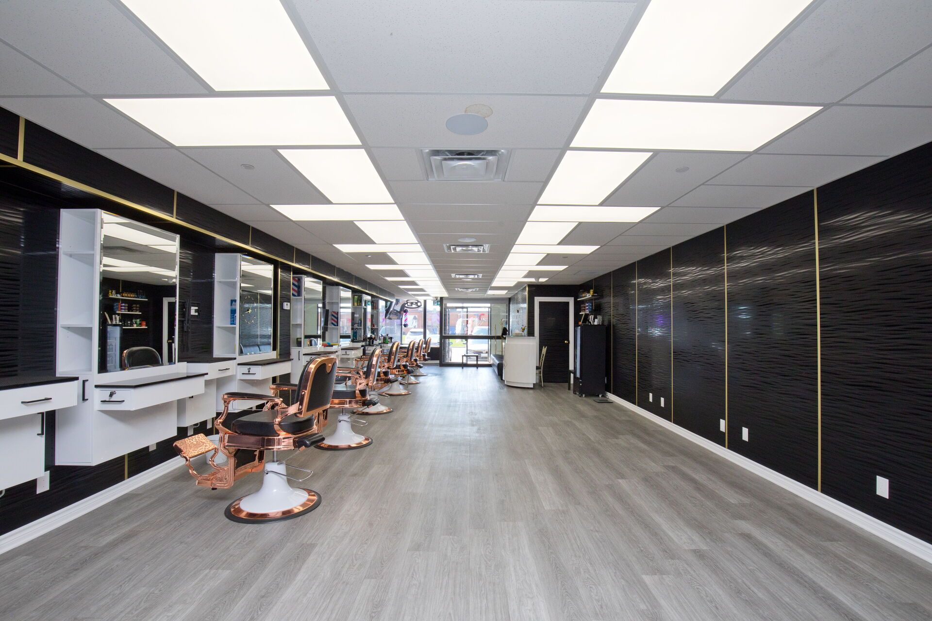 • Professionally designed interior with multiple barber chairs and modern equipment.