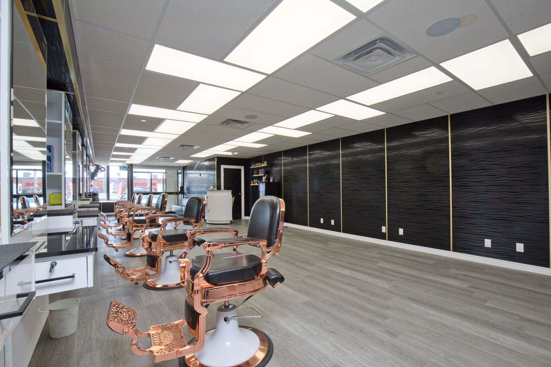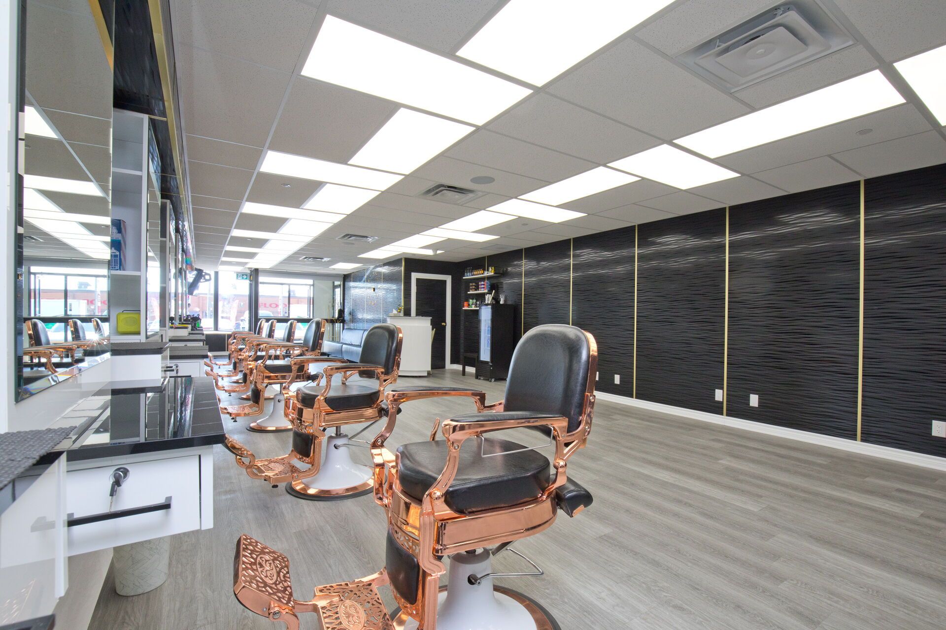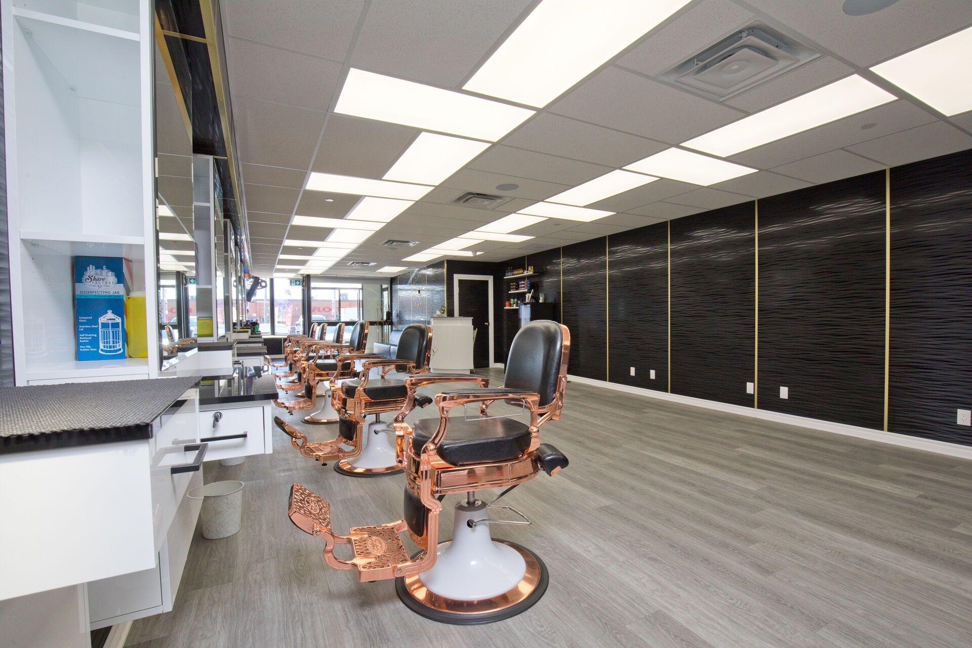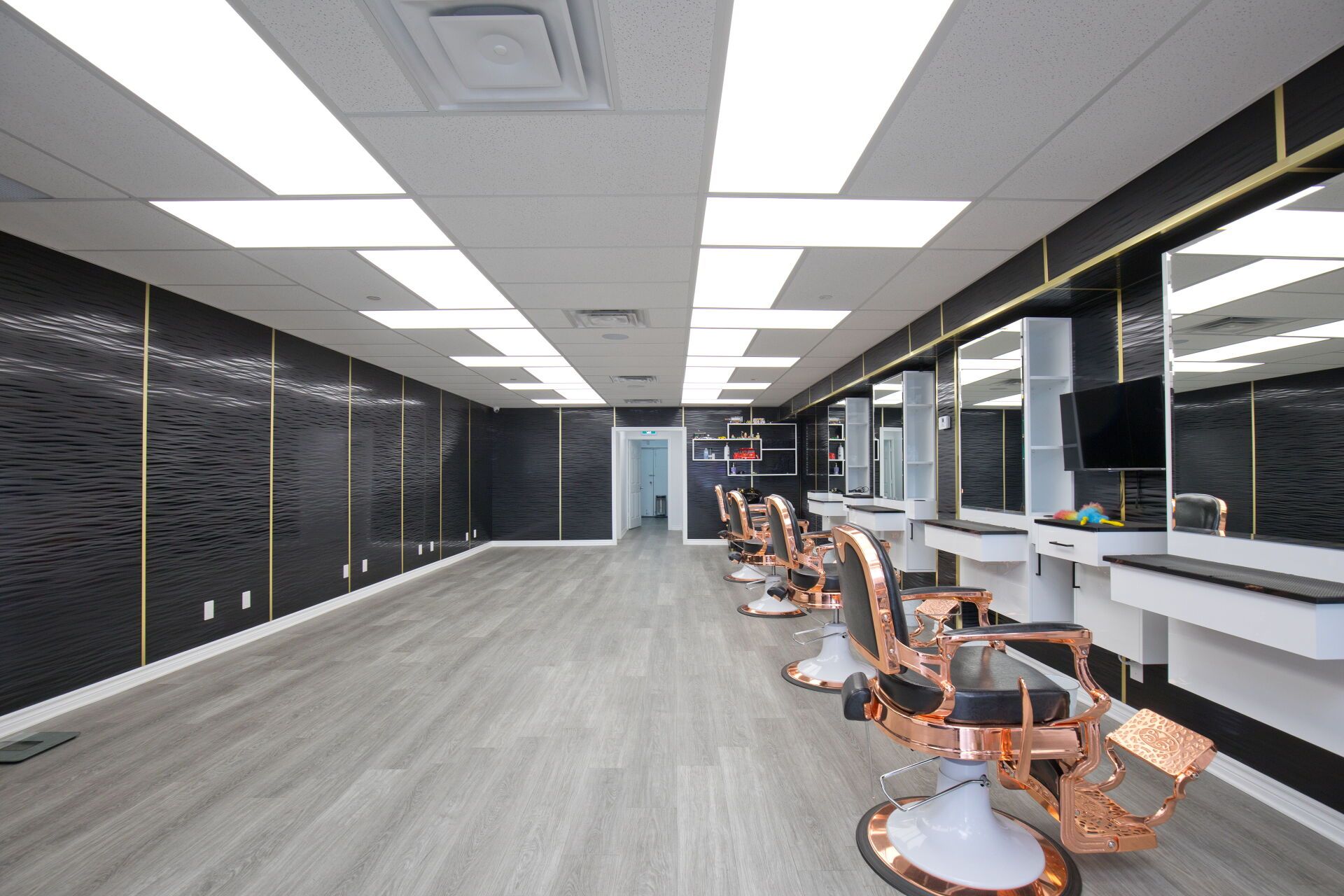 • Professionally designed interior with multiple barber chairs and modern equipment.