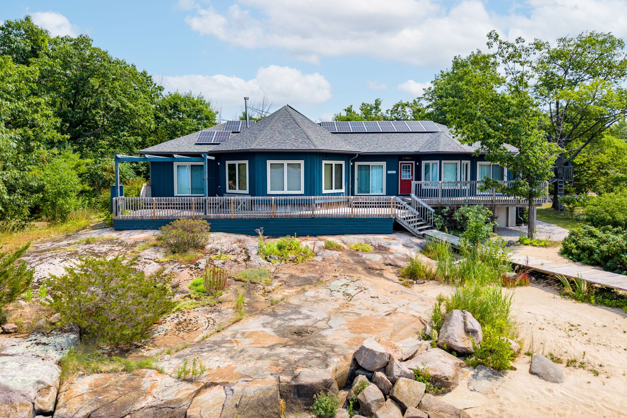 Wow what a view! You'll be amazed with the pristine views, privacy and all the creature comforts that come with this stunning four season cottage home on a massive west facing beachfront property complete with an oversized floating dock to deep water. The grounds are very walkable, flat granite plateaus for exploring and sports with a nice mix of indigenous trees and plants. The 4-bedroom fully furnished open concept fully appointed cottage has plenty of room for everyone with 2, 4 piece bathrooms and 1 powder room, laundry, wood and propane stoves for heating plus electric baseboard heat. There is a separate 2-bedroom guest cottage with porch, cozy living area and a 3 piece washroom. Out back there is a large garden and wood shed plus a very solid and weatherproof garage. The cottage is serviced by a whole house wired in generac generator, and the 200 amp electrical service is supported by a roof mounted solar panel system which reduces energy costs by 2/3. This is a spectacular property and has been well loved by the current owners for many years before they moved to the west coast.