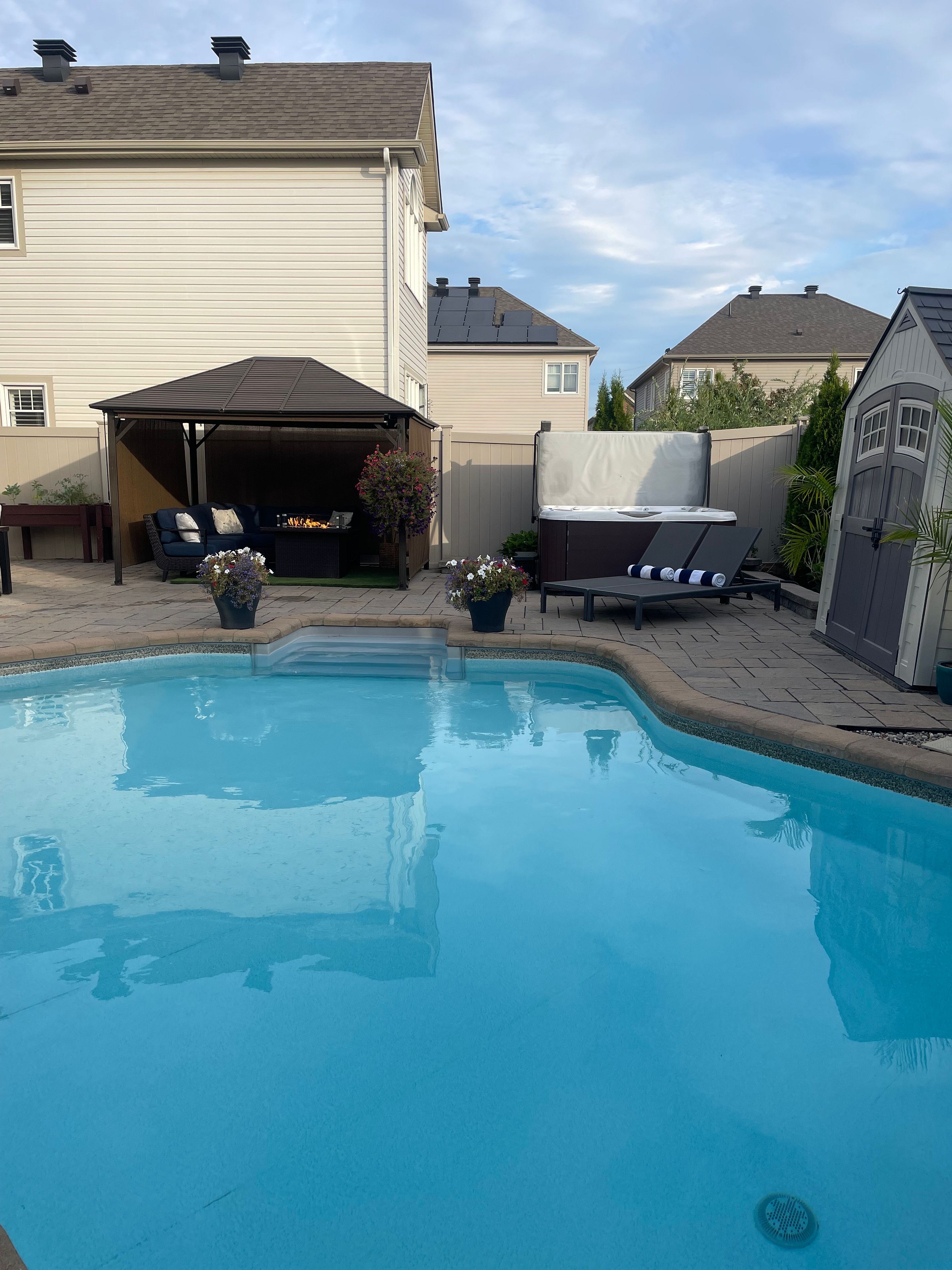 A beauty in blackstone! This 4-bed, 3. 5-bath monarch homes home showcases thousands in upgrades and an incredible backyard oasis designed for entertaining. Enjoy your own private retreat featuring a heated saltwater pool with a waterfall, interlock patio, and pvc fencing. The pool is equipped with a gas heater, summer and winter covers, and an additional set of filters for easy maintenance. A double interlock walkway and elegant front doors with stained glass and transom windows create an impressive first impression. Inside, the main level and upper hallway have been freshly painted by a professional. Hardwood flooring flows throughout the main level, complemented by tile in the foyer, kitchen, and bathrooms, along with a striking hardwood staircase with oak rails and iron spindles. The bright, open-concept living and dining areas feature large windows, recessed lighting, a tray ceiling, and a statement chandelier. The chef-inspired kitchen offers abundant cabinetry, subway tile backsplash, quartz countertops, a large island, modern hood fan, and stainless steel appliances. The family room overlooks the backyard, while a separate den provides the perfect home office or quiet workspace. Upstairs, the spacious primary suite features a walk-in closet and a luxurious ensuite with quartz countertops, dual sinks, a glass shower, and a relaxing soaker tub. Three additional bedrooms complete the level-two with walk-in closets, one with its own private ensuite, and two sharing a convenient jack-and-jill bathroom. The beautifully finished basement adds exceptional additional living space, perfect for a recreation room, home gym, or media area. With central vacuum, meticulous maintenance, and high-end finishes throughout, this exceptional home offers style, comfort, and functionality in one of blackstone's most desirable communities. Truly move-in ready!
