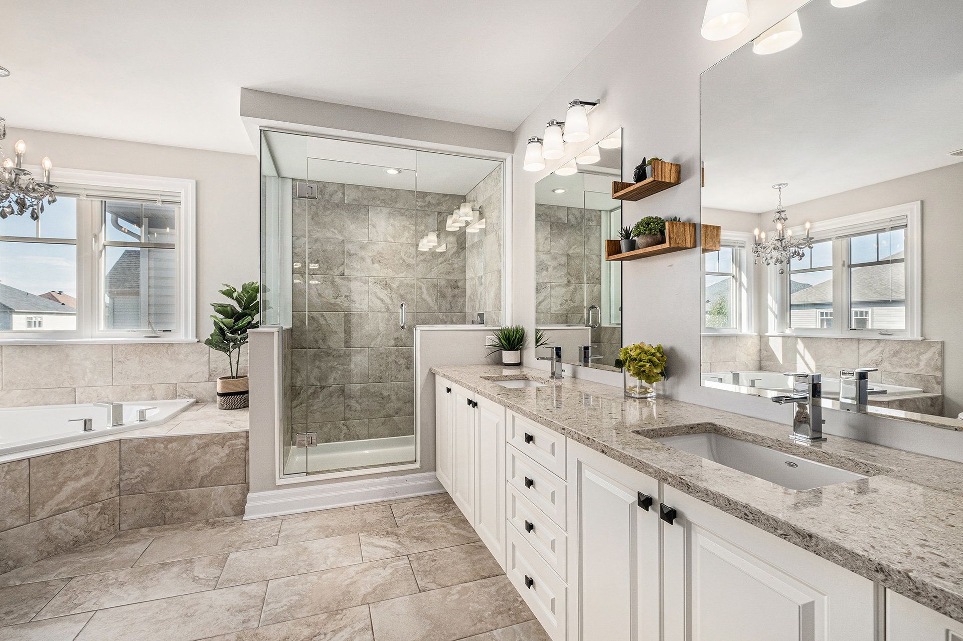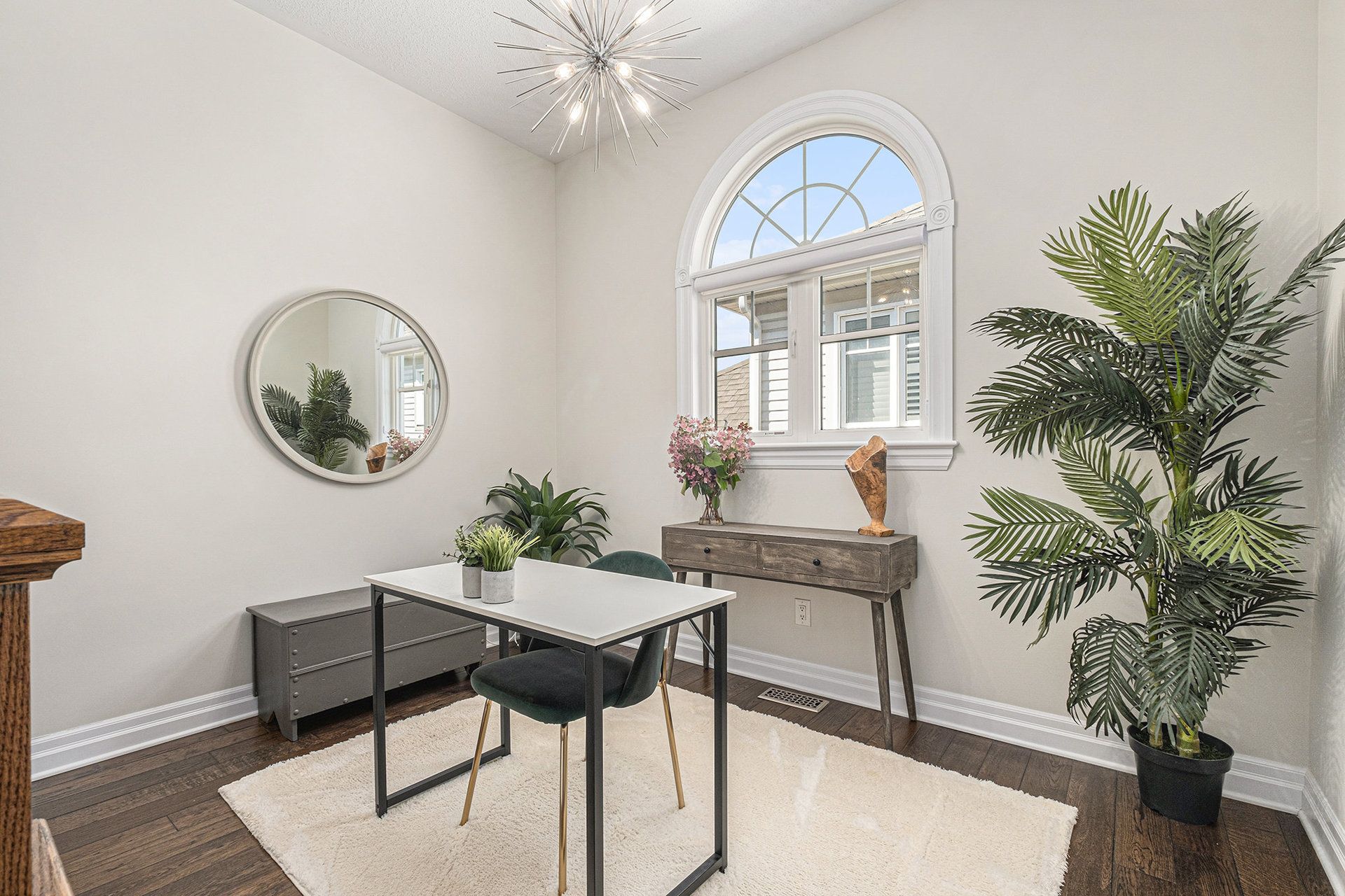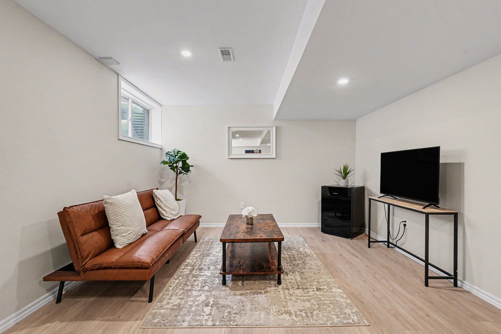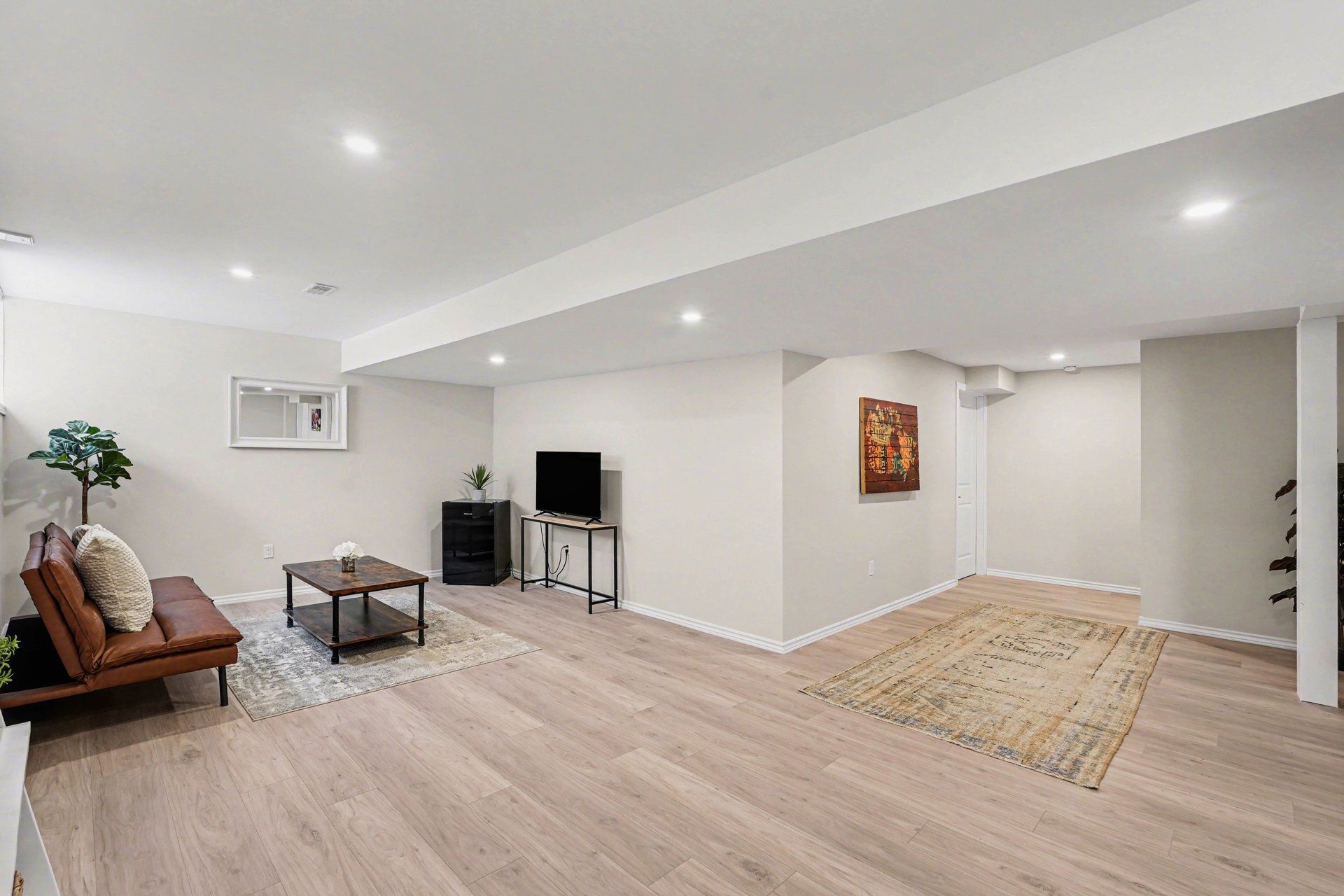 • Open-concept living areas with large windows and stylish chandelier for bright ambiance.