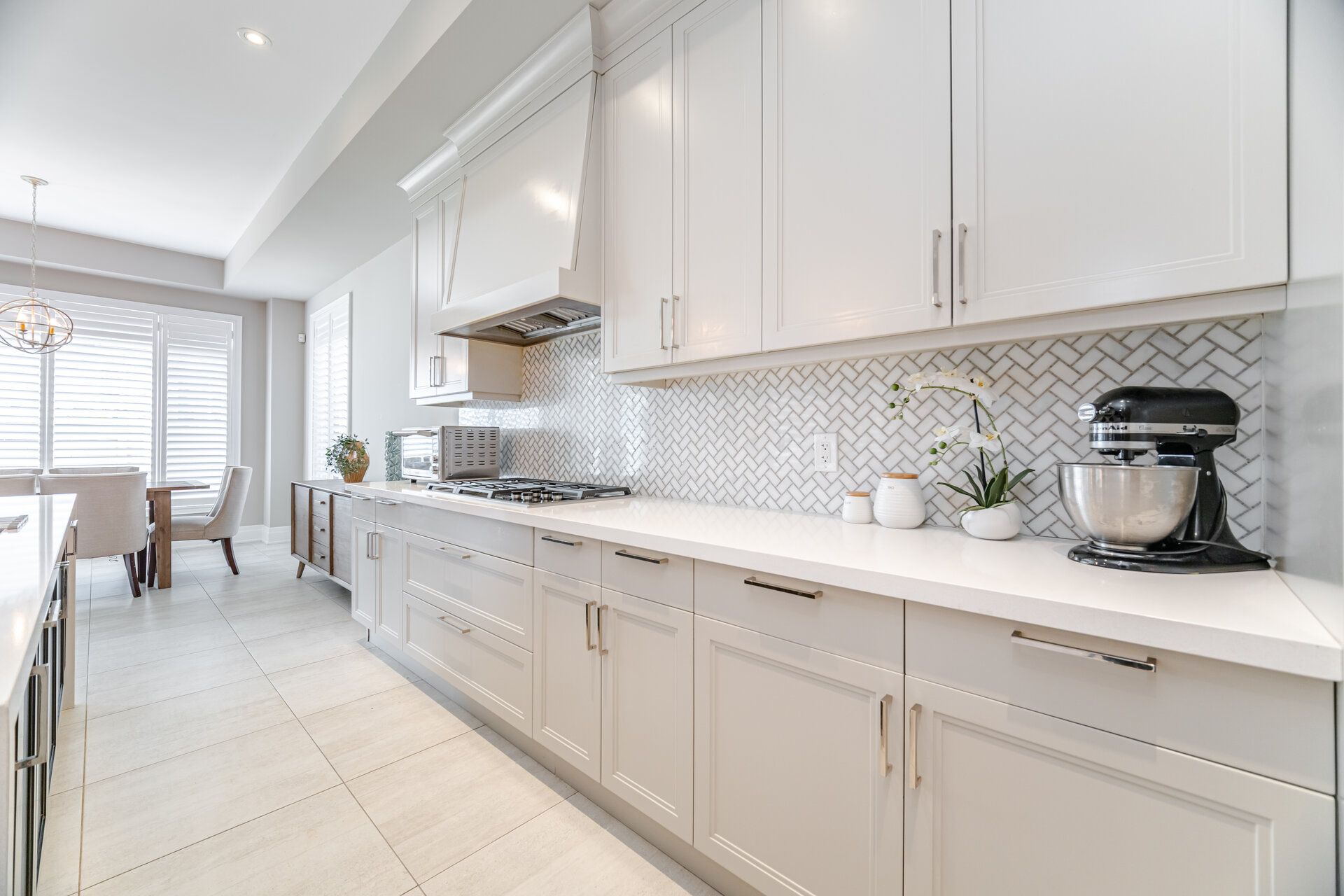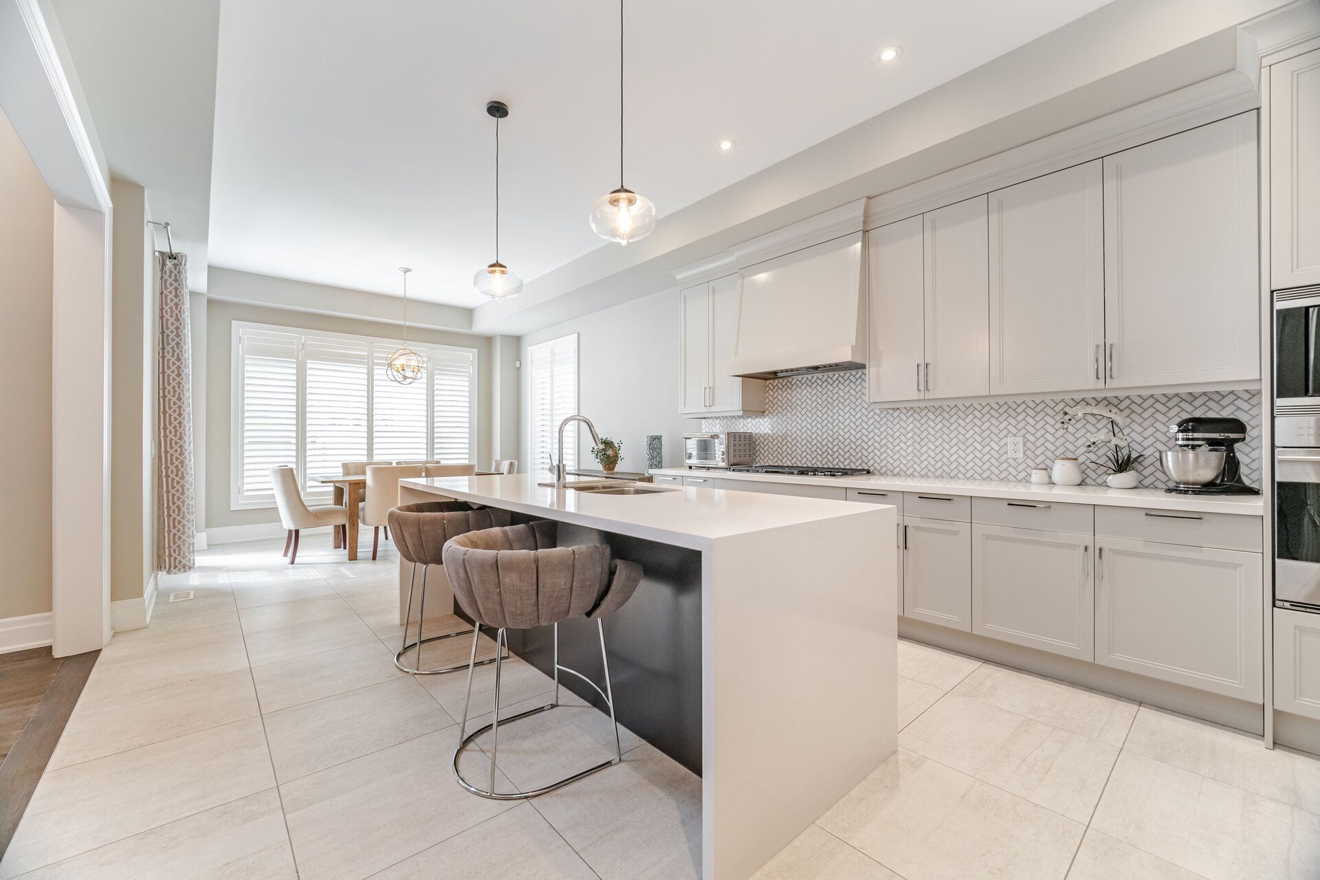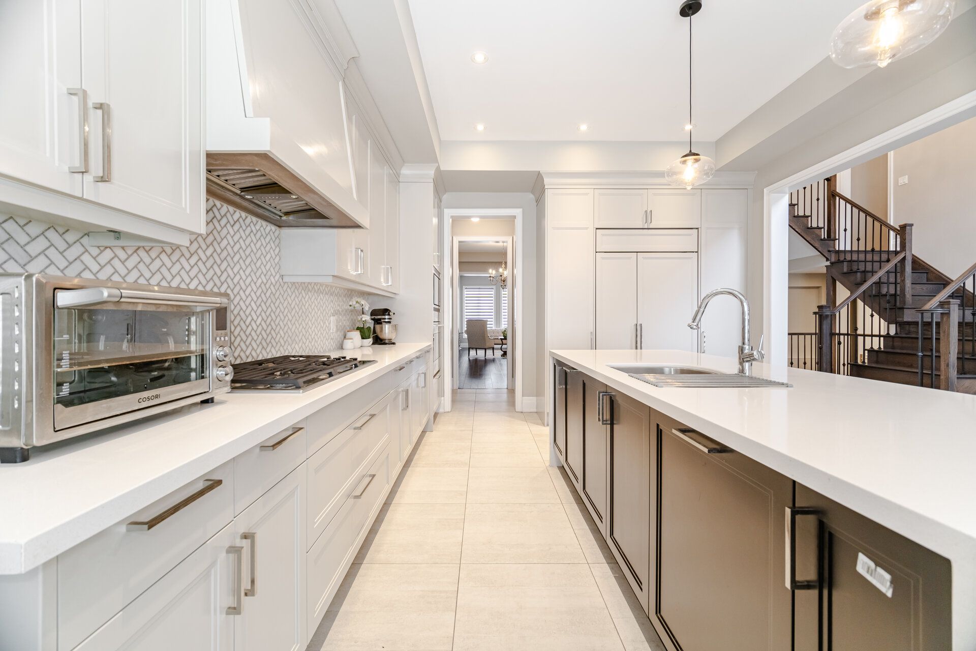 • Custom kitchen cabinetry with quartzite counters and high-end finishes.