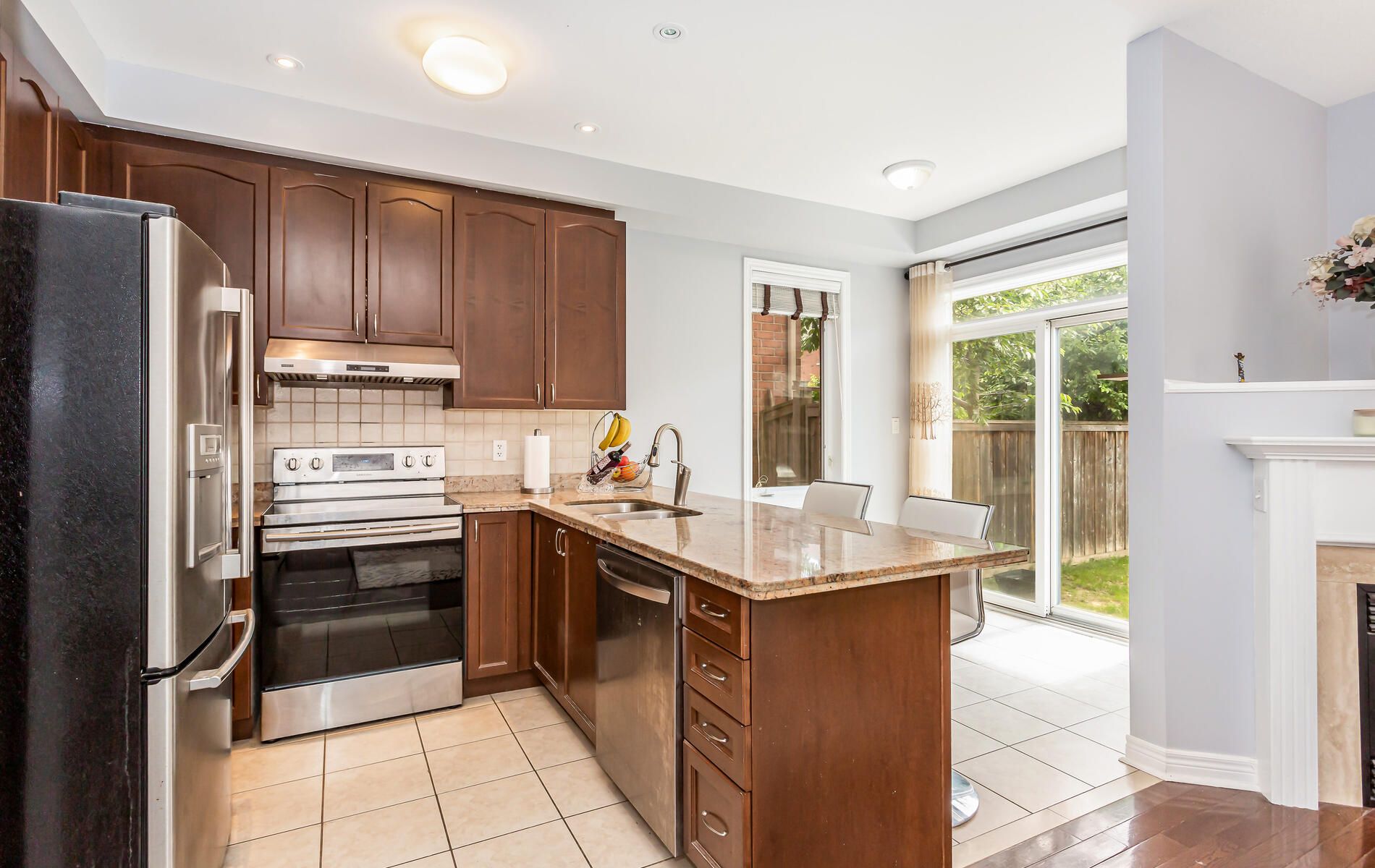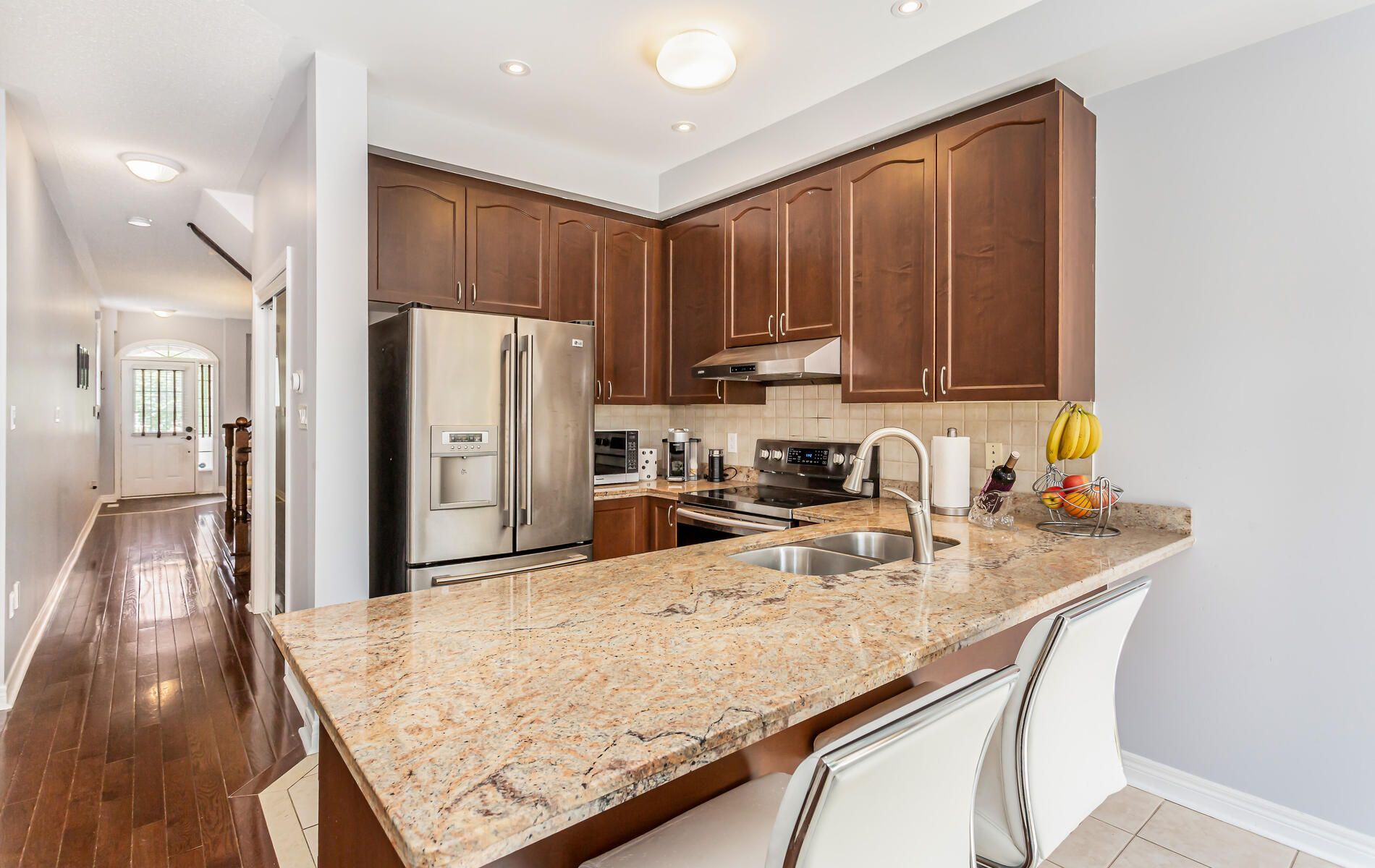 • Open concept kitchen with quartz countertops and stainless steel appliances.