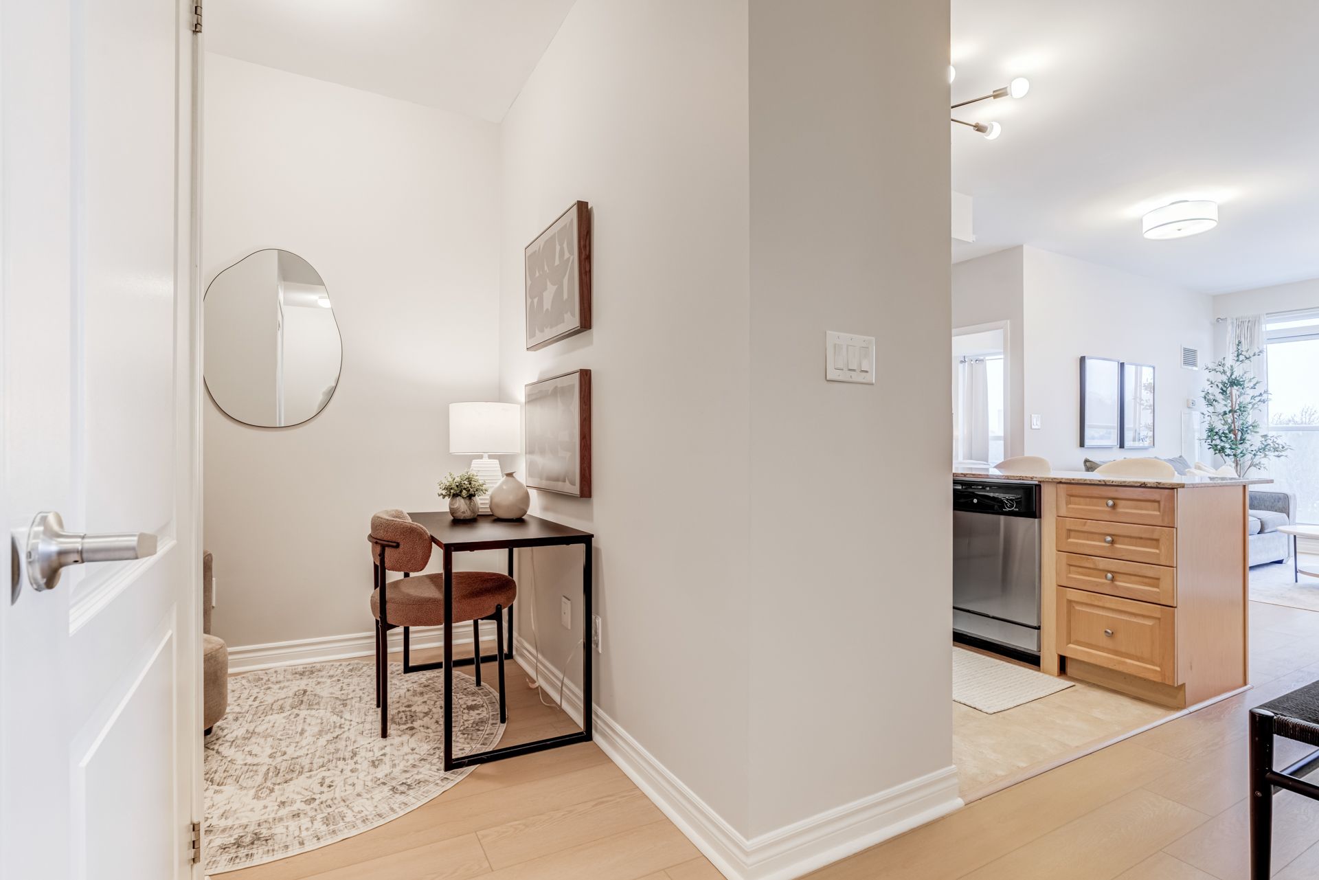 Welcome to aquaview condominiums in historic long branch, just steps from marie curtis park and the shores of lake ontario. Enjoy convenient commuting with easy access to long branch go station (approximately 23 minutes to union station), as well as nearby access to highway 427 and the qew. Close to golf courses and shopping at sherway gardens. This 1+1 bedroom suite with 9 ft ceilings offers a functional and well-designed layout, featuring newly installed vinyl plank flooring, large windows, and two juliet balconies. The spacious den provides flexibility for a home office or additional living space. The king-sized primary bedroom includes a double closet, and a glass sliding door. The open-concept living, dining, and kitchen area includes a breakfast bar and offers a practical flow for everyday living and entertaining. Building amenities include visitor parking, fitness centre, party room, and a sixth-floor outdoor terrace with bbqs and a hot tub. Ground-level conveniences include a physiotherapist, walk-in medical clinic, dentist, and pharmacy. Within walking distance to no frills, shoppers drug mart, and lcbo. Enjoy lakeside living with nearby parkland, trails, beach, splash pad, playground, and dog park.