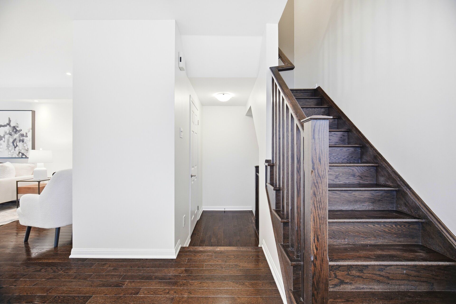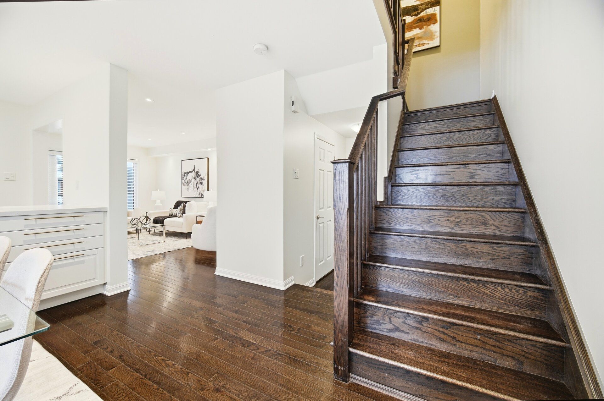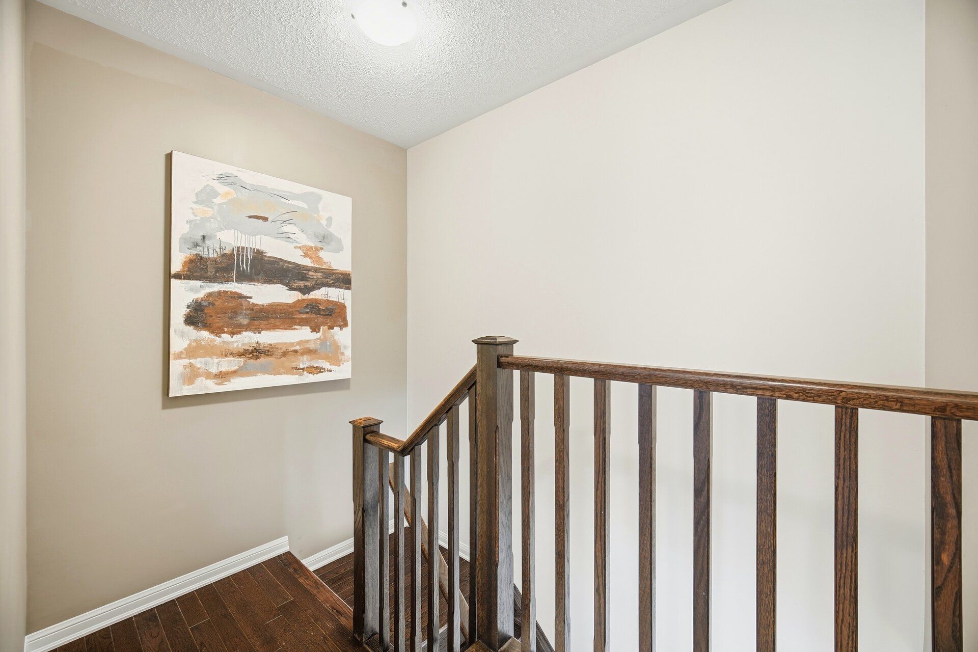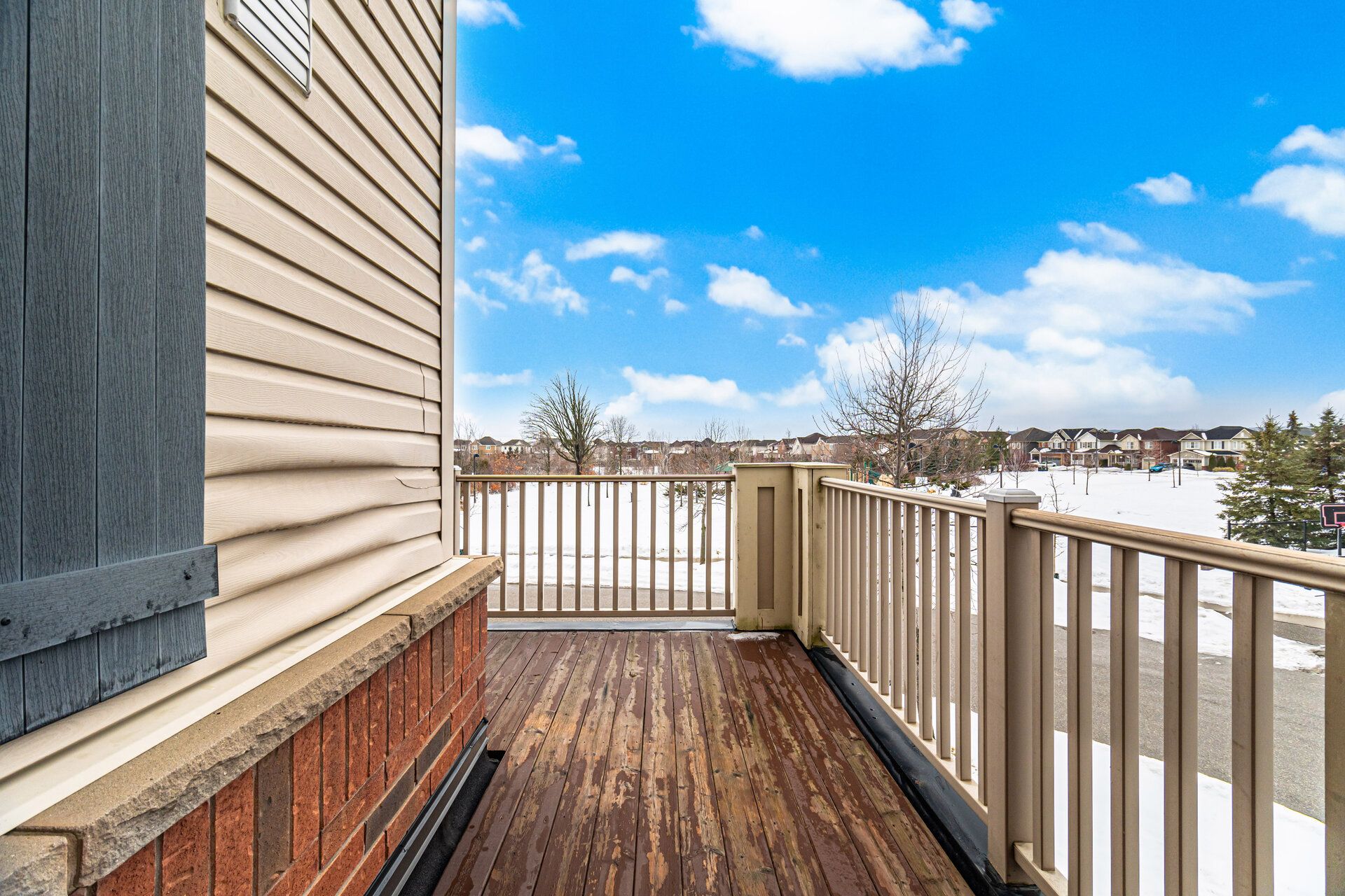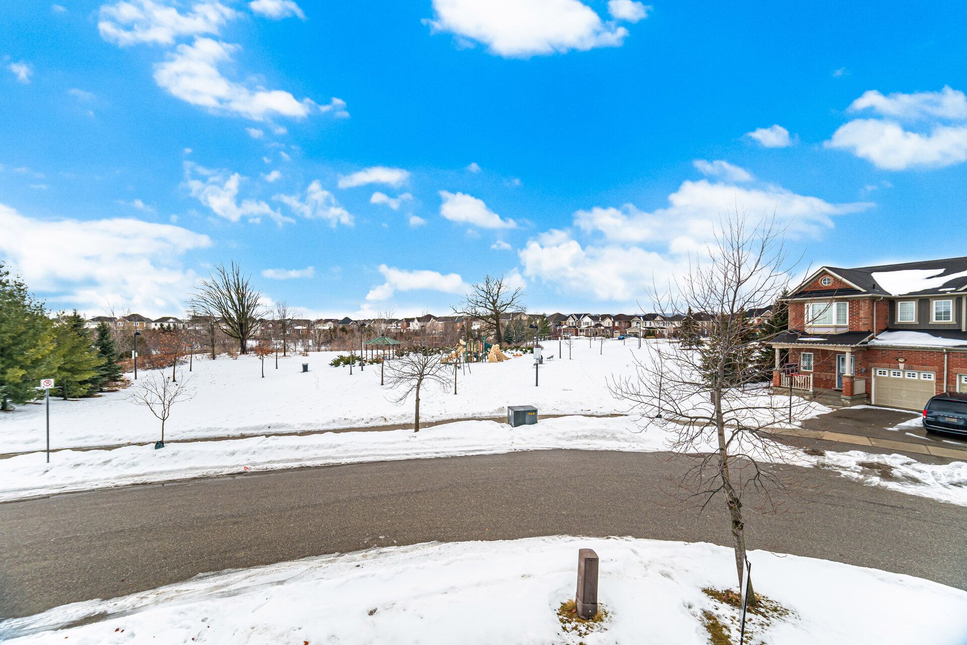 *** rare end unit like a semi *** sun-filled move-in ready freehold townhouse - no maintenance fees no potl - overlooking leiterman park from all windows! Situated on a quite premium corner lot w/large wrap around balcony & front yard porch - offering a coated garage floor and a double car in-tandem driveway parking w/inside entry through garage. The classy dark oak stairs and hardwood floor opens the 2nd floor to a bright living room, separate dining room, powder room, and tastefully upgraded kitchen with oversized quartz countertop, spacious deck overlooking the park. Third floor features a big primary bedroom with 3pcs ensuite and w/i closet, a 2nd spacious bedroom, and a 4pcs bath. The ground floor opens to an ample entrance space, a 3rd bedroom that offers a versatile options of use. **enjoy living in a sunny home while watching your kids playing in the park**