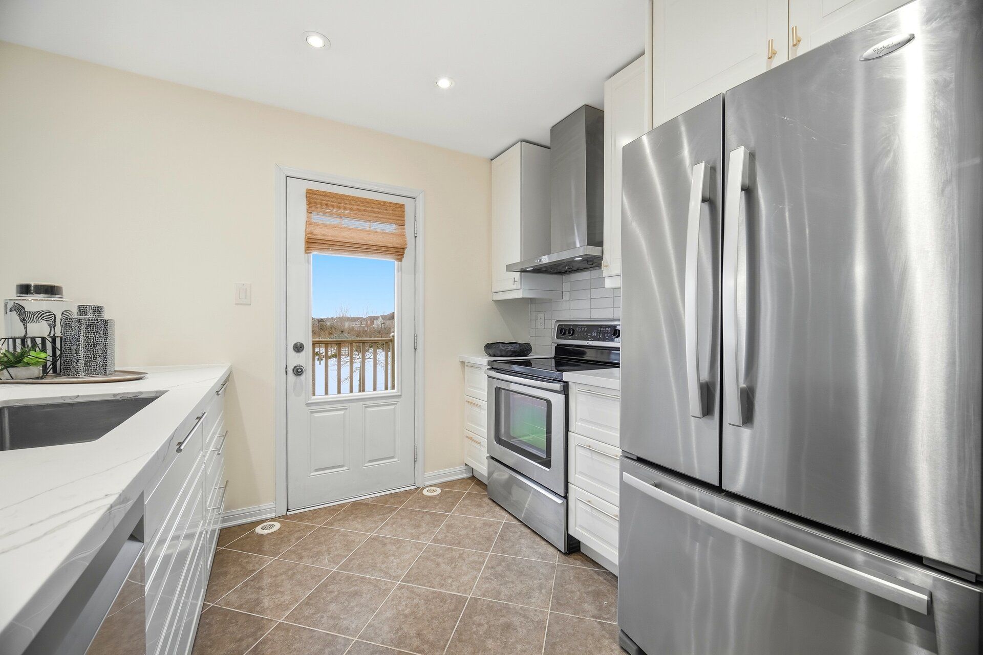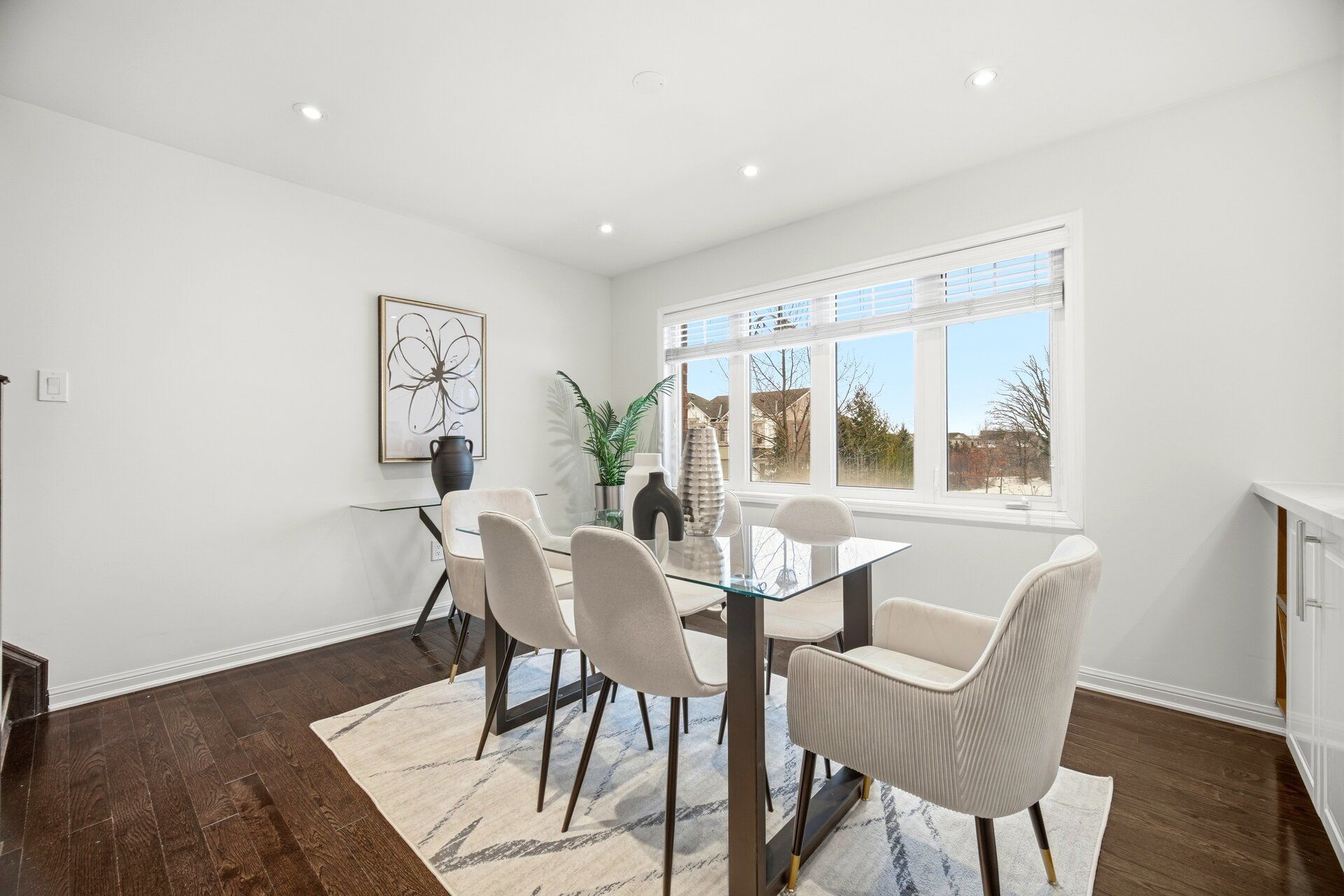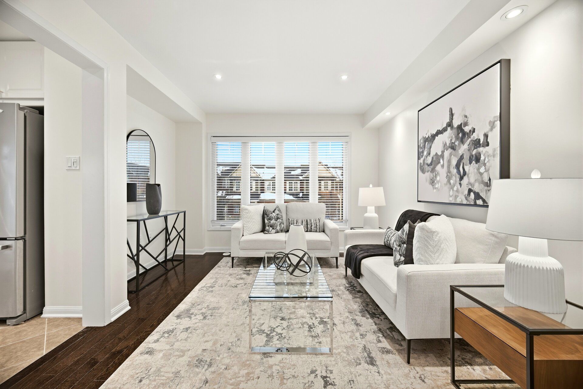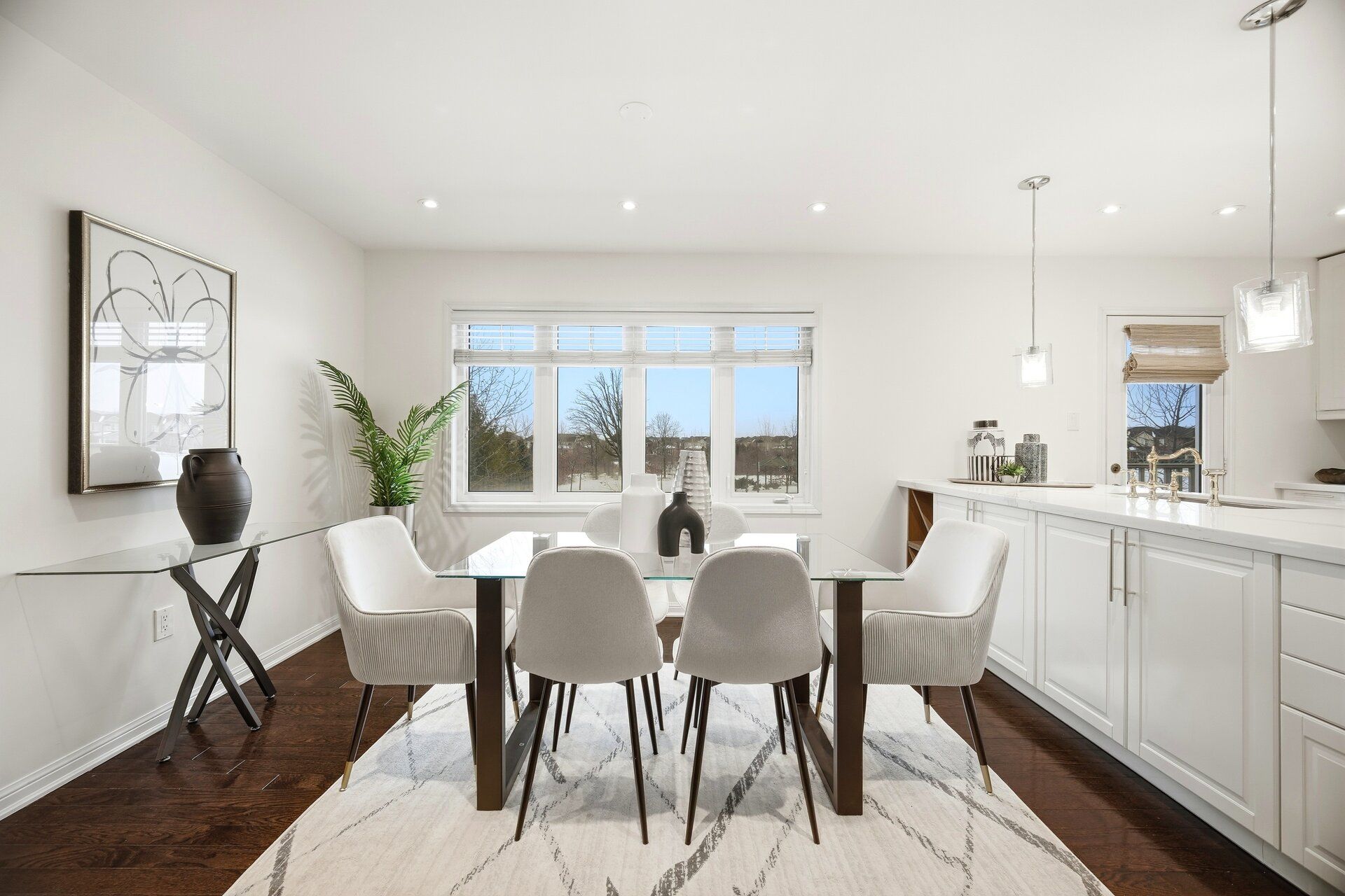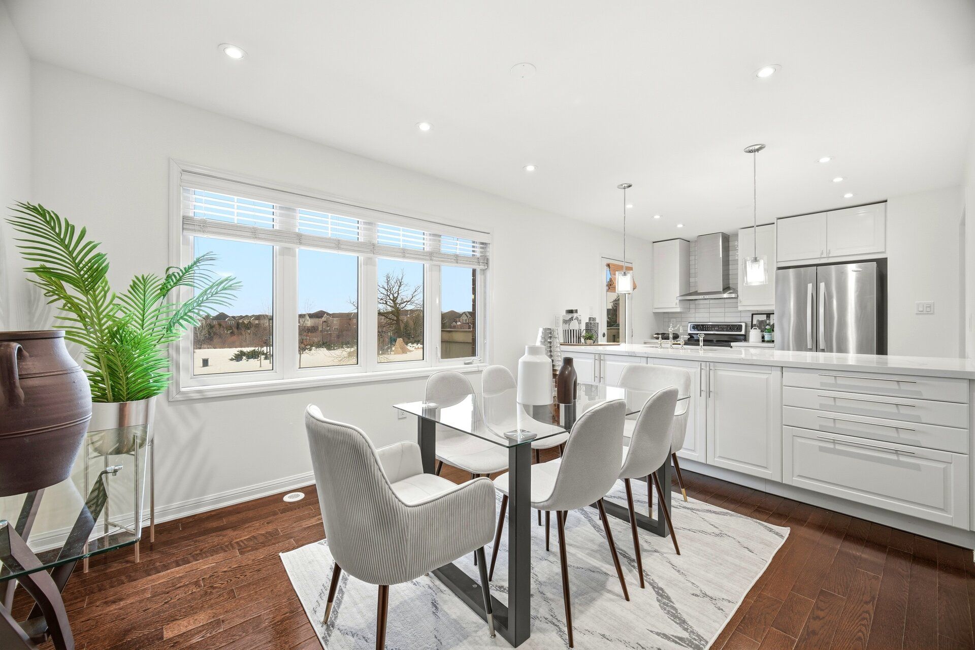 *** rare end unit like a semi *** sun-filled move-in ready freehold townhouse - no maintenance fees no potl - overlooking leiterman park from all windows! Situated on a quite premium corner lot w/large wrap around balcony & front yard porch - offering a coated garage floor and a double car in-tandem driveway parking w/inside entry through garage. The classy dark oak stairs and hardwood floor opens the 2nd floor to a bright living room, separate dining room, powder room, and tastefully upgraded kitchen with oversized quartz countertop, spacious deck overlooking the park. Third floor features a big primary bedroom with 3pcs ensuite and w/i closet, a 2nd spacious bedroom, and a 4pcs bath. The ground floor opens to an ample entrance space, a 3rd bedroom that offers a versatile options of use. **enjoy living in a sunny home while watching your kids playing in the park**