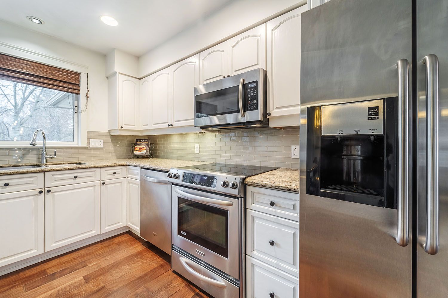 • Renovated kitchen with stainless steel appliances and granite countertops.