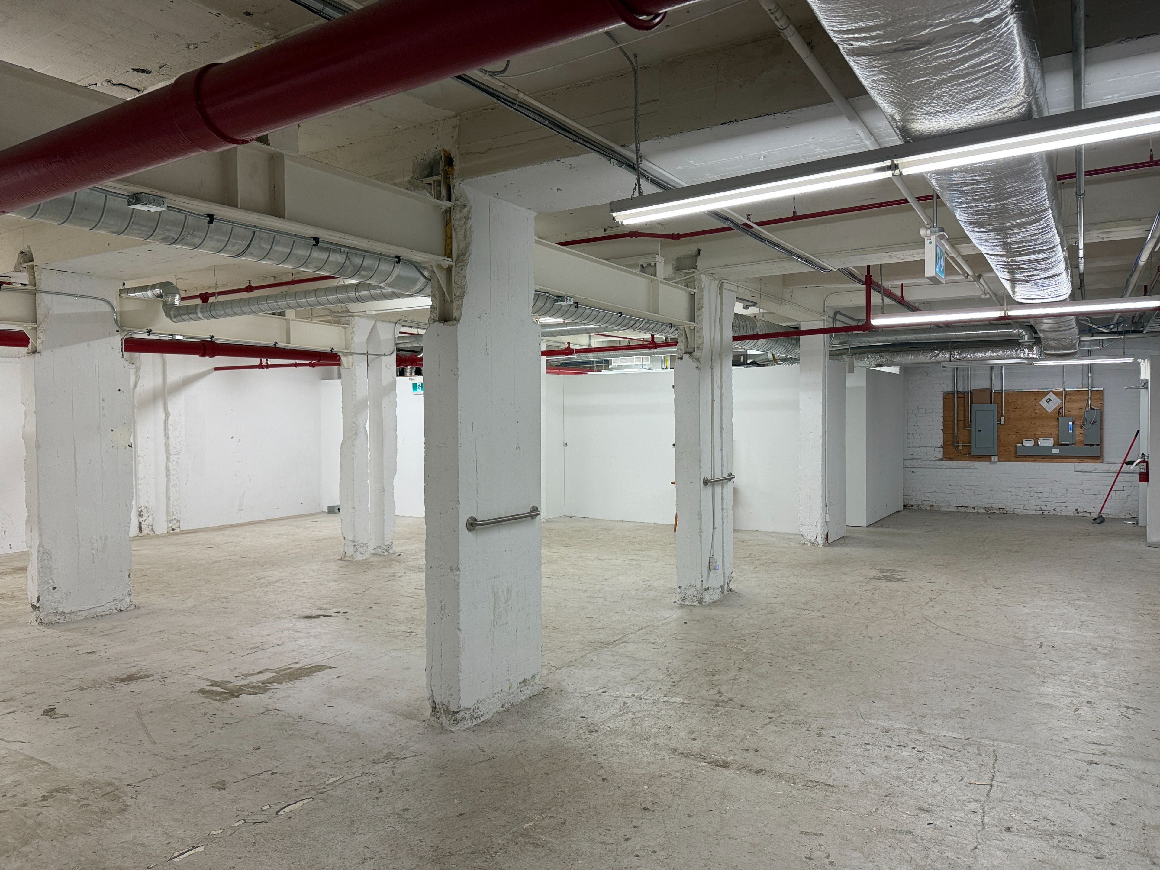 High-ceiling unit with private carlaw entrance, windows, employee kitchen, mezzanine, and large meeting room. Well suited for warehousing or recreational uses.
