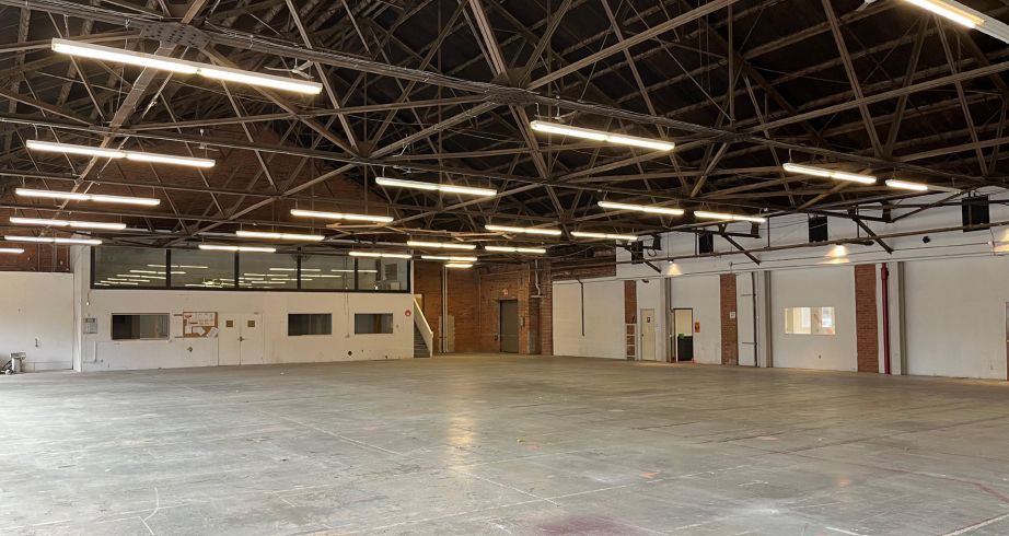 High-ceiling unit with private carlaw entrance, windows, employee kitchen, mezzanine, and large meeting room. Well suited for warehousing or recreational uses.
