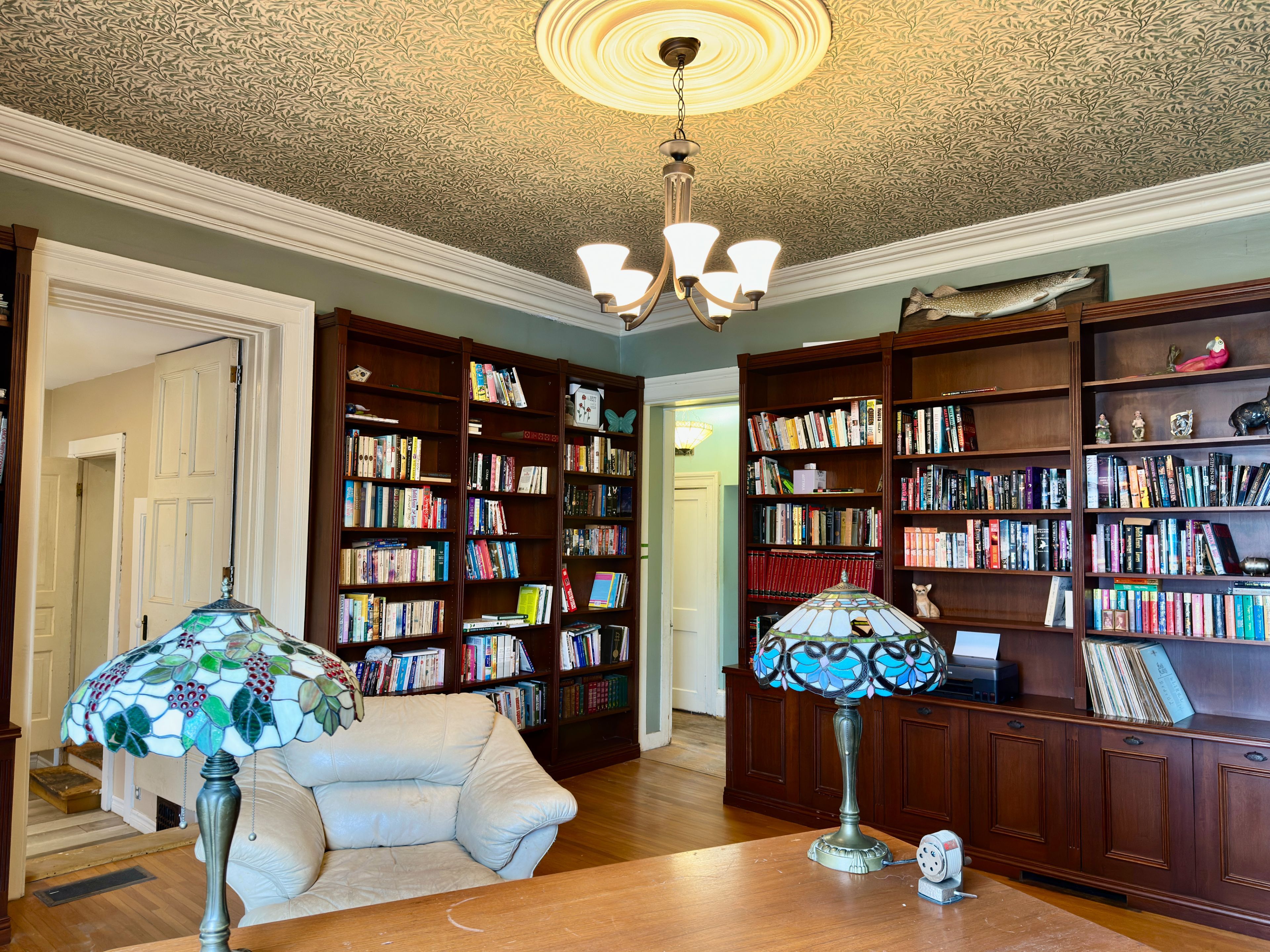 • Unique library with a decorative ceiling, ideal for reading or work.