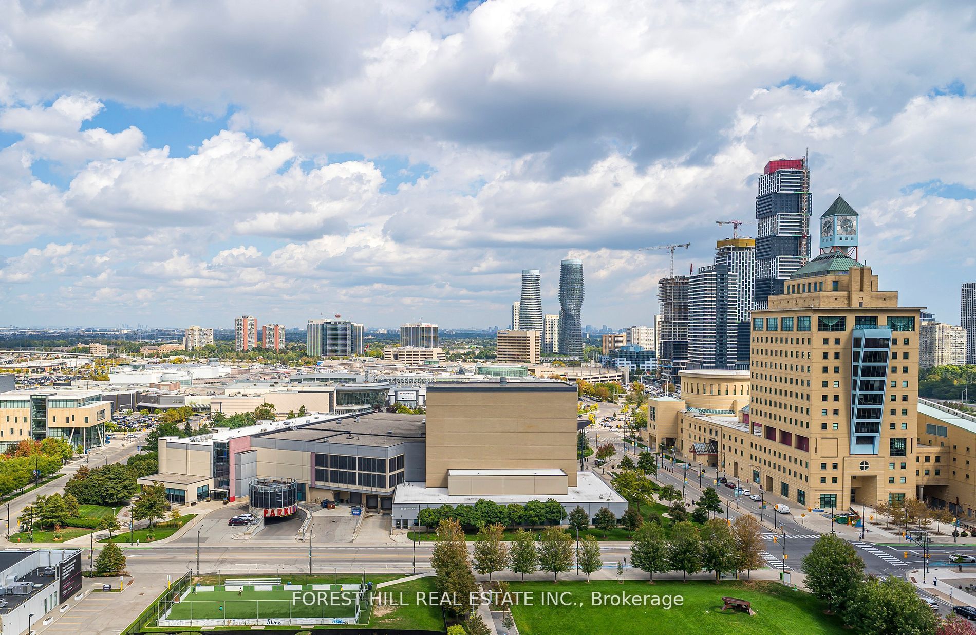 Come marvel at a beautifully expansive living opportunity that will make all visitors jealous! This lofty, and efficient layout will make even the most particular buyer will appreciate! This sun-soaked, southwest facing unit is one of the best in the building! Overlooking the bustling scenery of nature, and downtown mississauga, you can bask on your beautiful patio overlooking everything, and anything the eye desires. Just steps from square one, celebration square, excellent restaurants/cafe, and more of the best that mississauga has to offer! Public transit, and the 403 just minutes away - you could be at work in no time! Access to some of the best amenities the city can offer! 24 hour concierge, pool, gym, sauna, rooftop patio, visitor parking, party room, and guest suites!