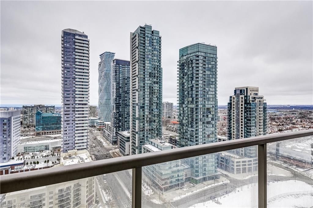Welcome to elevated living at one park tower by daniels, where comfort, style, and location come together in the heart of mississauga's vibrant city centre. From the moment you step inside this fully upgraded corner suite, you feel the difference. Soaring 9-foot ceilings, smooth ceiling is accentuated with elegant crown molding creating an airy, refined atmosphere. Natural light pours in through expansive windows that highlight the carpet-free floors and thoughtfully curated upgrades throughout. Every detail has been considered from custom closet organizers that keep life beautifully streamlined to upgraded light fixtures and tailored window coverings that complete the space awaiting your personal touch. The kitchen is both functional and sophisticated, featuring custom backsplash, quartz countertops, stainless steel appliances, and a breakfast bar that invites casual mornings and effortless entertaining. The open-concept living and dining area flows seamlessly to a private balcony, where southwest panoramic views stretch across the skyline, the perfect backdrop for sunset evenings and quiet moments above the city. With two spacious bedrooms, a versatile den ideal for a home office, and two beautifully appointed bathrooms, this home offers flexibility for professionals, families, or anyone craving a little extra space. Step outside and you're just moments from square one shopping centre, celebration square, top restaurants, transit, and the go station, with quick access to all major highways for an easy commute. Residents enjoy resort-style amenities including 24-hour concierge, an indoor pool and hot tub, fully equipped gym, rooftop party room, golf simulator, and ample visitor parking. This unit comes with a private parking spot and a private locker room next to the parking spot on p1. This is more than a condo, it's a lifestyle in one of mississauga's most sought-after addresses.