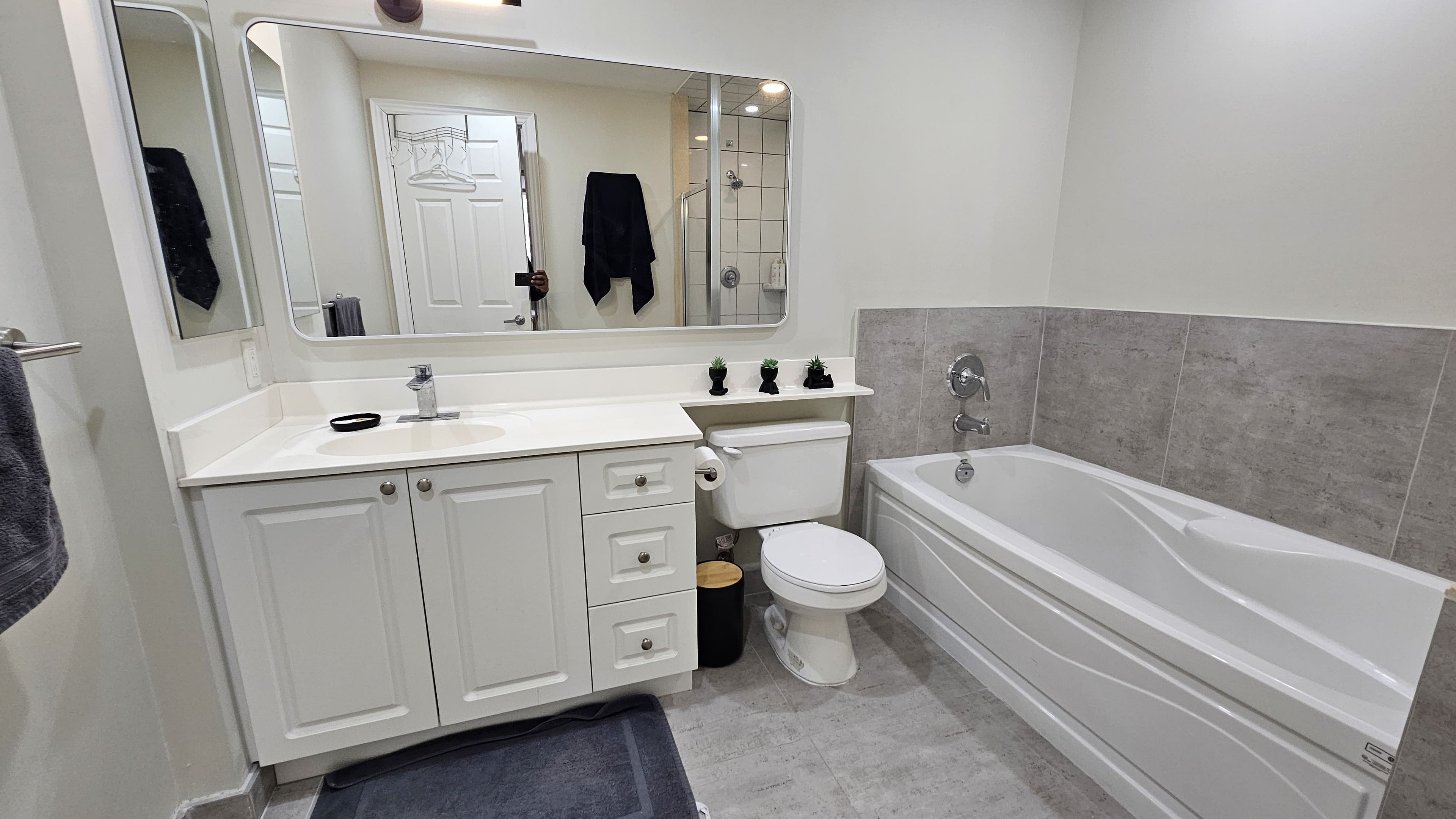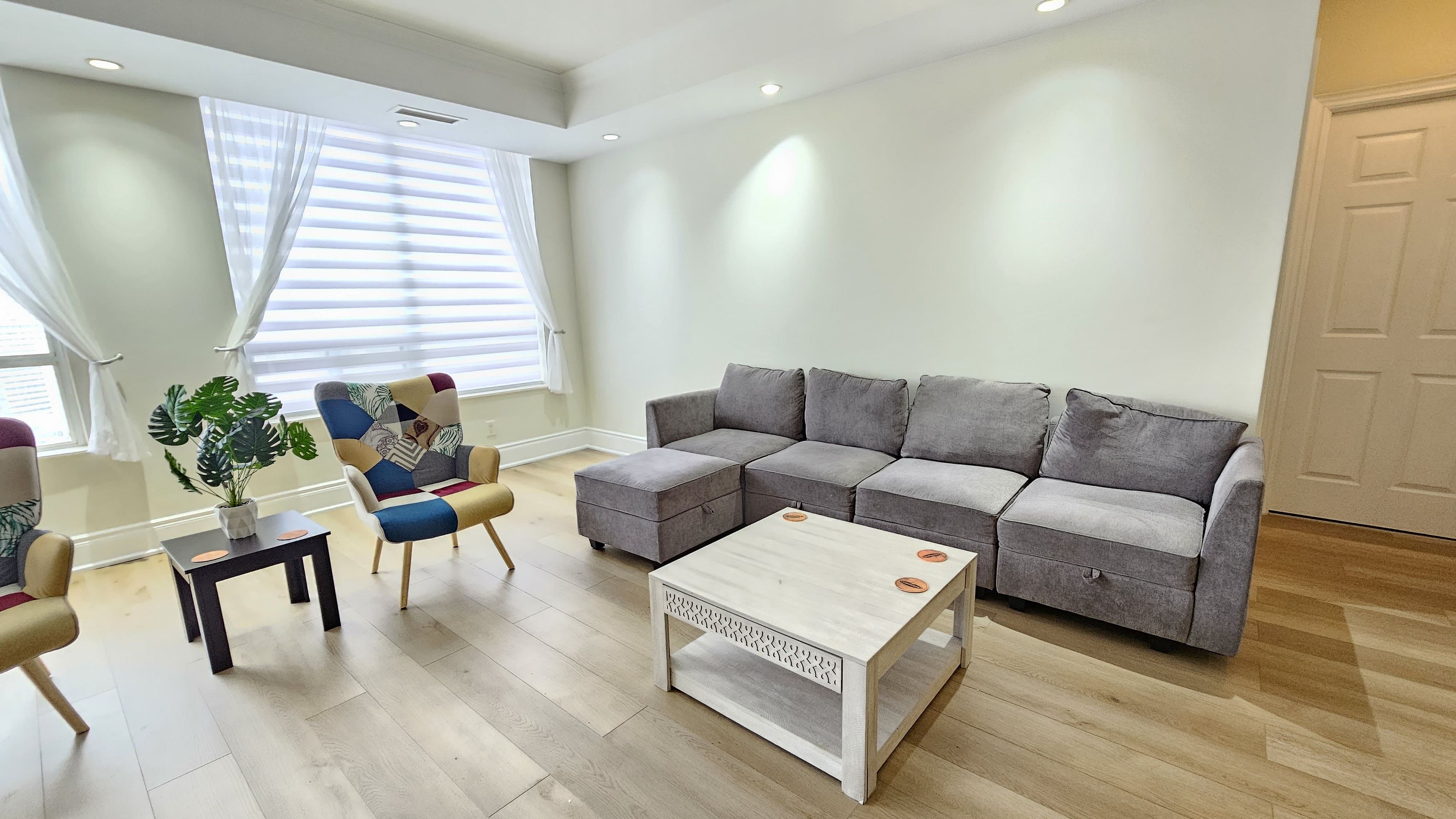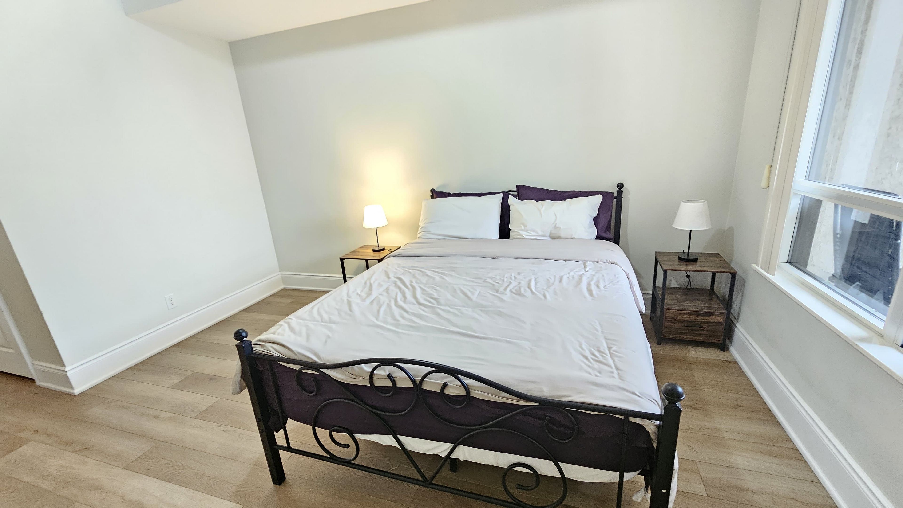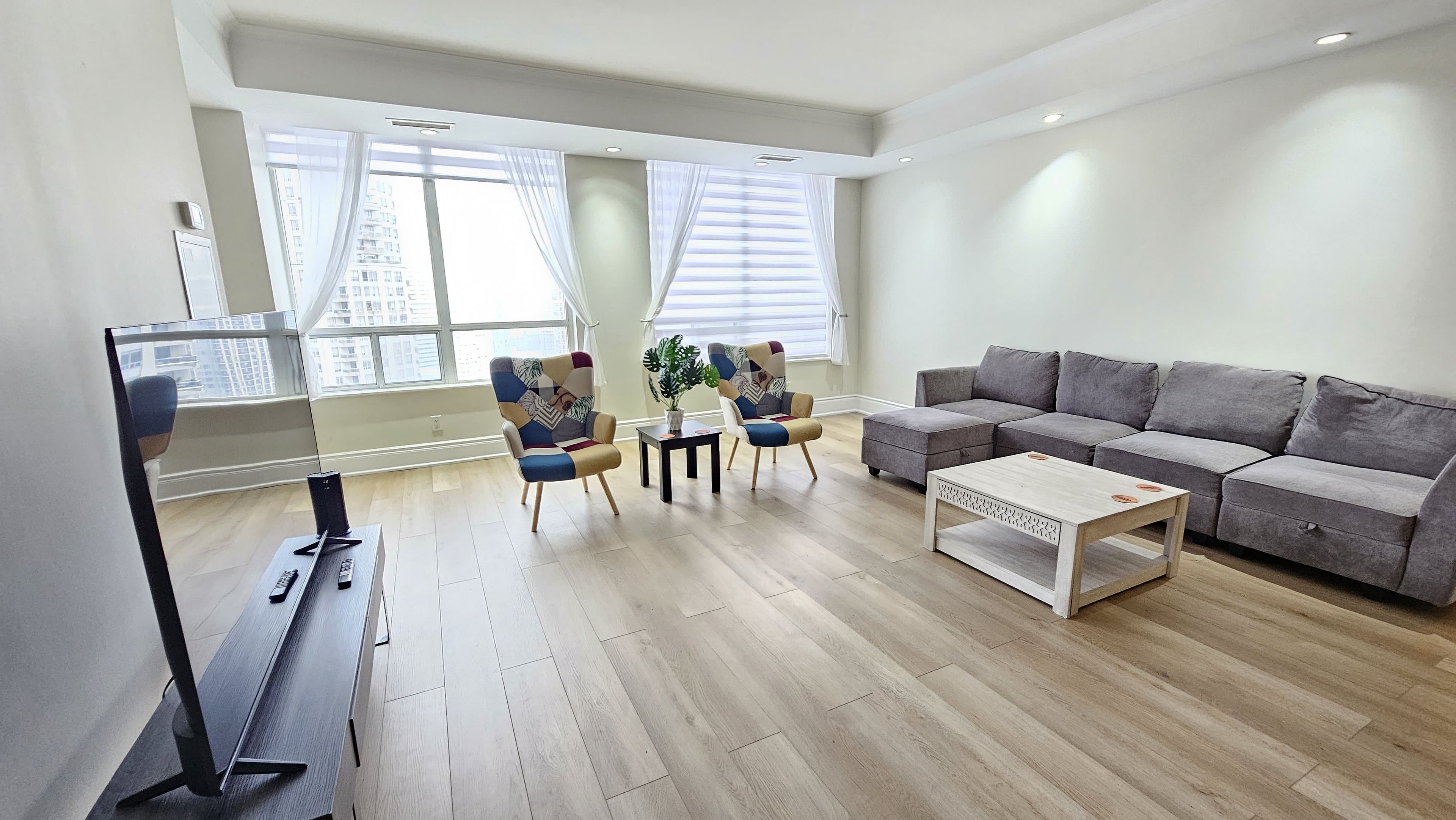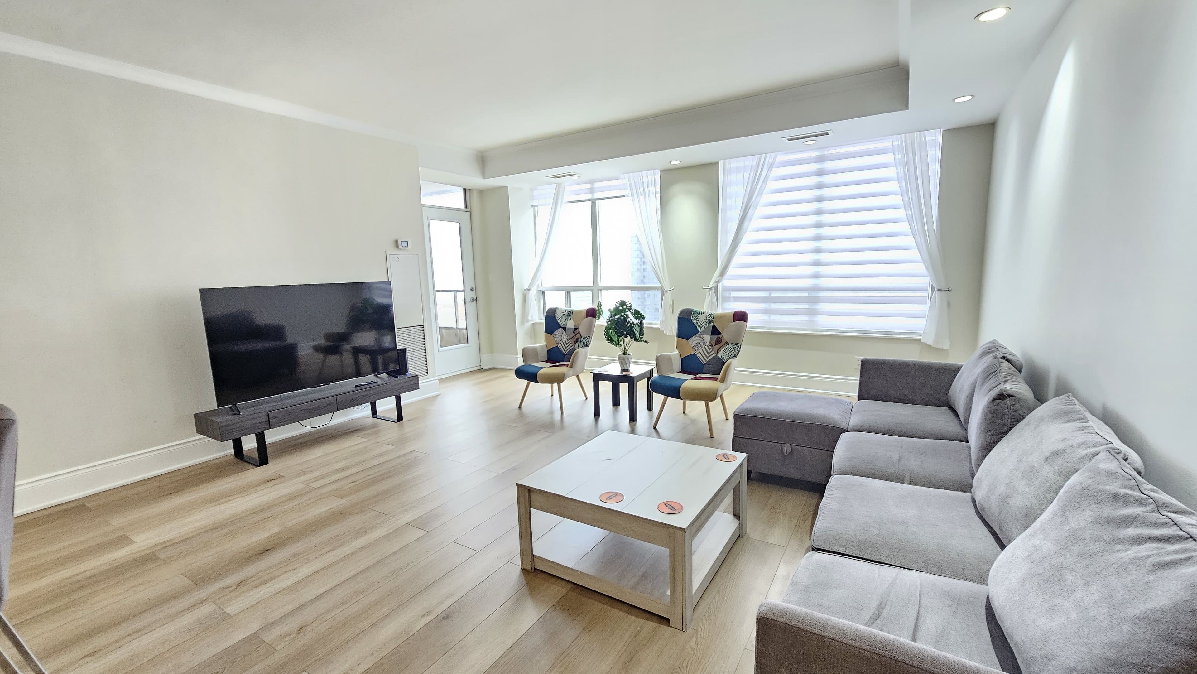 Flexible lease- 6 month or longer. Furnished. Beautiful 2+1 bedroom (den can be used as a 3rd bedroom), 2 full bathroom condo offering over 1,200 sq. Ft. Of bright, open living space. Features an oversized living room with a recently updated open-concept kitchen, showcasing stainless steel appliances, modern quartz countertops, and a stylish backsplash. The spacious primary bedroom includes a 4-piece ensuite, while the second bedroom is generously sized. The large, separate den with double doors provides the perfect space for a private office or a 3rd bedroom. Enjoy worry-free living - **all utilities are included** in the maintenance fees. Hardwood-style laminate flooring runs throughout the entire unit. Comes with one parking spot. The building boasts incredible amenities: 24-hour concierge, gym, indoor pool, sauna, party room, bowling alley, games room, theatre, guest suites, and outdoor bbq area. Perfectly located in the heart of downtown mississauga, steps from square one, celebration square, restaurants, parks, schools, public transit, and highway 403. A rare, move-in-ready gem that's bright, spacious, and includes everything!
