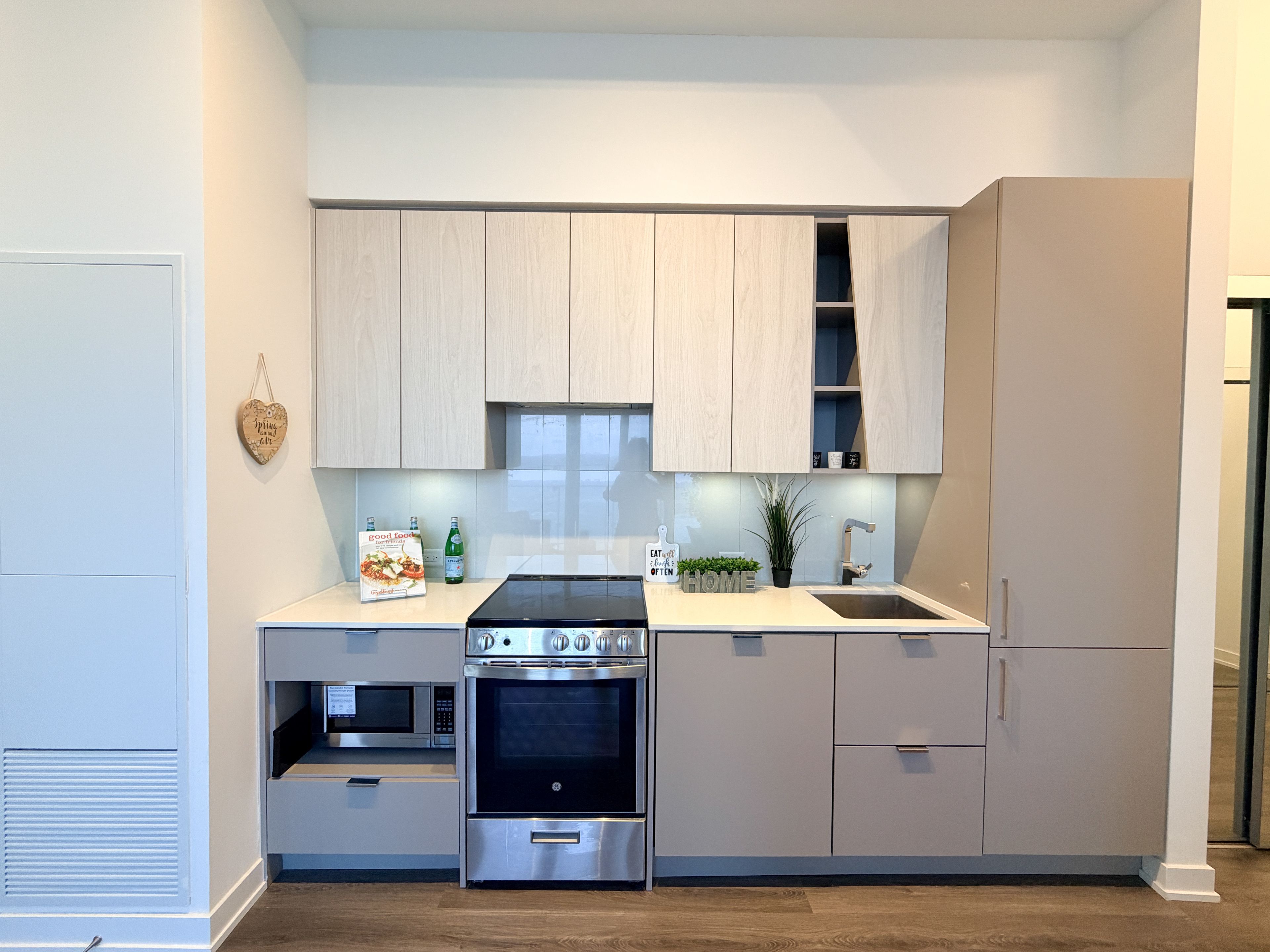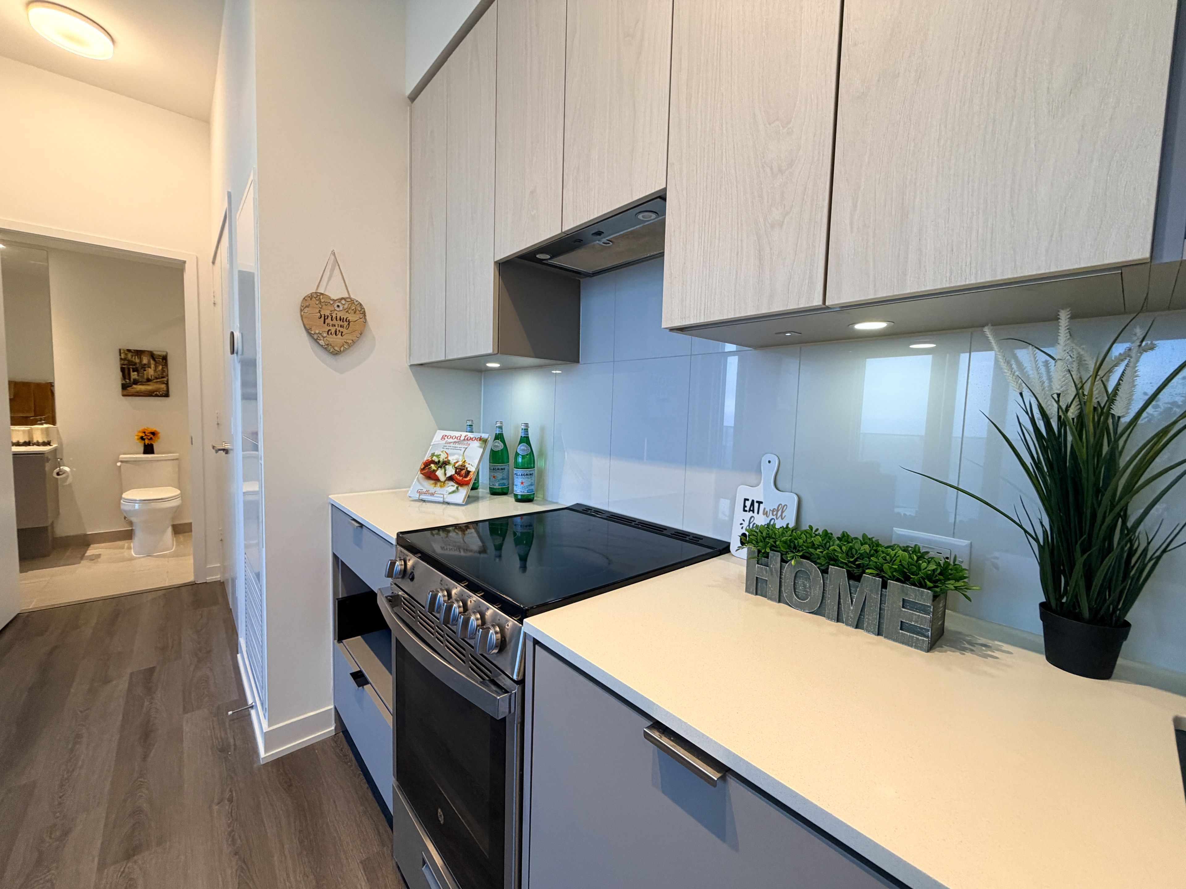 • Modern kitchen with quartz countertops and stainless steel appliances.