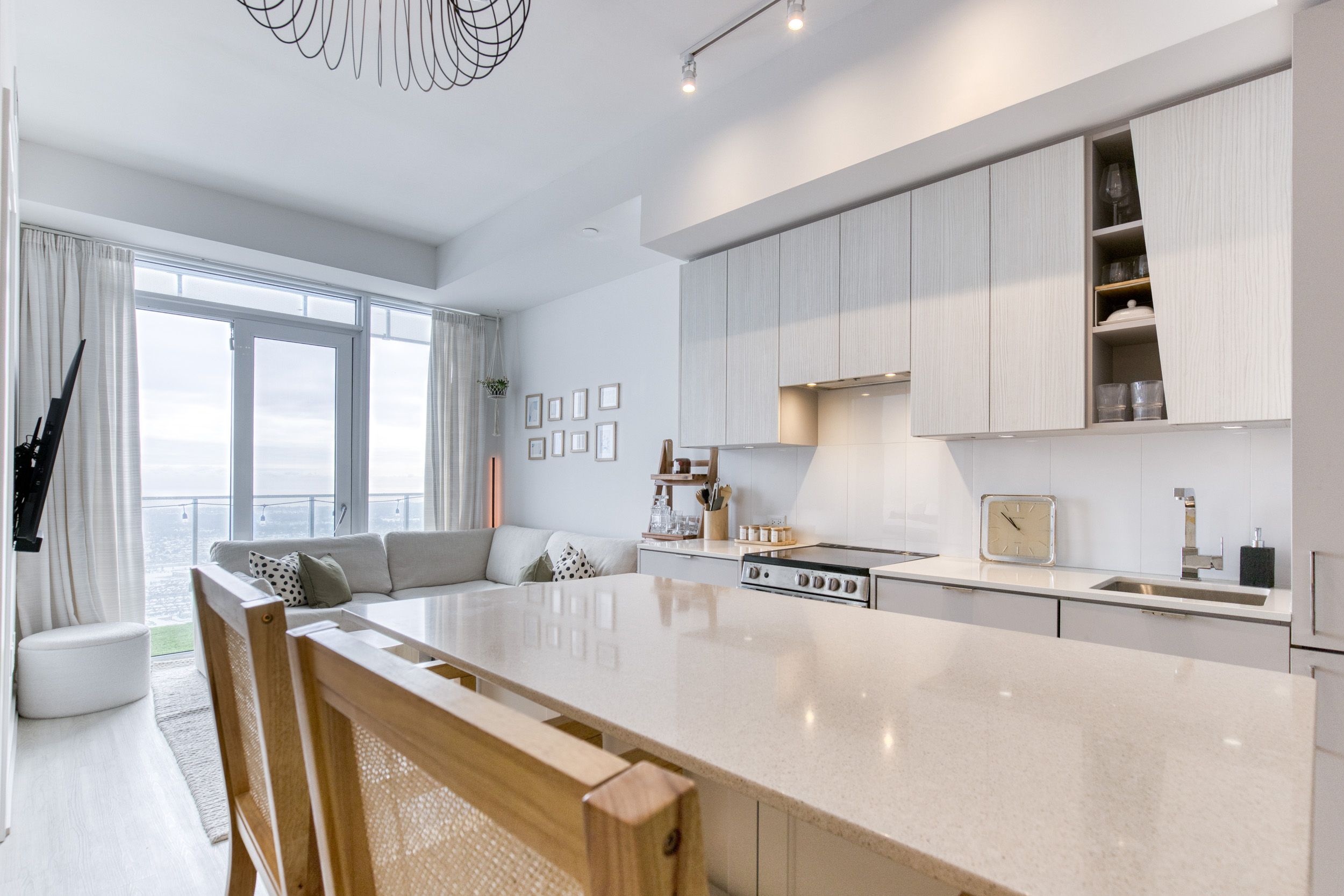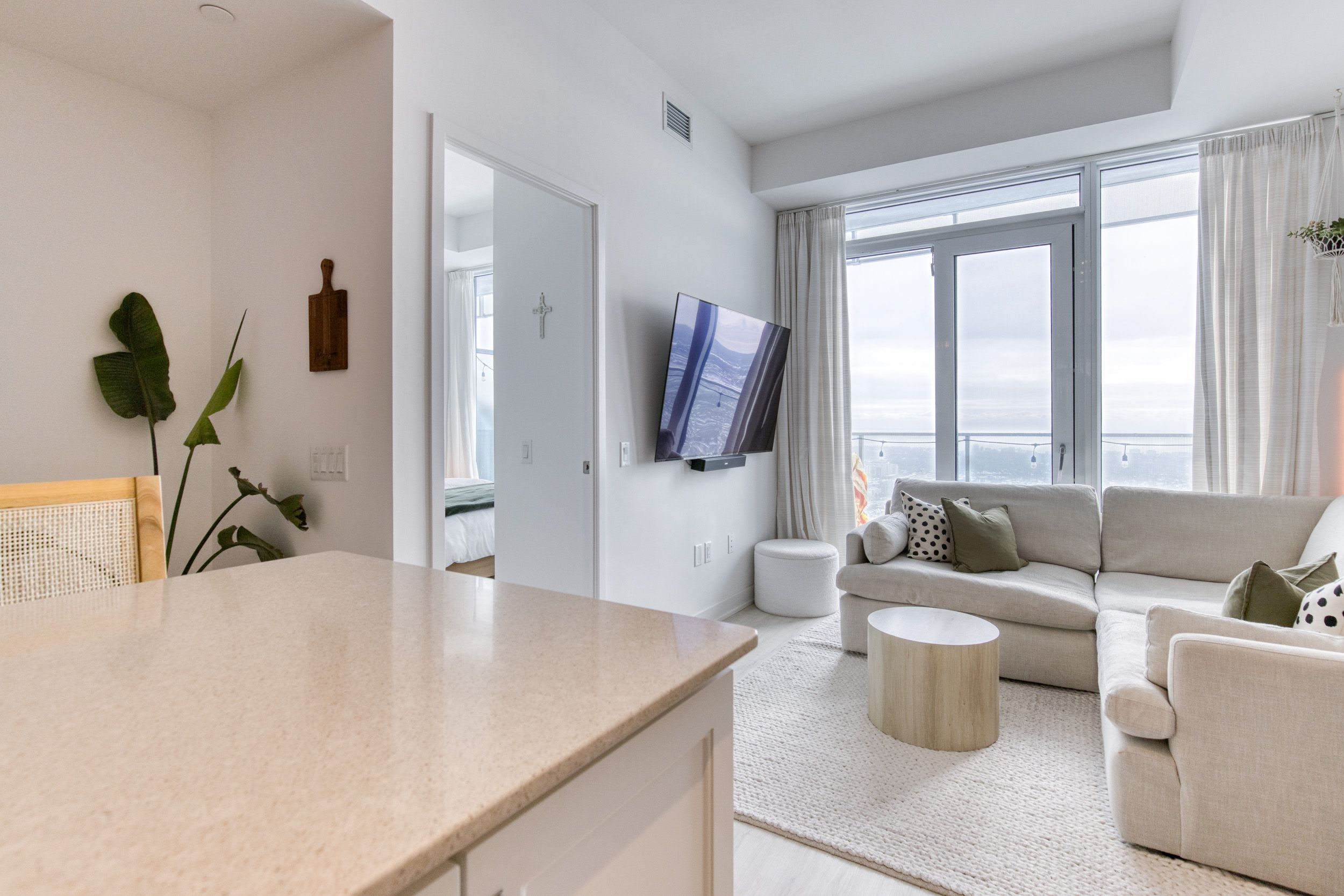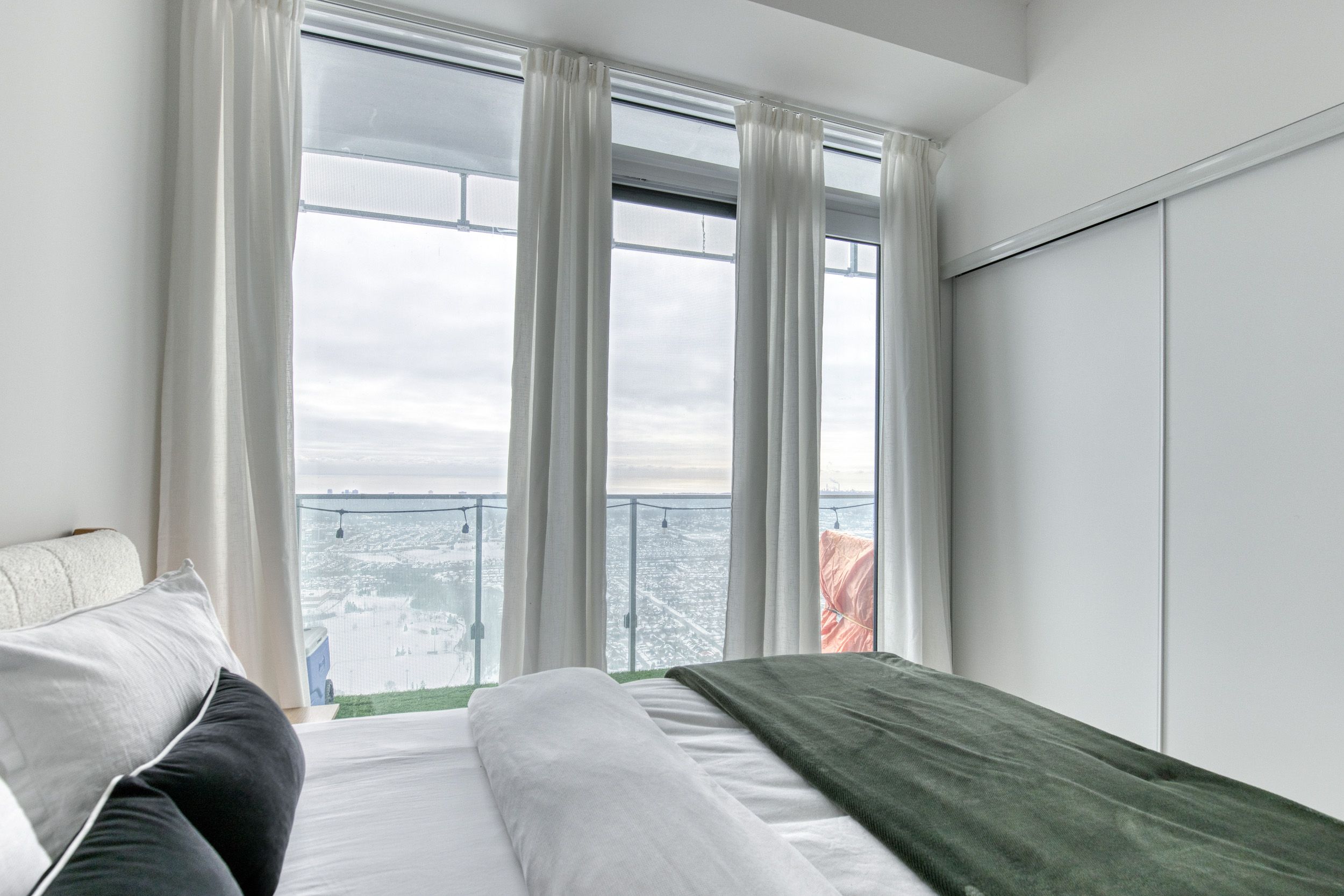 Perched high above the city on the 55th floor of the iconic m city m2, this sophisticated 2-bedroom plus media residence offers refined urban living with sweeping south-facing views. Thoughtfully designed with 9-foot ceilings and an elegant open layout, the suite spans 811 sq. Ft. Of total space, seamlessly blending 698 sq. Ft. Of interior living with an expansive 113 sq. Ft. Private balcony-perfect for enjoying sun-filled days and dramatic cityscapes. The designer kitchen showcases sleek stainless steel appliances, quartz surfaces, and contemporary cabinetry, striking a perfect balance between form and function while comfortably accommodating a dedicated dining area. The living space is framed by floor-to-ceiling windows, creating a bright, elevated atmosphere ideal for both everyday living and entertaining. The primary retreat features panoramic glazing, direct balcony access, and a spa-inspired 3-piece ensuite. A generously proportioned second bedroom is complemented by a stylish 4-piece bath. A separate media area adds flexibility, ideal for a private home office or curated work-from-home space. Residents of m city m2 enjoy an exceptional lifestyle with world-class amenities, including an outdoor saltwater pool, yoga and fitness studios, steam room, resident lounges, skating rink, splash pad, and thoughtfully designed family spaces. Situated in the heart of mississauga's vibrant downtown core, just steps to square one, go transit, celebration square, premier dining, cultural venues, parks, post-secondary institutions, and the upcoming lrt. Includes one parking space, one locker, high-speed internet, and a smart home monitoring system.