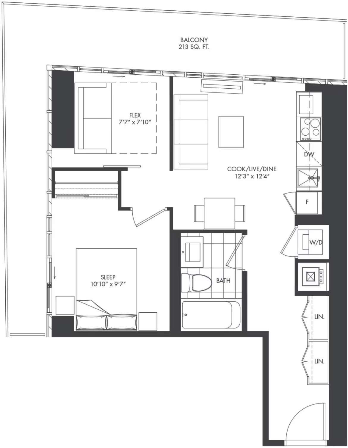 • Stylish 1-bedroom condo with a rare enclosed den for versatile use.