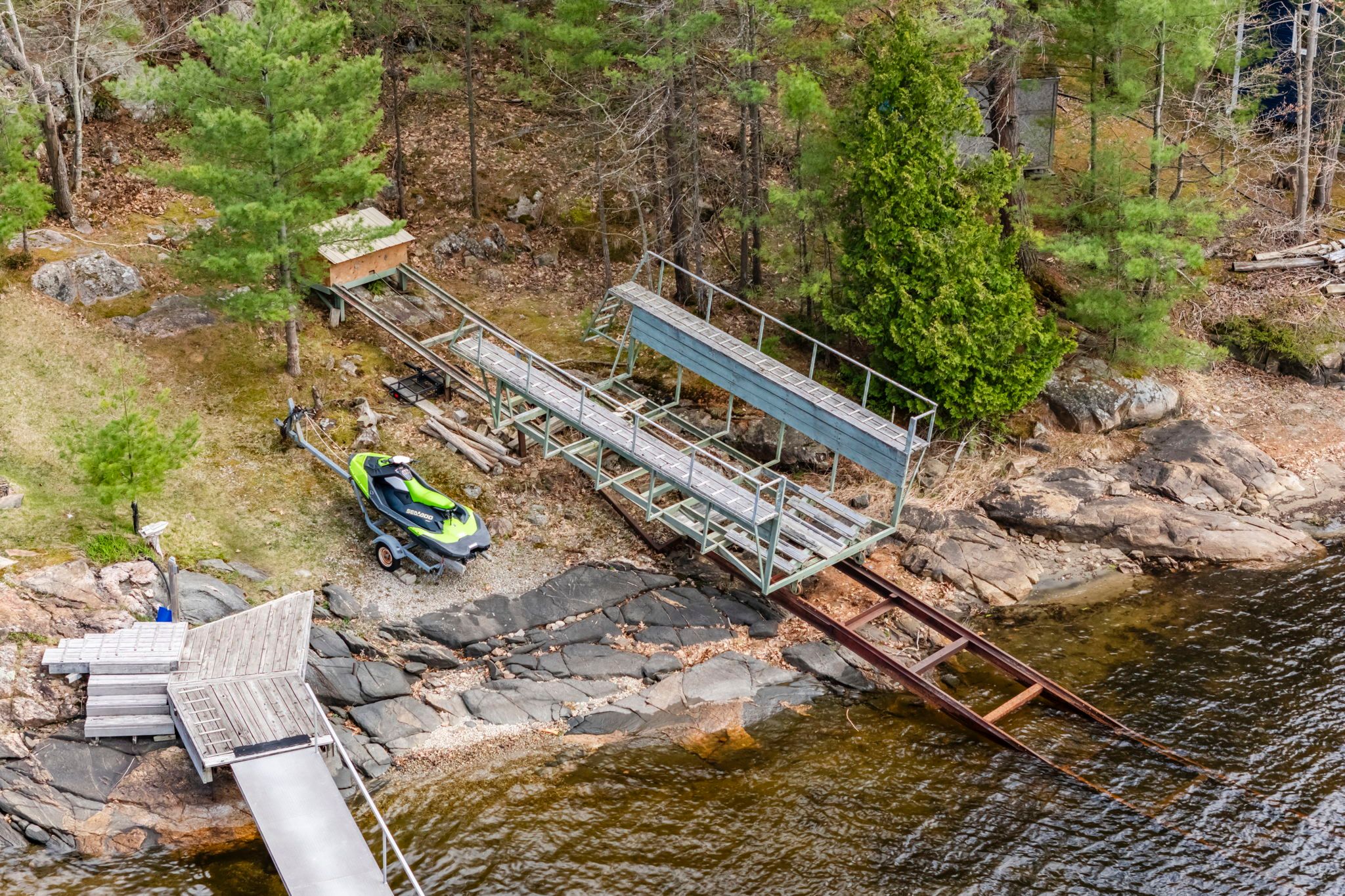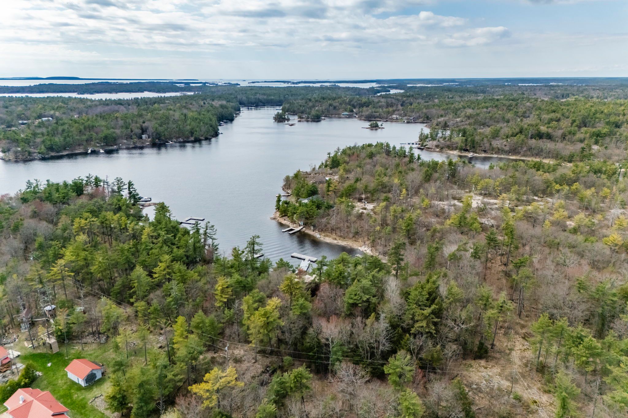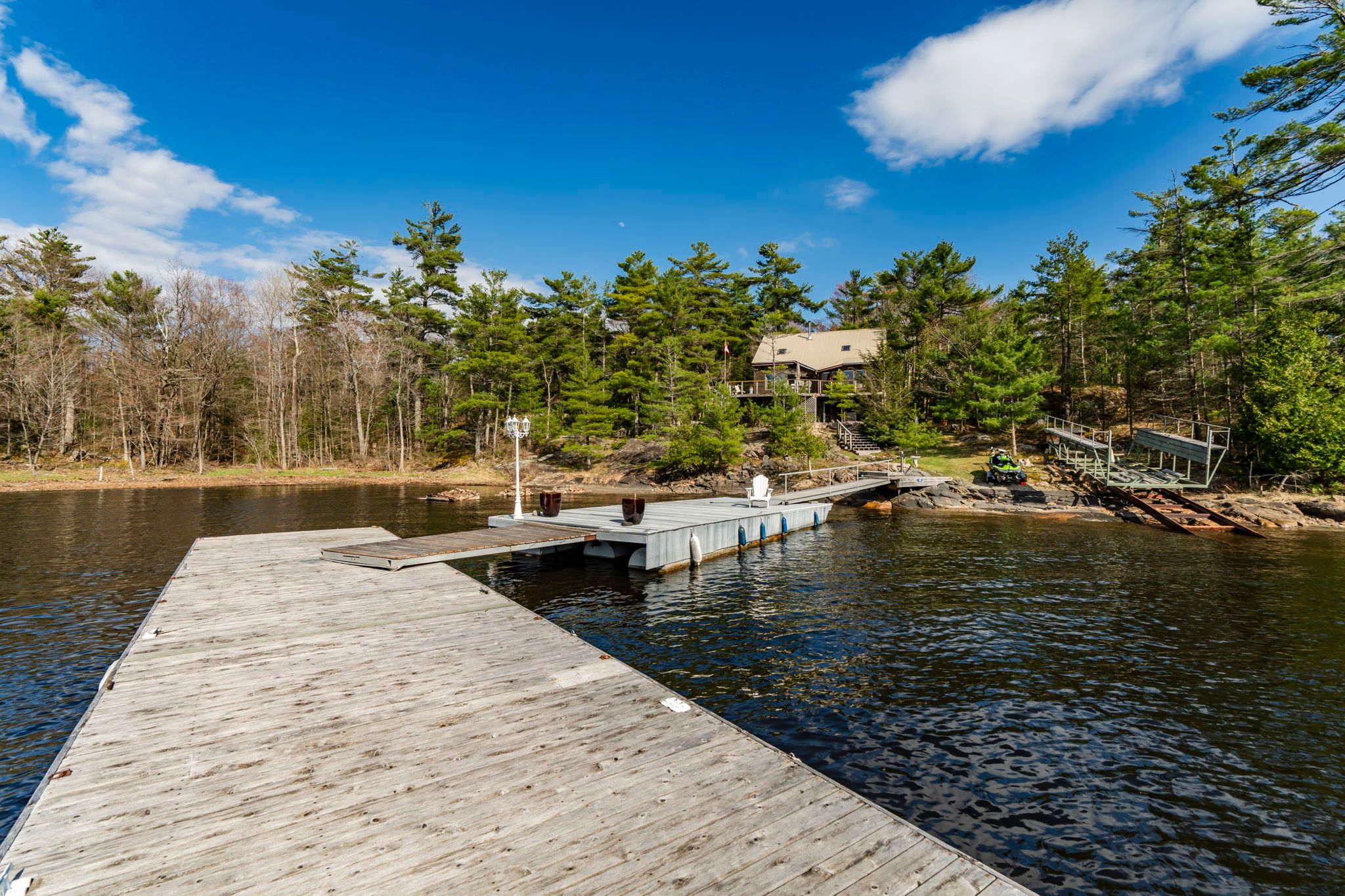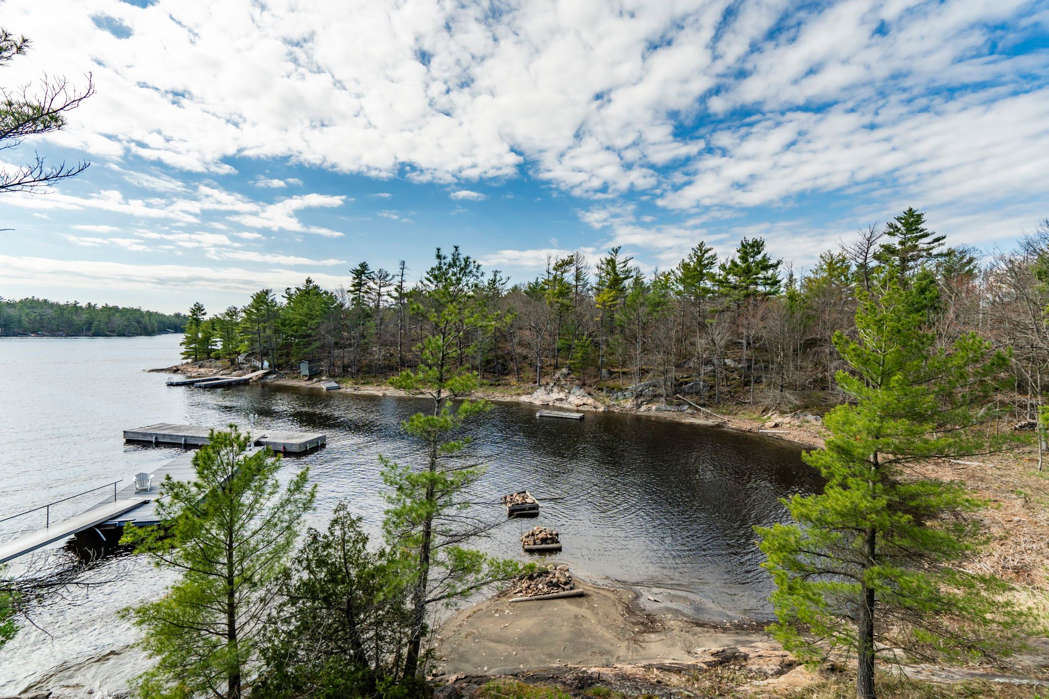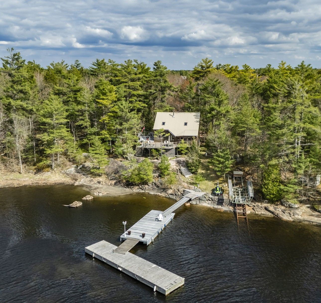 Only a 2 minute boat ride from central honey harbour, this mermaid island getaway is perched on a large 3. 6 acre lot with 571 feet of water frontage. The natural, rocky shoreline slowly gives way to deeper water, allowing for swimming and boating in georgian bays pristine waters. Follow the path from the large dock, along the quintessential canadian shield landscape to the cozy home/cottage with a cedar deck on the west side, and a composite deck on the east side, both perfect for relaxing and soaking up the sun. Inside, enjoy the open concept layout with vaulted ceilings, wood finishes and plenty of natural light with large windows and a skylight. A free-standing wood stove will keep you cozy on those cooler nights, while the ceiling fans will keep you cool on hotter days. There is plenty of space for family and friends with 2 bedrooms and 1 bathroom on the main floor and 2 additional sleeping quarters with bathroom in the loft.
