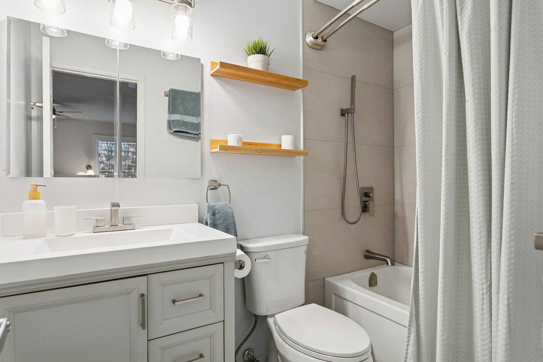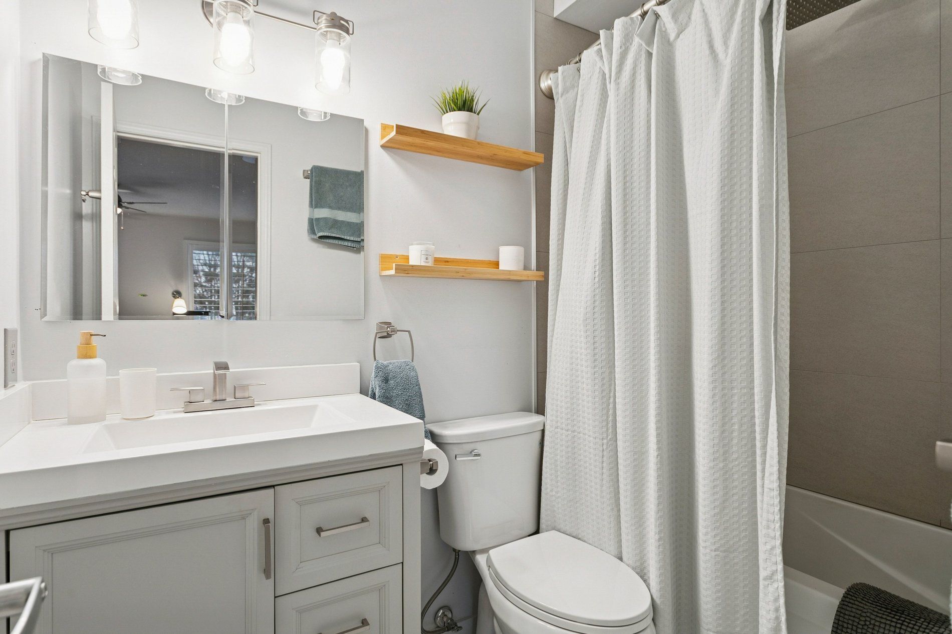 • Three spacious bedrooms with updated bathrooms and newer carpeting.