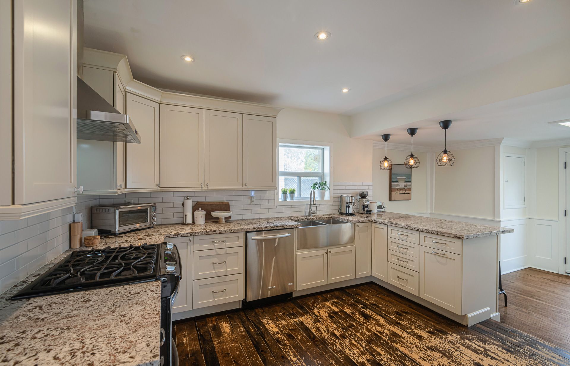 • Chef's kitchen with modern appliances and breakfast bar.
