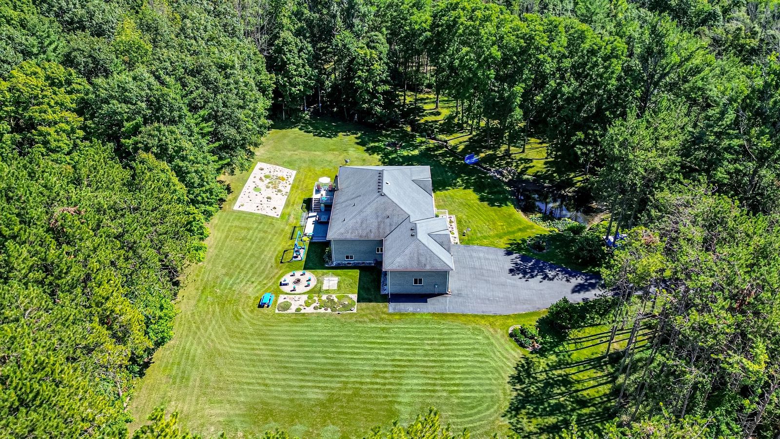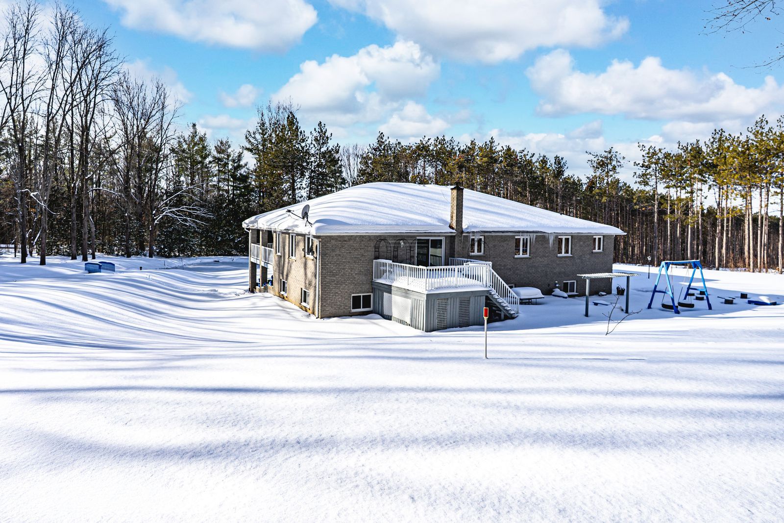 25 acre quality-built estate with over 4,600 sq ft, walkout basement, triple garage & extensive outdoor living! Set on 25 acres with forest, gardens, a pond with a deck, and a flowing stream, this custom-built brick bungalow feels like the place you didn't know you were searching for. Private trails stretch across the property for walking, biking, snowshoeing, and cross-country skiing, while outdoor adventure continues nearby with access to golf courses, snowmobile trails, boat launches, beaches, horseshoe valley, vetta nordic spa, and bass lake provincial park. Outdoor living takes centre stage with two large covered porches, a sun-filled entertaining deck, a fire pit, and multiple open spaces designed for use and enjoyment year-round, complemented by a triple-car garage and an oversized driveway offering generous room for vehicles and toys. Built with quality craftsmanship, strong energy efficiency, and clear pride of ownership, the home offers over 4,600 sq ft of finished living space across a thoughtful layout. A dramatic wall of windows anchors the living room with pond and garden views, flowing into a formal dining room and a bright family room with a covered porch walkout. The kitchen includes quartz countertops, pantry storage, stainless steel appliances, and a walkout to the deck, while a separate den provides flexible space for a home office, studio, or media room. When it's time to unwind, the primary suite offers a walk-in closet and private 3-piece ensuite, with two additional bedrooms served by a 4-piece main bath. The walkout lower level with in-law potential adds a 4th bedroom, a den with patio access, a spacious recreation room with a wood stove, workshop and gym areas, a 3-piece bath, and cold storage. Additional highlights include a hot tub, pool table, owned water heater, water purification system, shingles updated in 2014, and enhanced attic insulation. This is the kind of #hometostay that changes what you think you're looking for.